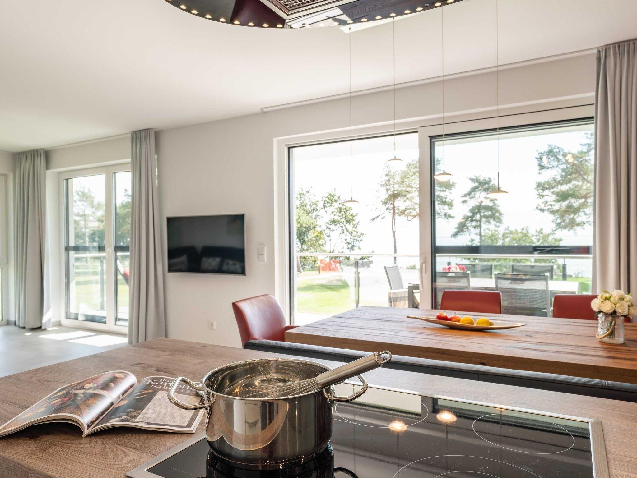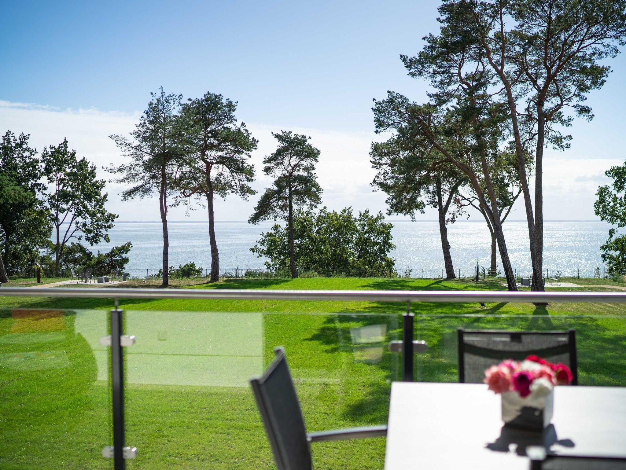 Schöne Ferienappartements, hochwertig ausgestattet im modernen Einrichtungsstil mit Terrassen auf ganzer Appartementbreite, bieten einen wunderschönen Blick auf das direkt vor uns gelegene Stettiner Haff. Erleben Sie die Sonne über dem Wasser vom Aufgehen bis zum Untergehen. Die funkelnden Wassersterne werden Sie entzücken.