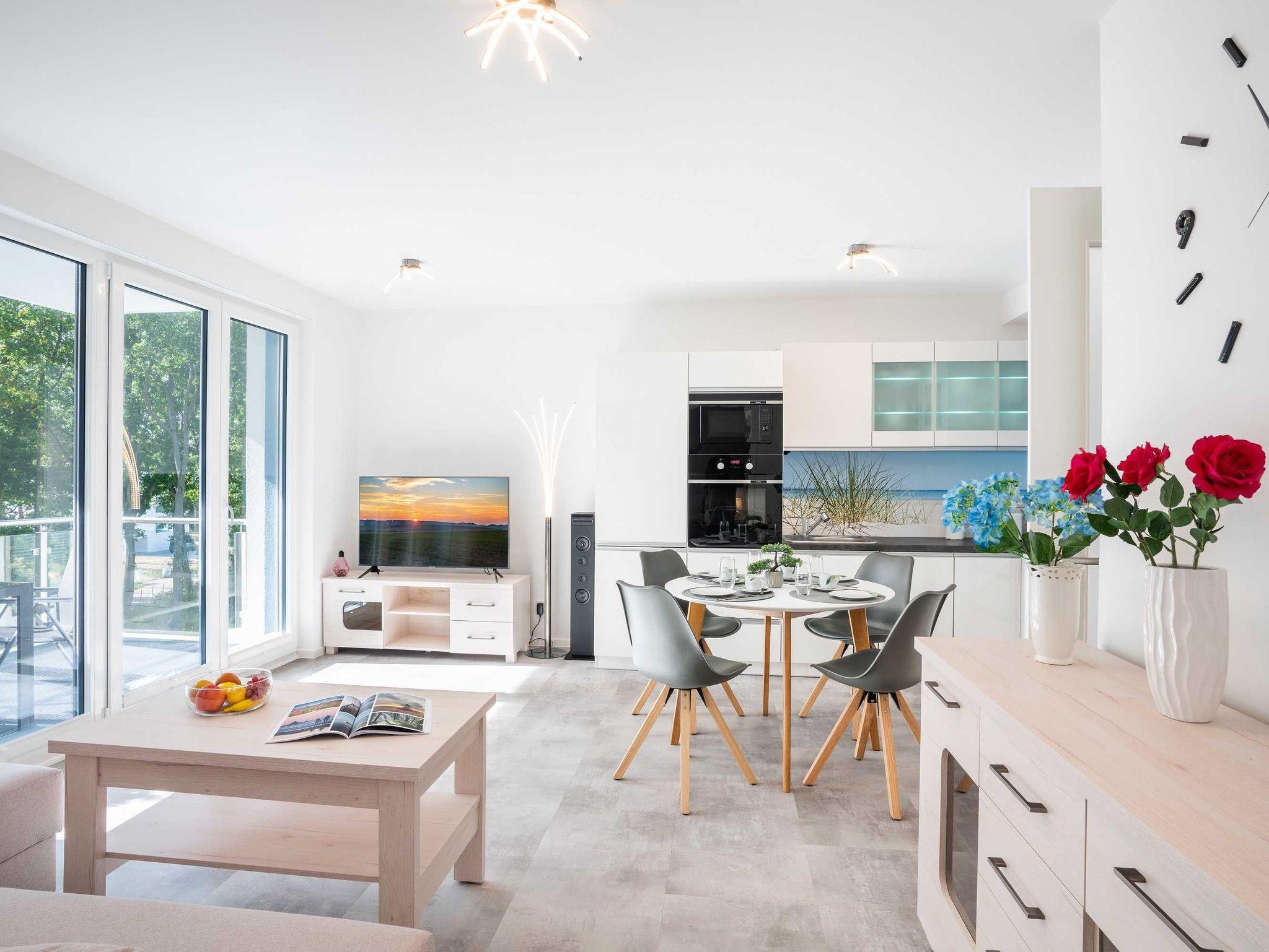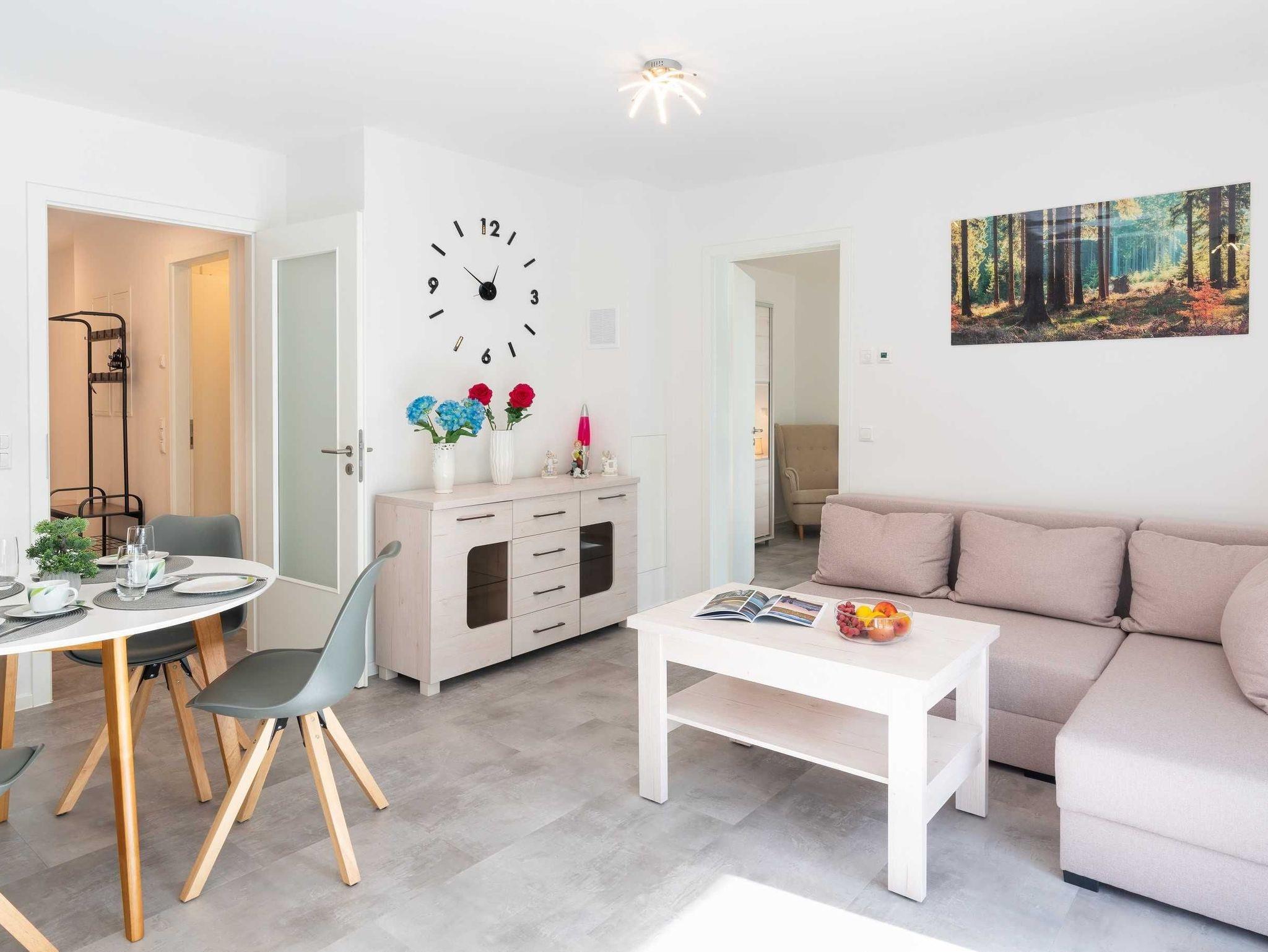 Auf einer Wohnfläche von 65 m² finden drei Erwachsene und ein Kleinkind bis zwei Jahre (im Babybett) in dieser modern eingerichteten Ferienwohnung ausreichend Platz für einen entspannten Urlaub am Stettiner Haff auf Usedom.