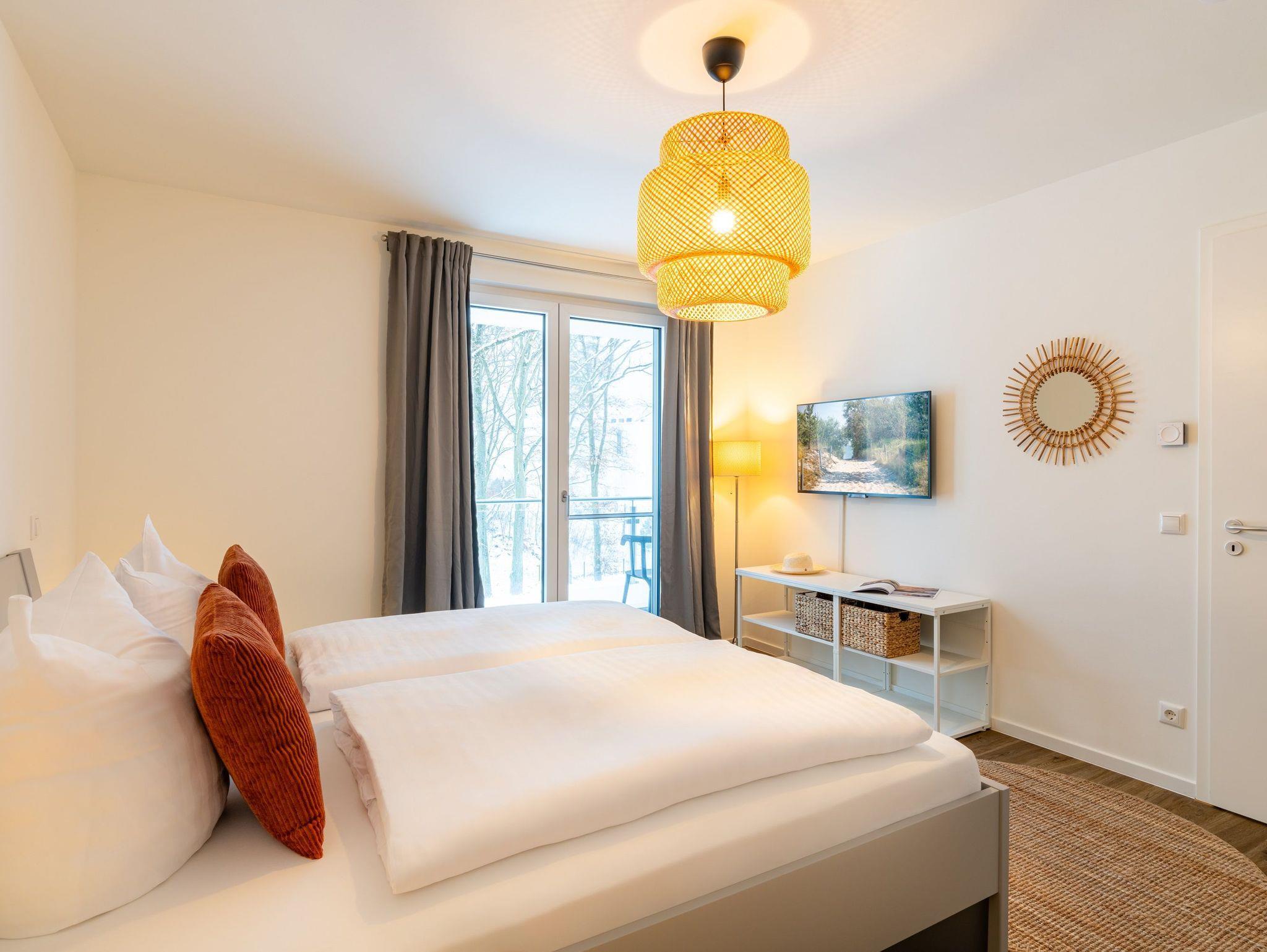 Erholsamer Schlaf ist im hochwertigen Doppelbett (180 x 200 cm) mit einem weiteren Smart-TV garantiert. Vom Schlafzimmer aus haben Sie eine weitere Zugangsmöglichkeit zum Sonnenbalkon. Das Schlafsofa im Wohnzimmer kann im Handumdrehen zu einem Bett umfunktioniert werden (Liegefläche 160 x 200 cm mit Boxspring-Unterfederung). Für einen angenehmen Schlafkomfort wird ein Topper als Schlafunterlage zur Verfügung gestellt.