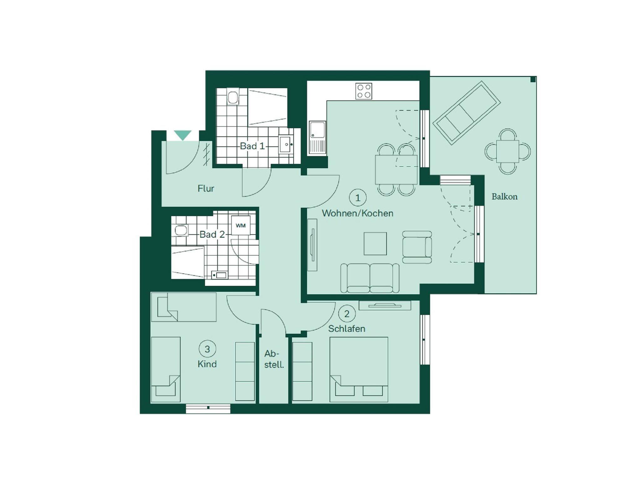 Die beiden vollausgestatteten Badezimmer verfügen jeweils über eine ebenerdige Dusche, WC, Waschtischanlage sowie Fön.