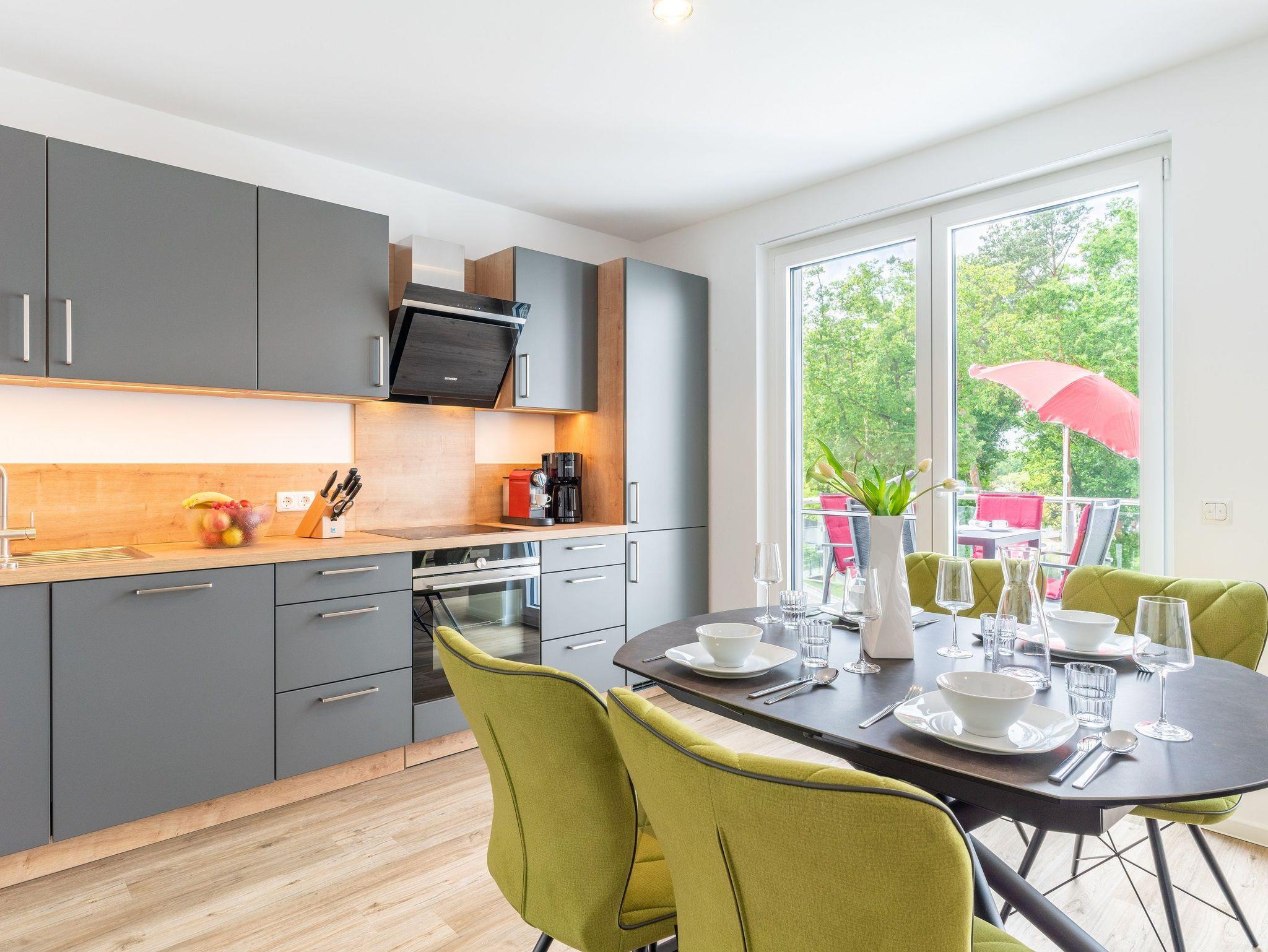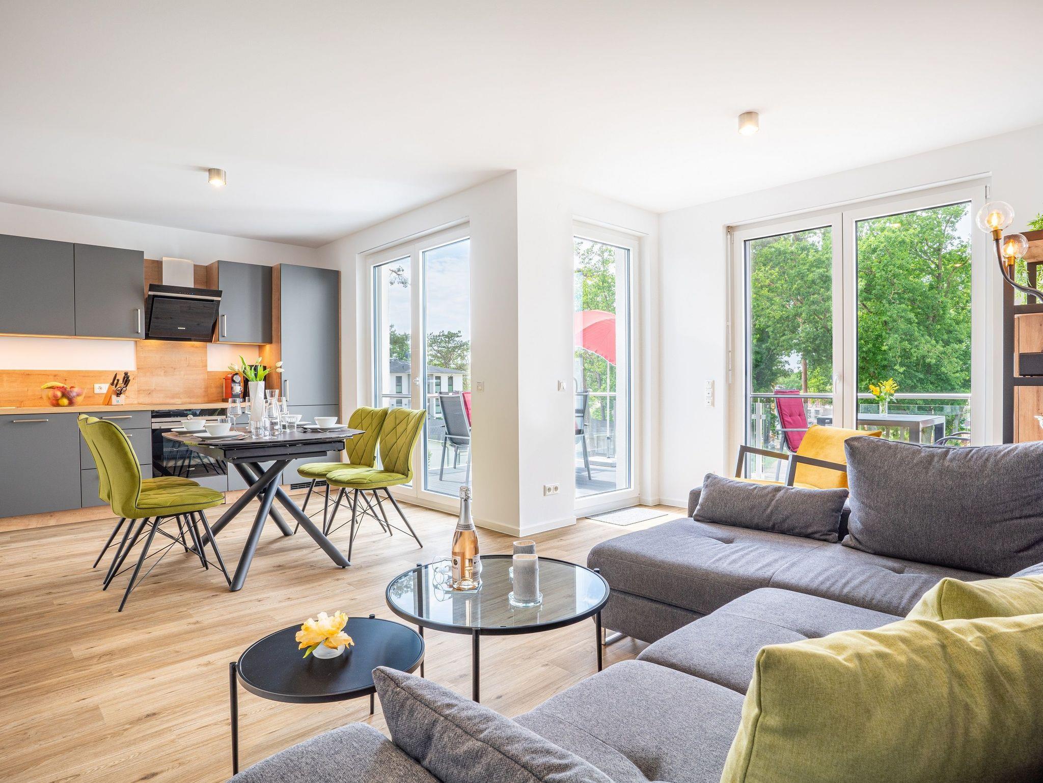 Der offen gestaltete Wohnbereich ist mit einem ausziehbaren Eck-Sofa, Smart-TV sowie einem Internetradio ausgestattet. Sie haben vom Wohnzimmer aus Zugang zum Südwest-Balkon. Der möblierte Balkon mit traumhaften Ausblicken auf das Stettiner Haff bietet auch aus der zweiten Reihe einen wunderschönen Ort, um Ihre Mahlzeiten zu genießen und die Aussicht zu bewundern.