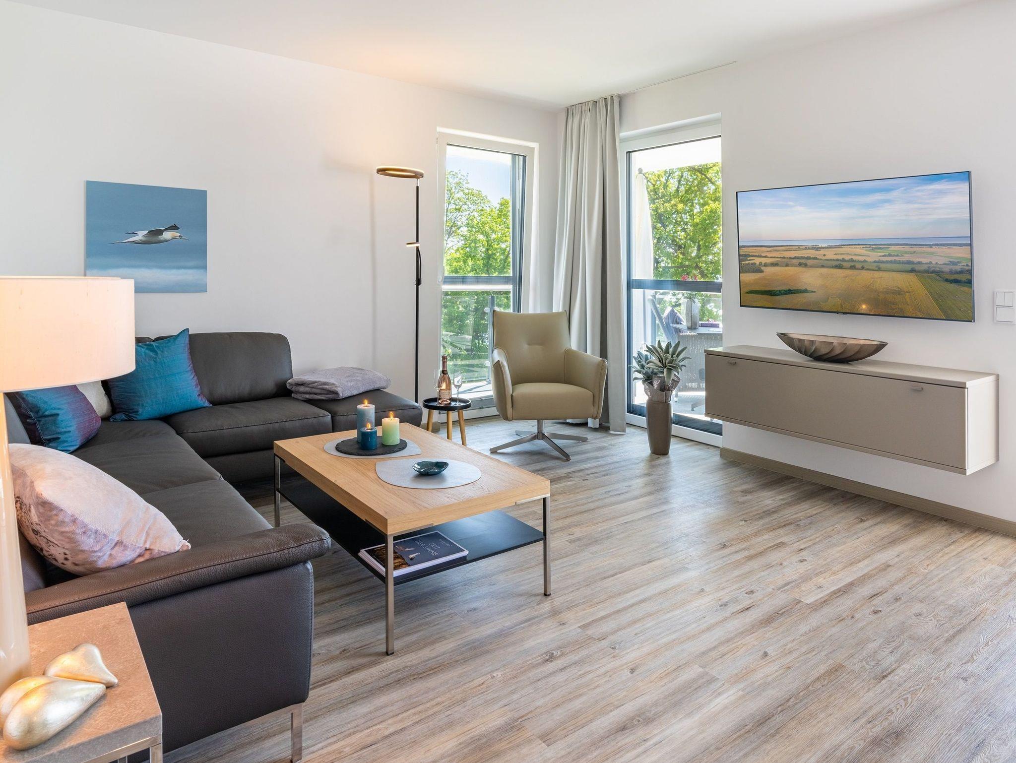 Diese im Jahr 2024 fertiggestellte Ferienwohnung verfügt über eine Wohnfläche von 106 m² und befindet sich im Haus 8, das etwa 400 Meter von den anderen „Oase am Haff“-Häusern entfernt auf einem separaten Grundstück in gleicher Südlage liegt.