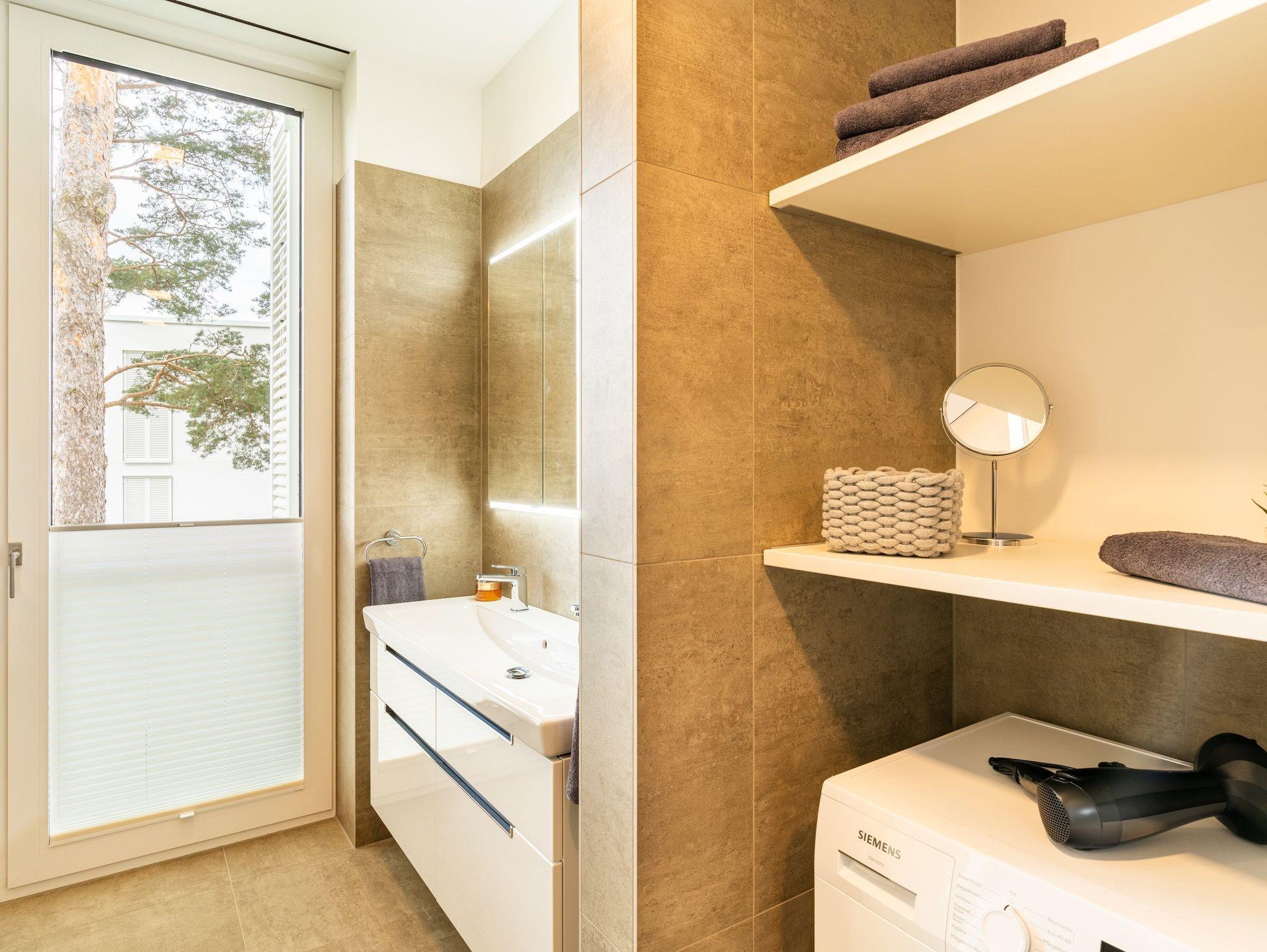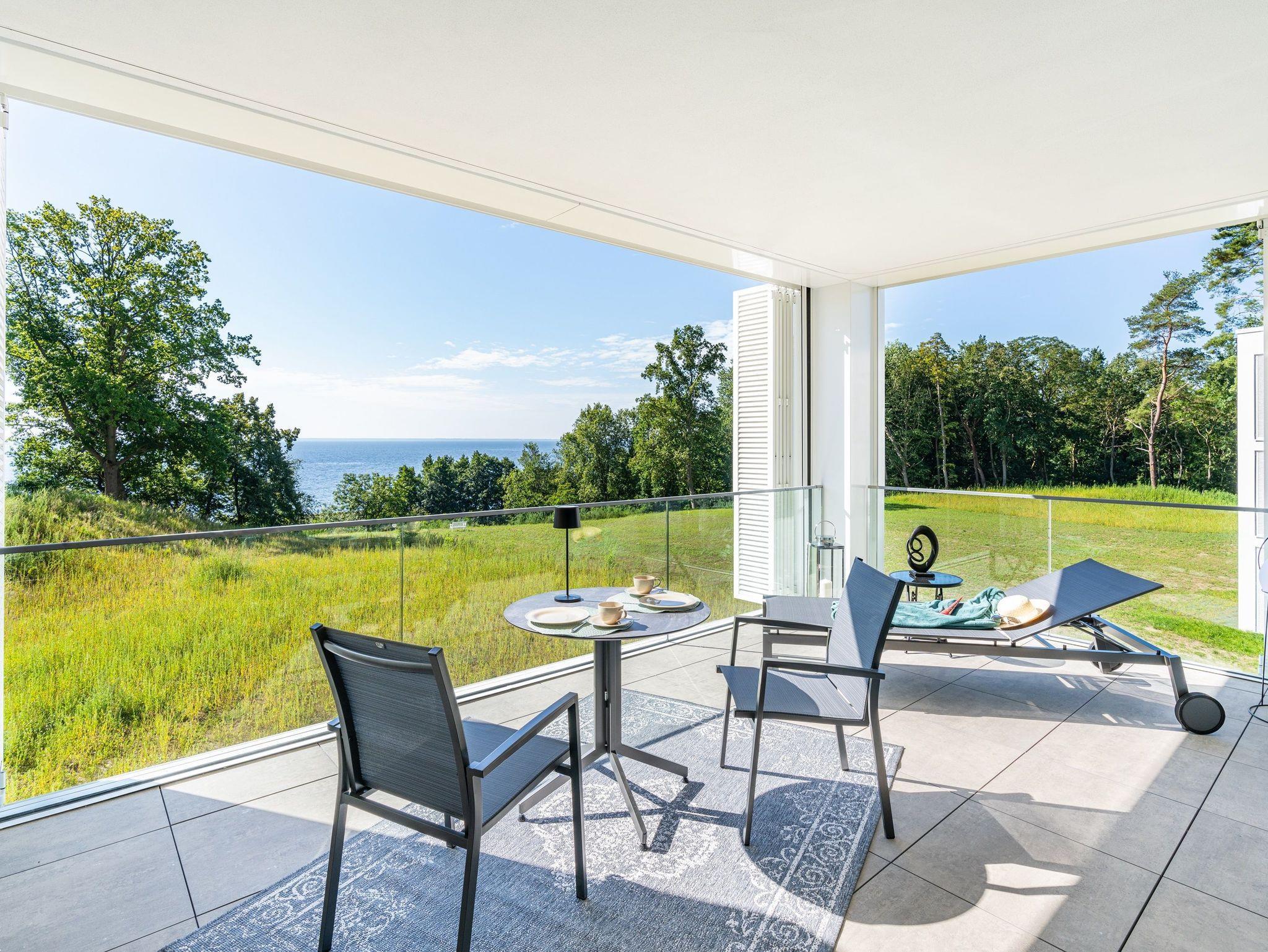 Das barrierefreie, in 2023/24 erbaute Apartment mit 109 qm mit Lanai und Haffblick im ersten Obergeschoss verfügt über kostenfreies WLAN, zwei Schlafzimmer (Platz für vier Personen plus Kleinkind im Babybett), ein Wohnzimmer, drei internetfähige Flachbild-TVs, eine voll-ausgestattete Küche mit Kühl- und Gefrierschrank, Backofen und Mikrowelle sowie Weinkühlschrank. Im Hauptschlafzimmer steht ein großes Doppelbett (180 x 200 cm), während das andere Schlafzimmer ein Schlafsofa mit einer vollwertigen Federkernmatratze (160 x 200 cm) bietet. Die beiden Badezimmer sind mit einer ebenerdigen Dusche ausgestattet, ein Badezimmer ist im en Suite-Style. Zusätzlich befindet sich auf dem Balkon mit idealer Süd-Ausrichtung eine eigene private Sauna. Handtücher und Bettwäsche sind im Preis enthalten, ebenso die Nutzung einer wohnungseigenen Waschmaschine. Zudem wird ein Sauna-Set mit kuscheligem Bademantel sowie einem Saunahandtuch angeboten.
