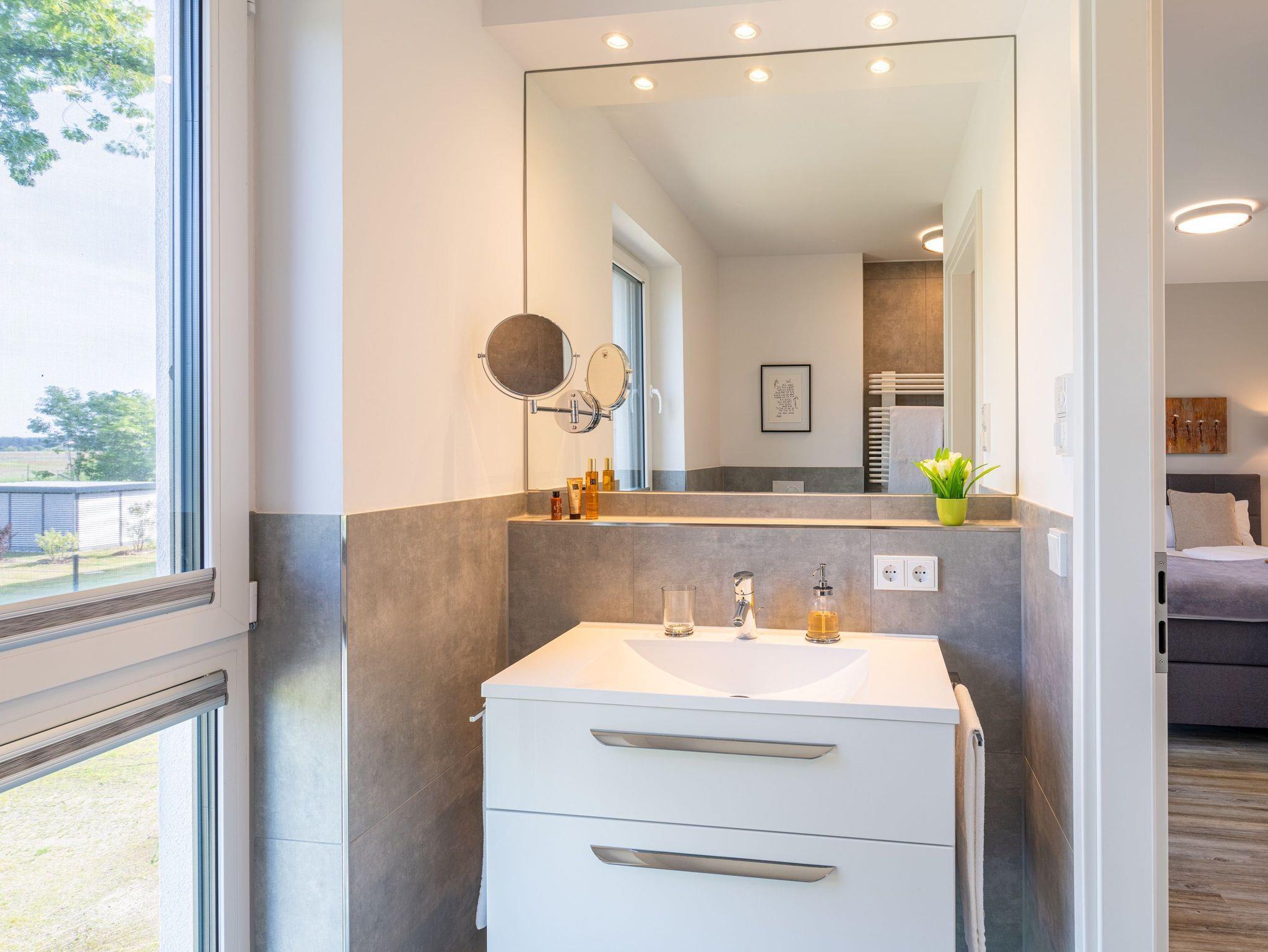 Diese im Jahr 2024 fertiggestellte Ferienwohnung verfügt über eine Wohnfläche von 115 m² und befindet sich im Haus 8, das etwa 400 Meter von den anderen „Oase am Haff“-Häusern entfernt auf einem separaten Grundstück in gleicher Südlage liegt.