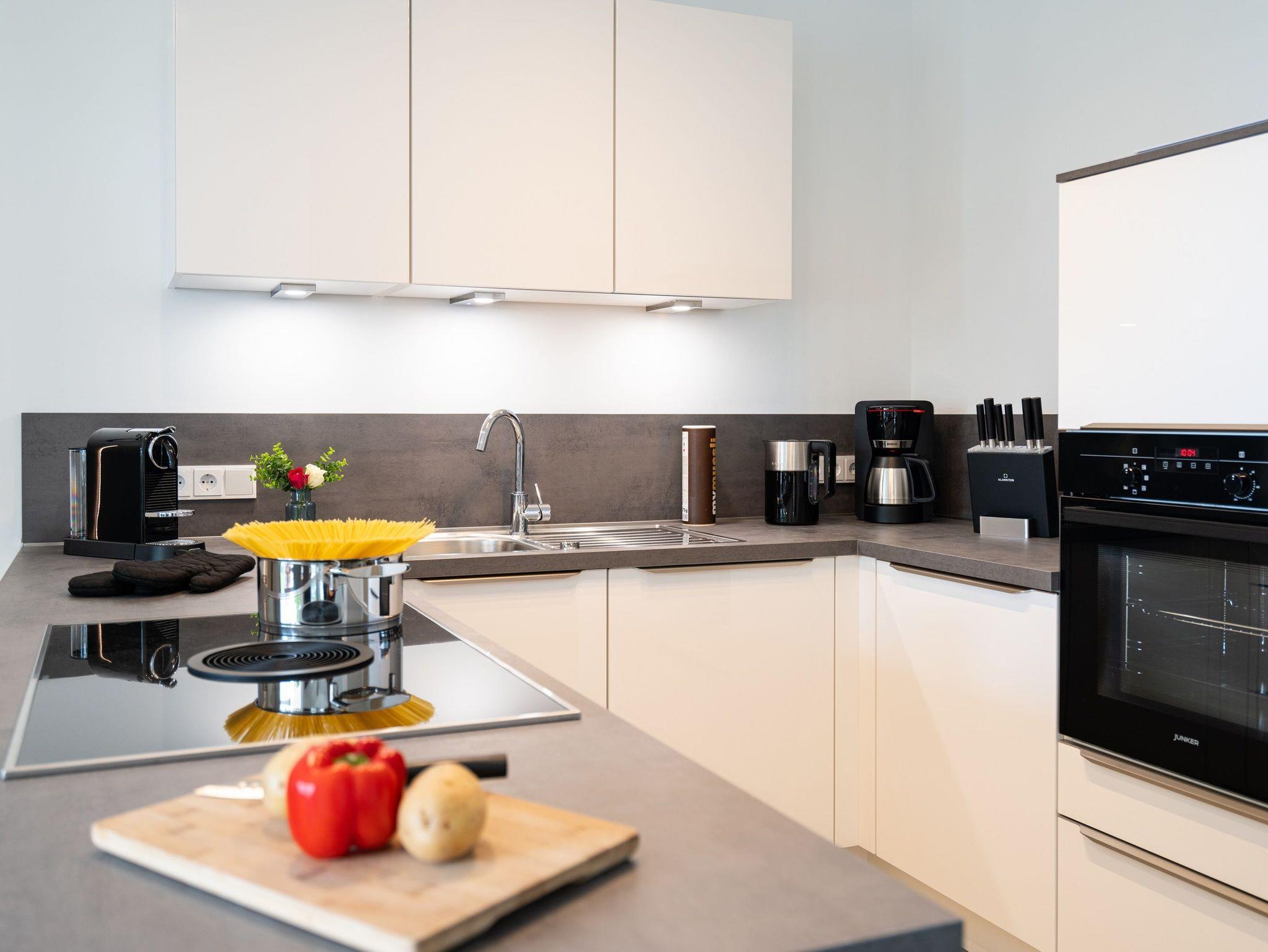 Die weiße Hochglanzküche von Nobilia ist umfassend ausgestattet mit schönem Porzellan, Kochgeschirr und allen notwendigen Küchenutensilien. Sie finden hier einen großen Kühlschrank mit separatem Gefrierfach, einen Backofen in Sichthöhe, eine Spülmaschine, eine Filterkaffeemaschine, einen Milchschäumer, eine Nespresso-Kapselmaschine, einen Toaster und einen Wasserkocher, sowie vieles mehr.