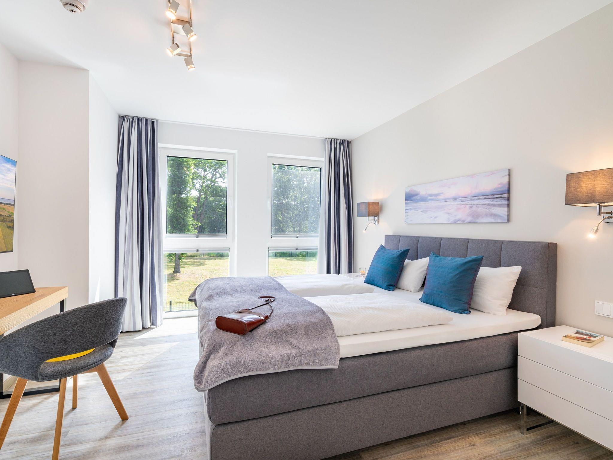 Im zweiten Schlafzimmer finden Sie ebenfalls ein komfortables Boxspringbett (180 x 200 cm), einen Kleiderschrank, einen Schreibtisch und einen Smart-TV vor.