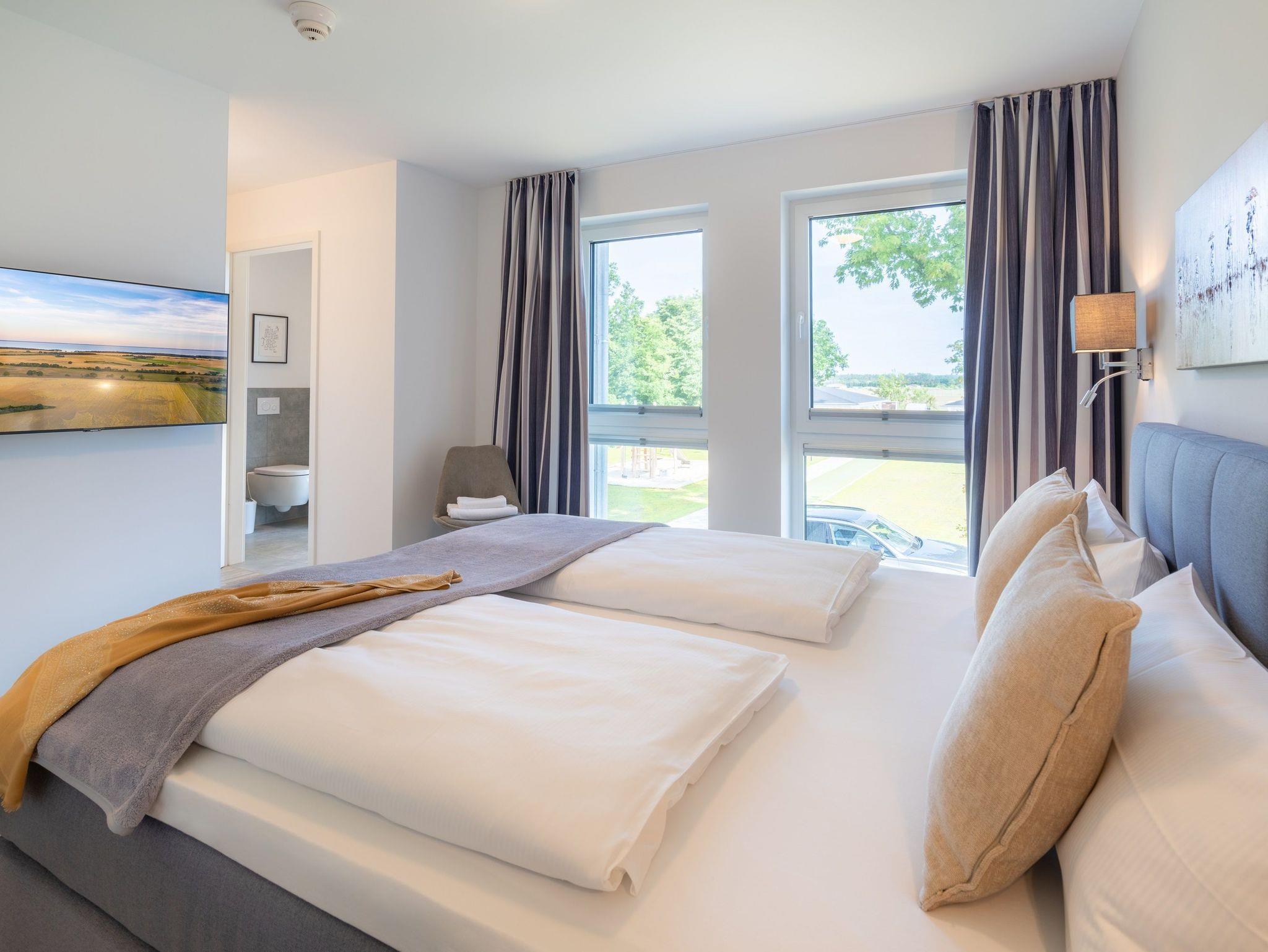 Das Hauptschlafzimmer bietet ein hochwertiges Boxspringbett (180 x 200 cm), einen Kleiderschrank sowie einen Smart-TV. Das en suite Badezimmer mit begehbarer Dusche rundet den Komfort ab.