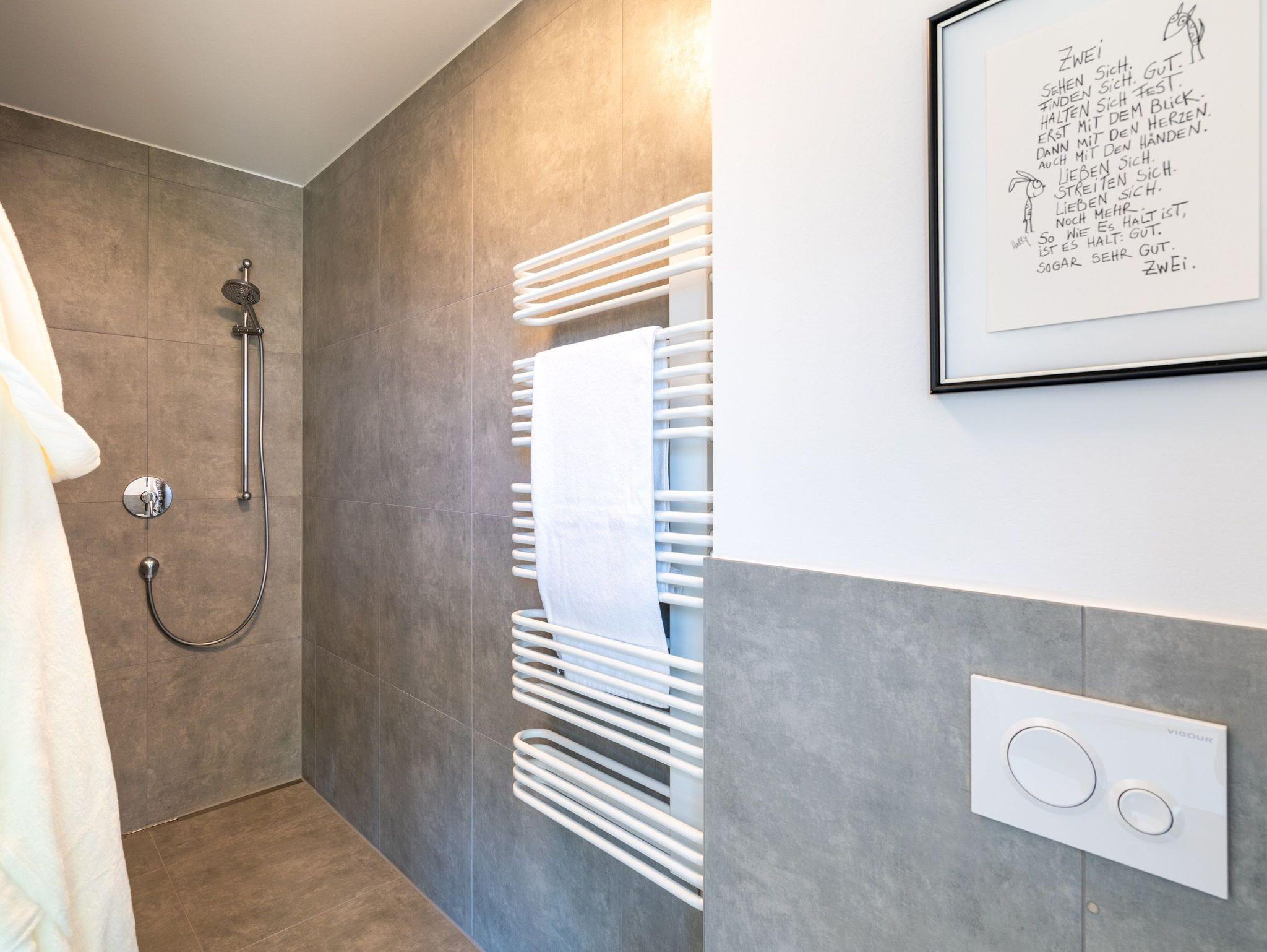 Im zweiten, voll ausgestatteten Badezimmer steht Ihnen eine großzügige Ganzglas-Duschkabine mit den Maßen 90 x 90 cm zur Verfügung.