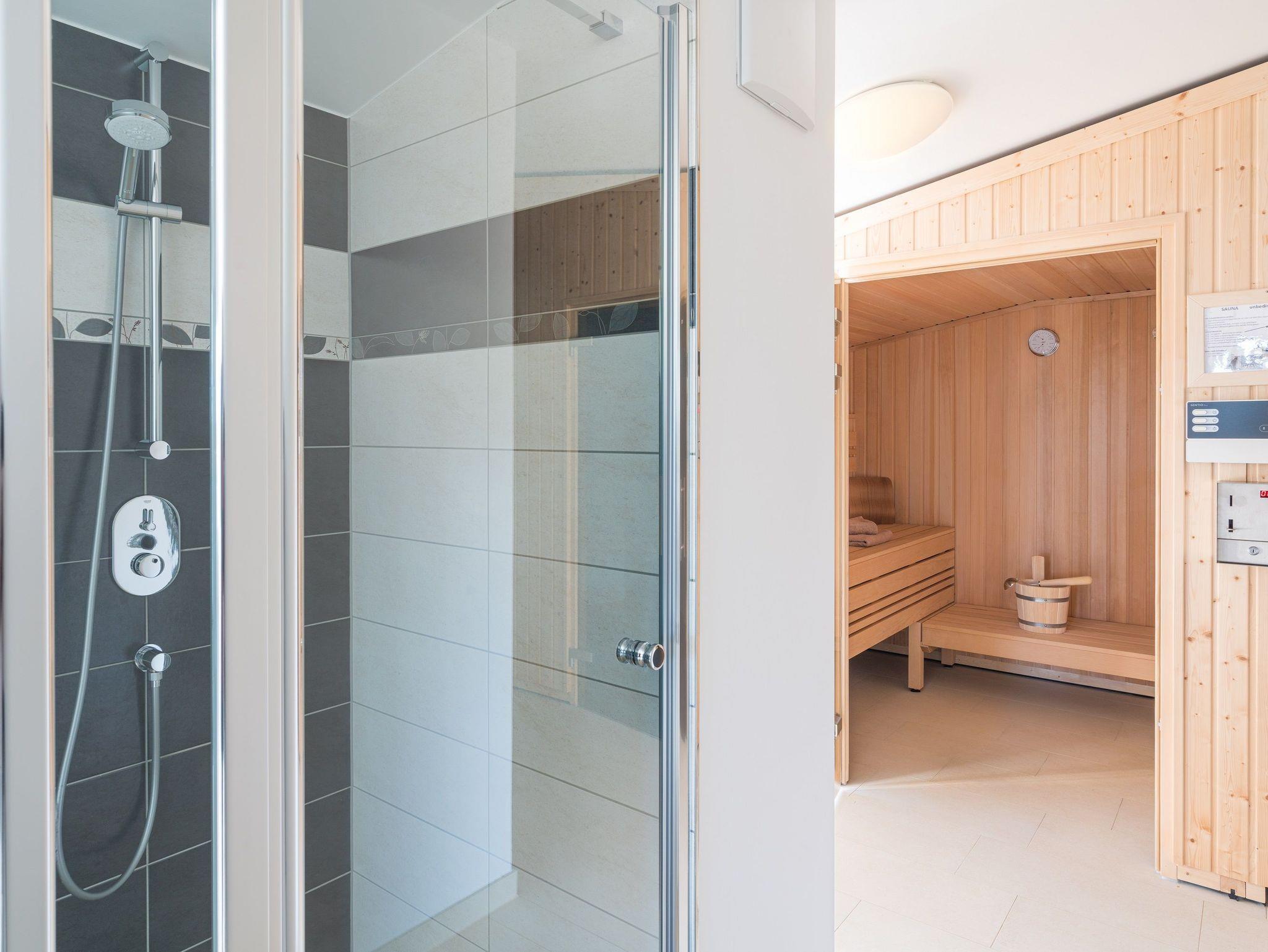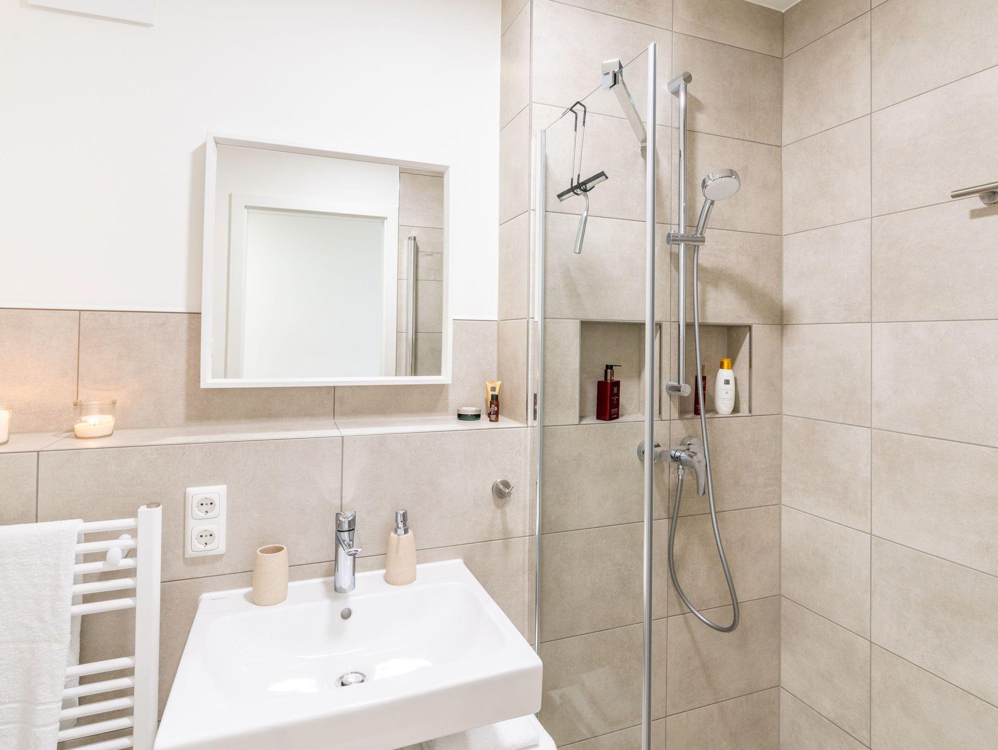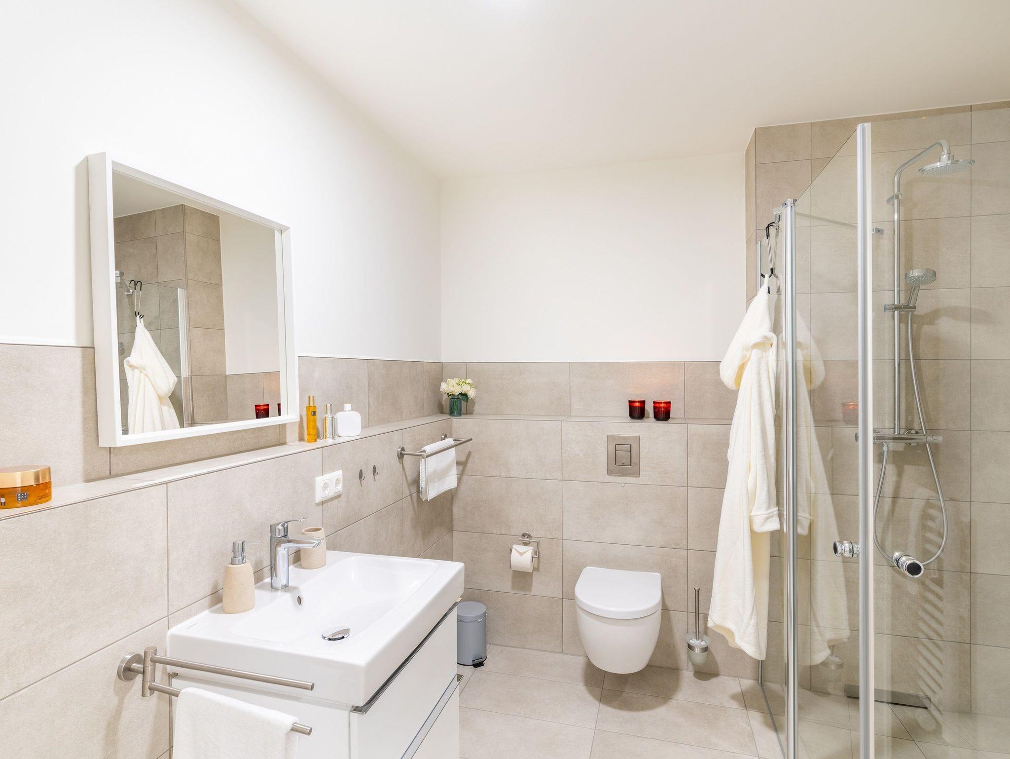 Die beiden vollausgestatteten Badezimmer verfügen jeweils über eine ebenerdige Dusche, WC, Waschtischanlage sowie Fön.