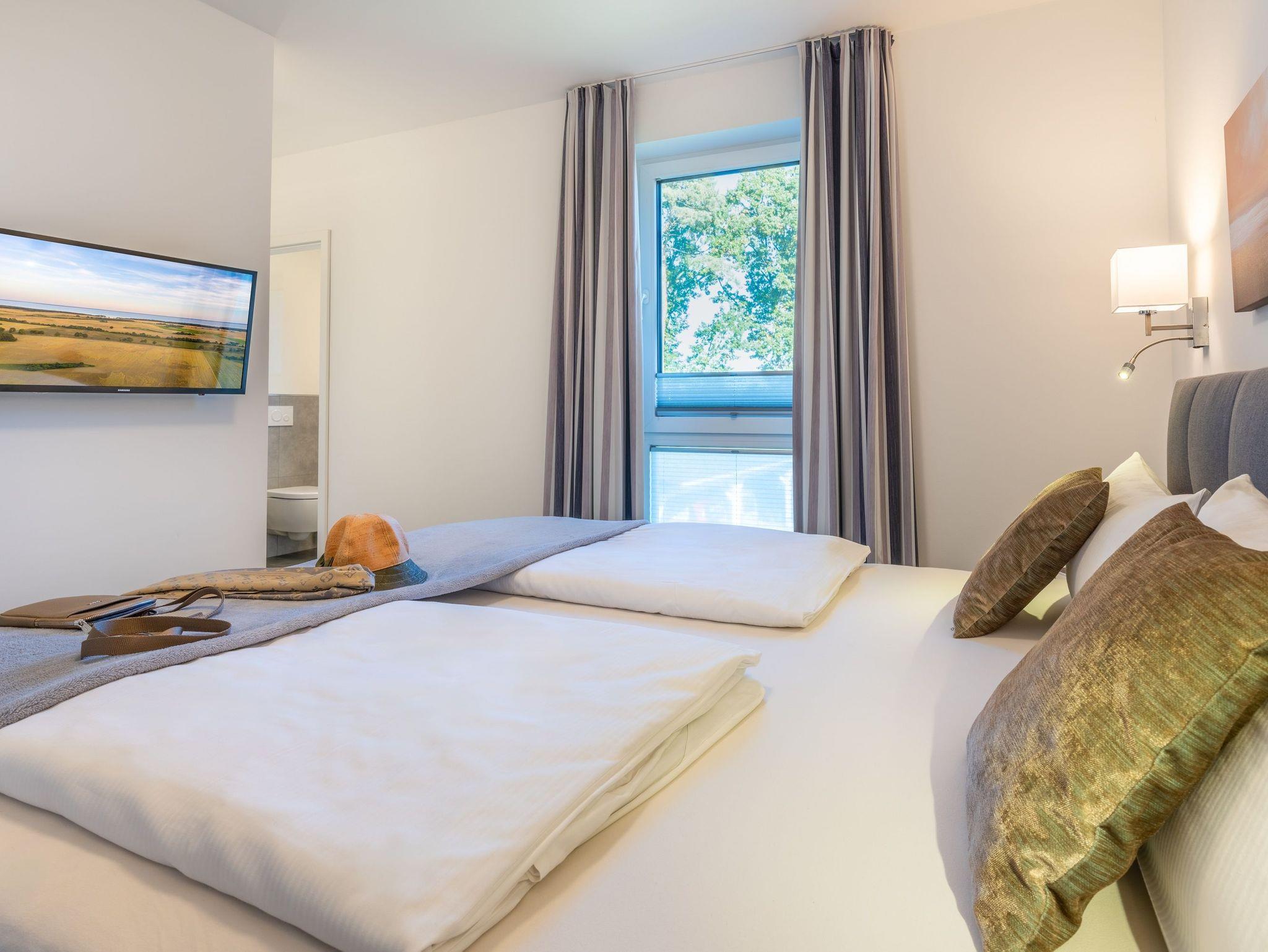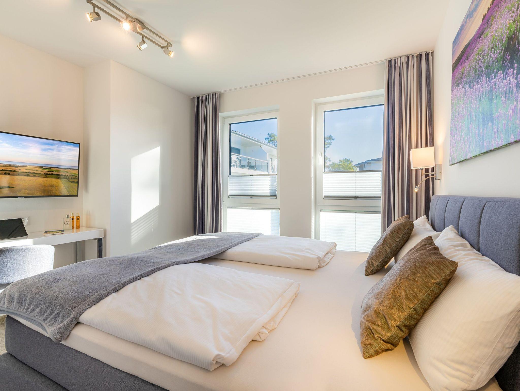 Erholsamer Schlaf in den beiden Schlafzimmern mit Boxspringbetten (jeweils 1.80 x 2,00 cm) und Smart-TV ist garantiert. Im dritten Schlafzimmer befindet sich ein bequemes Schlafsofa (Liegefläche: 1,60 x 2,00 m) und ein Smart-TV.
