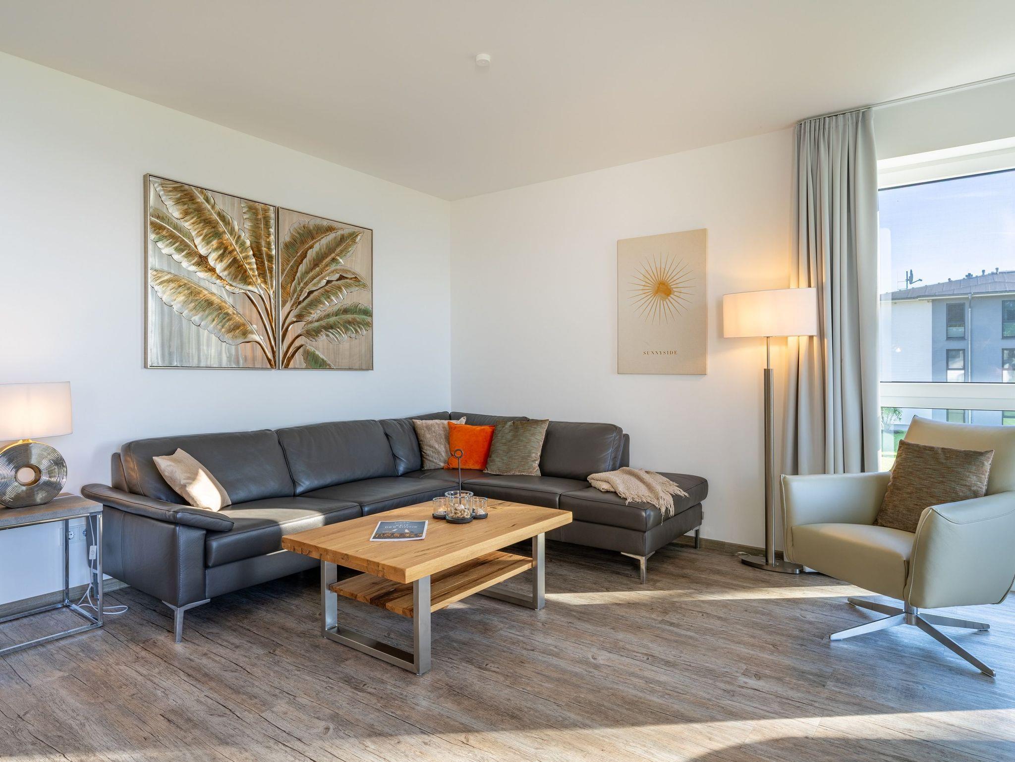 Die Wohnung ist modern eingerichtet mit offenem Wohn-Essbereich, großem Esstisch, Ledersofa sowie Smart-TV (inkl. Sky-Abo).