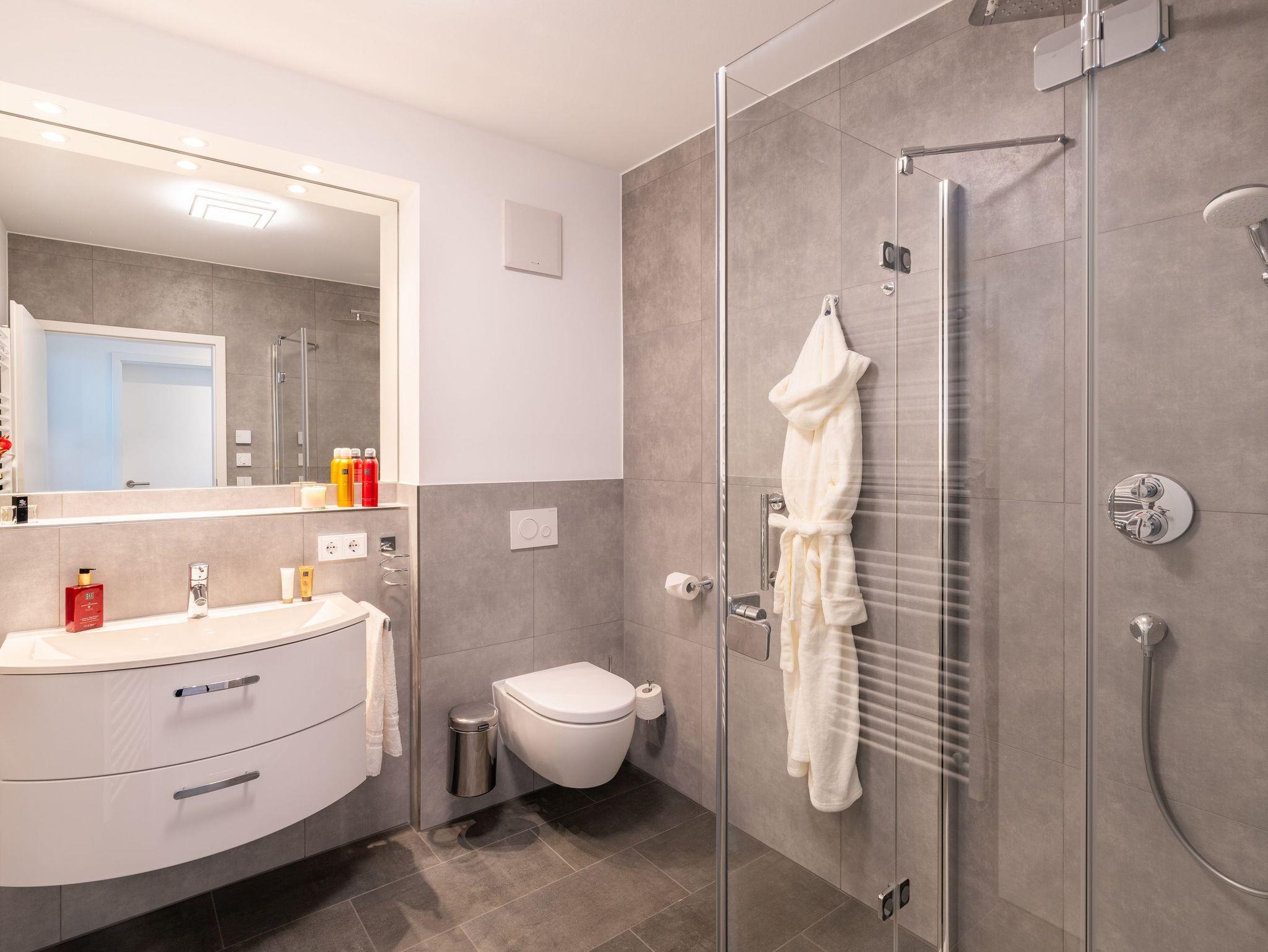 Das Badezimmer en suite ist mit einer begehbaren Dusche ausgestattet. Auf dem überdachten Sonnenbalkon mit Essgruppe und zwei Relax-Sesseln, Fußhockern sowie einem Sonnenschirm können Sie die Seele baumeln lassen.