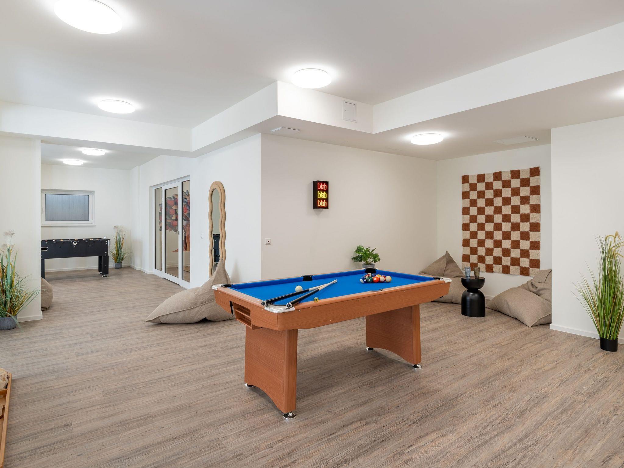 Ihre Kinder dürfen sich auf den vielseitig gestalteten Freizeitbereich (390 m²) im Souterrain des Nachbarhauses (Nr. 3) mit Tischtennis, Airhockey, Spielecke und Kickertisch freuen, der selbst an Schlechtwettertagen keine Langeweile aufkommen lässt. Erwachsene finden am Billardtisch oder in der gemütlichen Lounge-Ecke Ausgleich mit einem guten Buch oder Musik im Ohr.