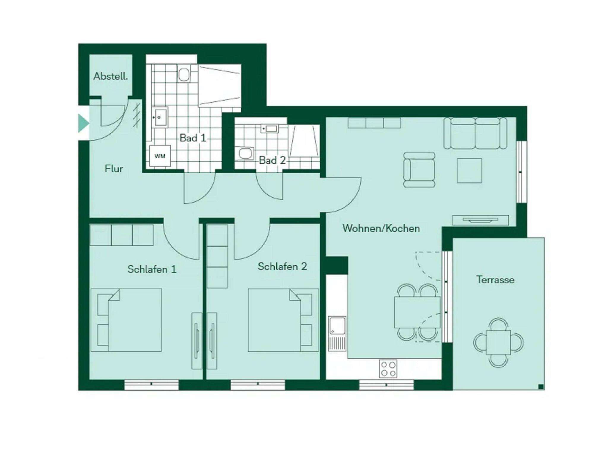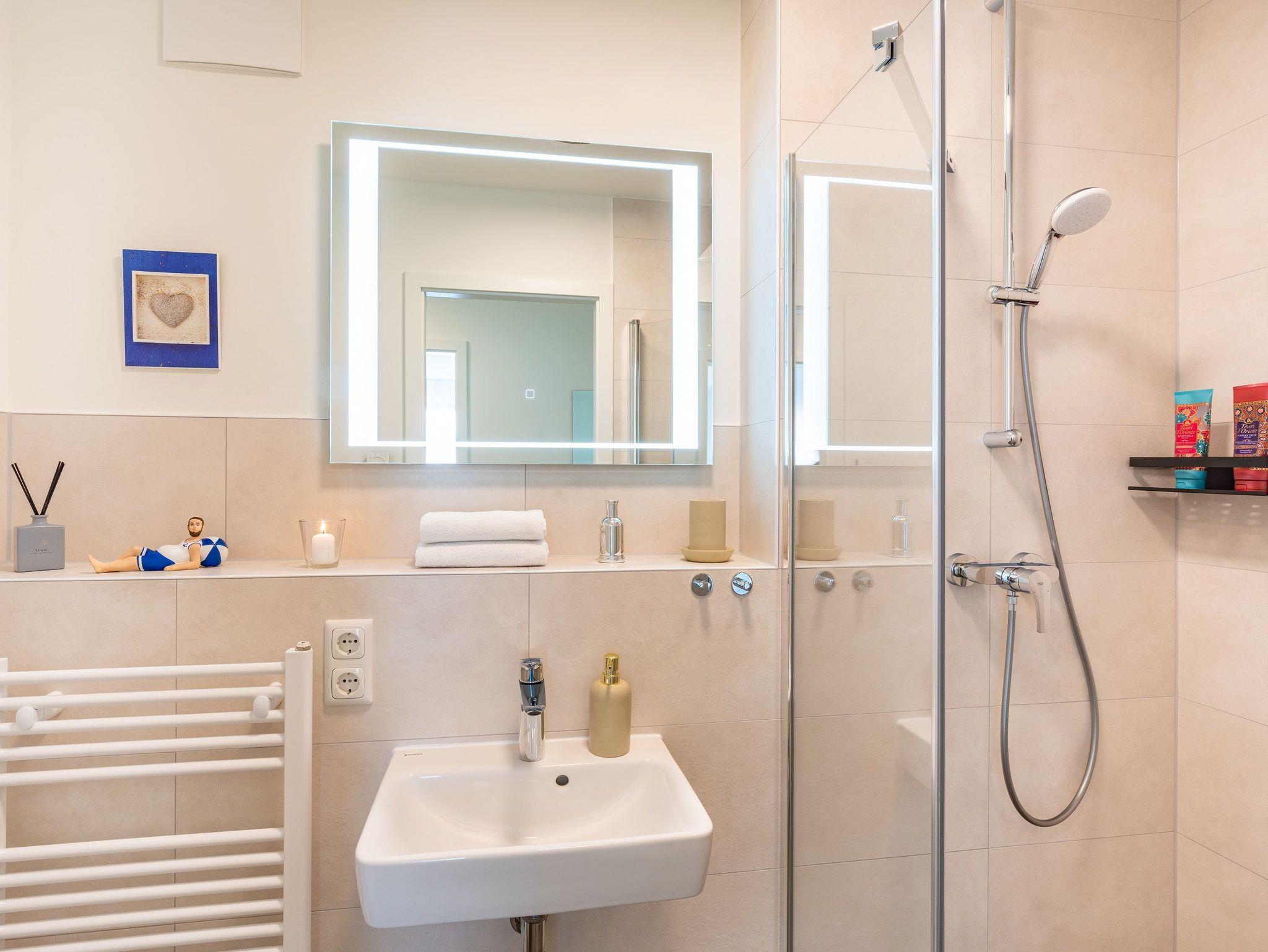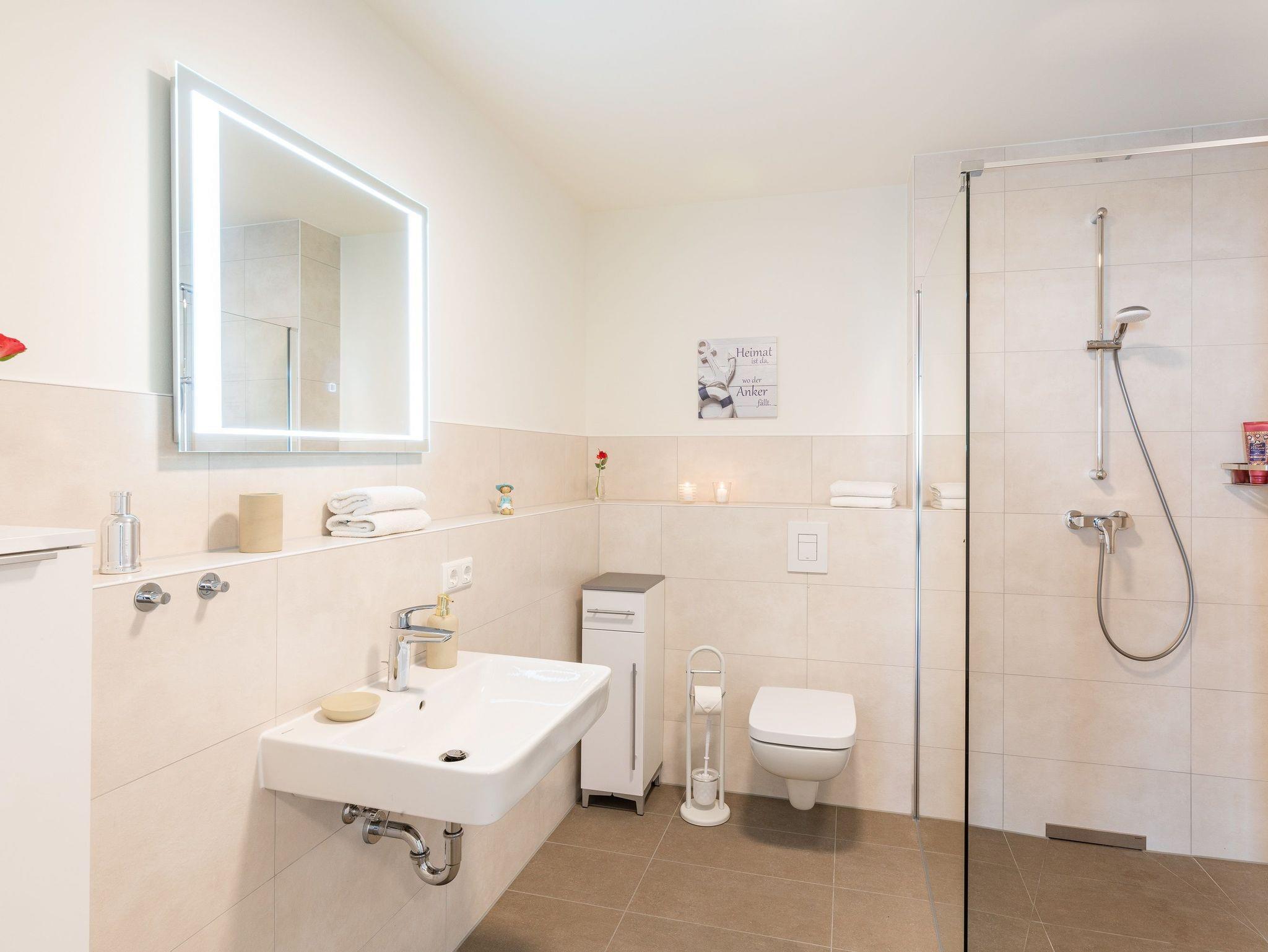 Die beiden vollausgestatteten Badezimmer verfügen jeweils über eine ebenerdige Dusche, WC, Waschtischanlage sowie Fön.