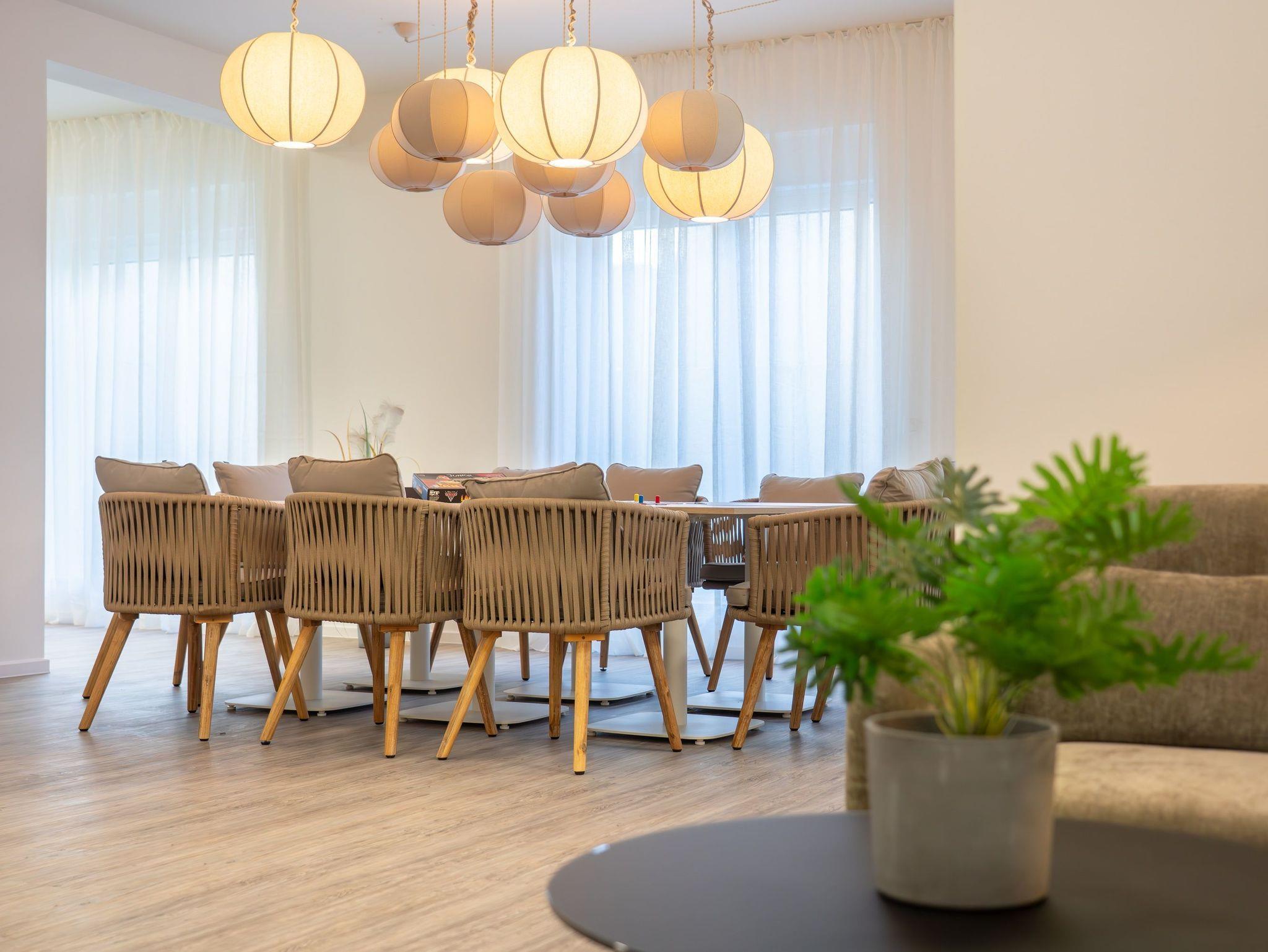Der offen gestaltete Wohnbereich ist mit einem ausziehbaren Sofa sowie ein Sessel mit Fußhocker und Smart-TV ausgestattet. Sie haben vom Wohnzimmer aus Zugang zur Südwest-Terrasse. Genießen Sie Ihre Speisen auf der möblierten Terrasse mit traumhaften Ausblicken in die Gartenanlage. Zwei zusätzliche Sonnenliegen runden den Komfort in den Sommermonaten ab.