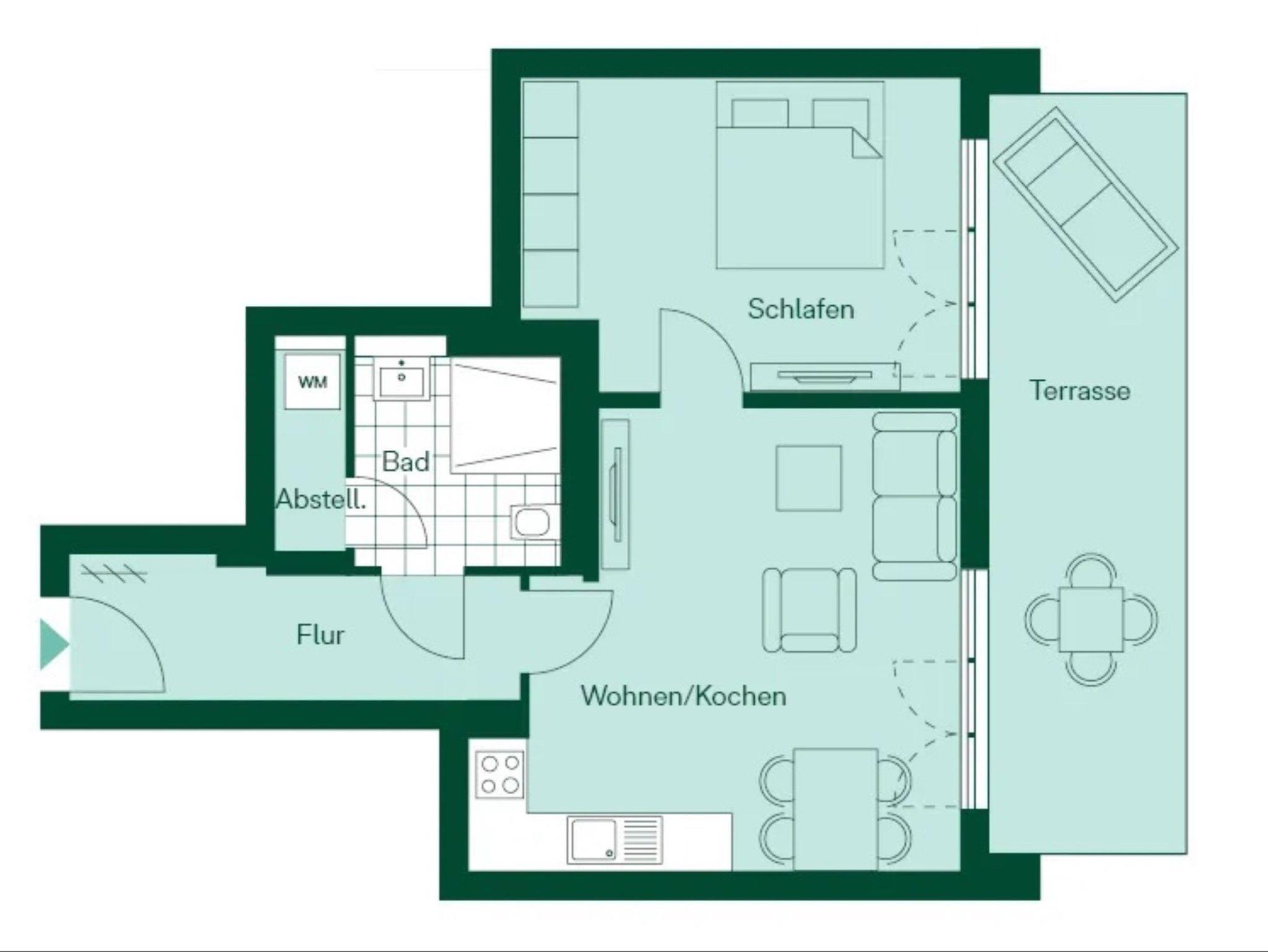 Der offen gestaltete Wohnbereich ist mit einem Ecksofa, Smart-TV und Internetradio ausgestattet. Sie haben vom Wohn- und Schlafzimmer aus Zugang zur Südterrasse. Genießen Sie Ihre Speisen auf der möblierten Terrasse mit traumhaften Ausblicken in die Gartenanlage. Zwei zusätzliche Sonnenliegen und ein Elektrogrill runden den Komfort in den Sommermonaten ab.
