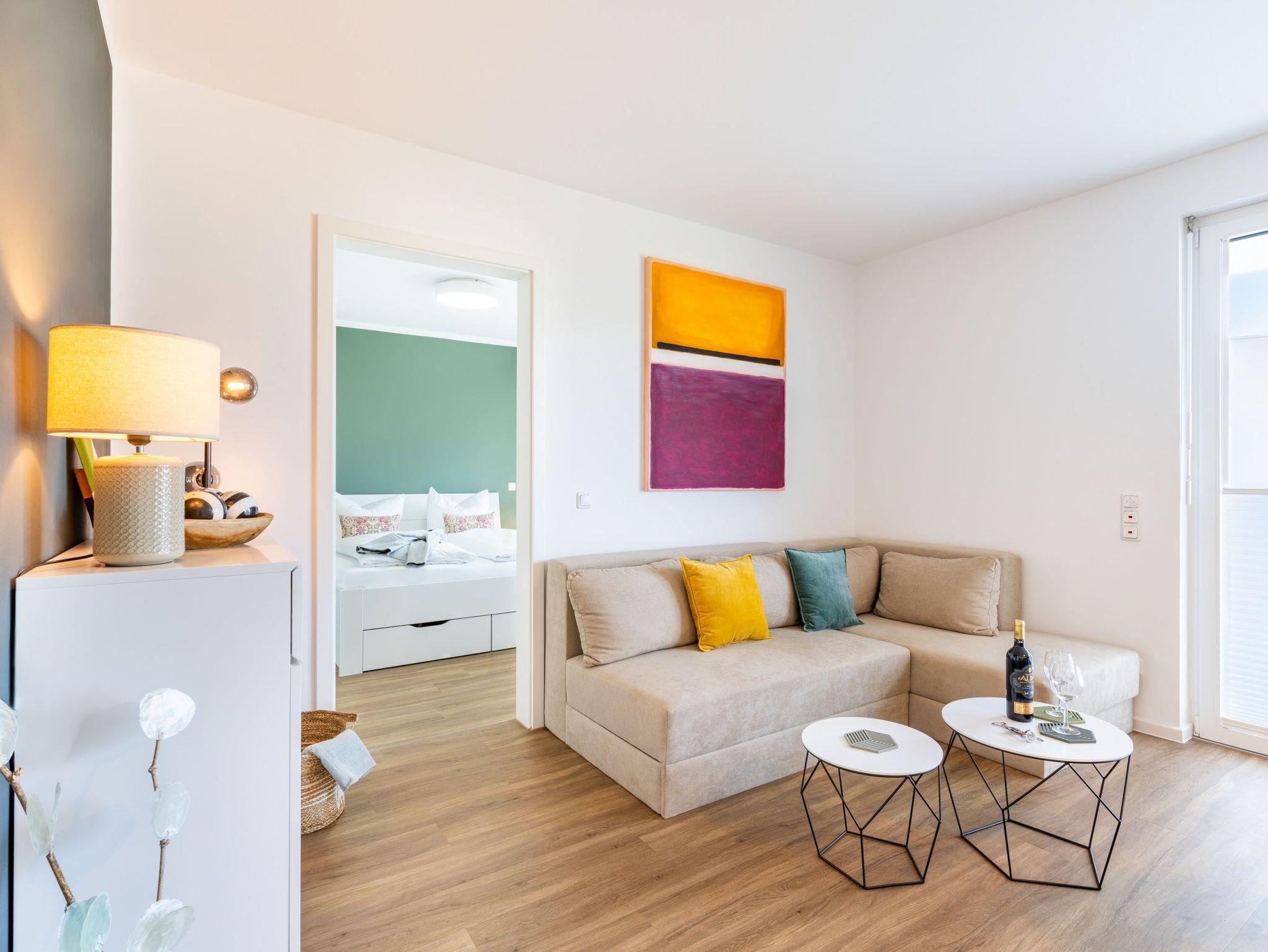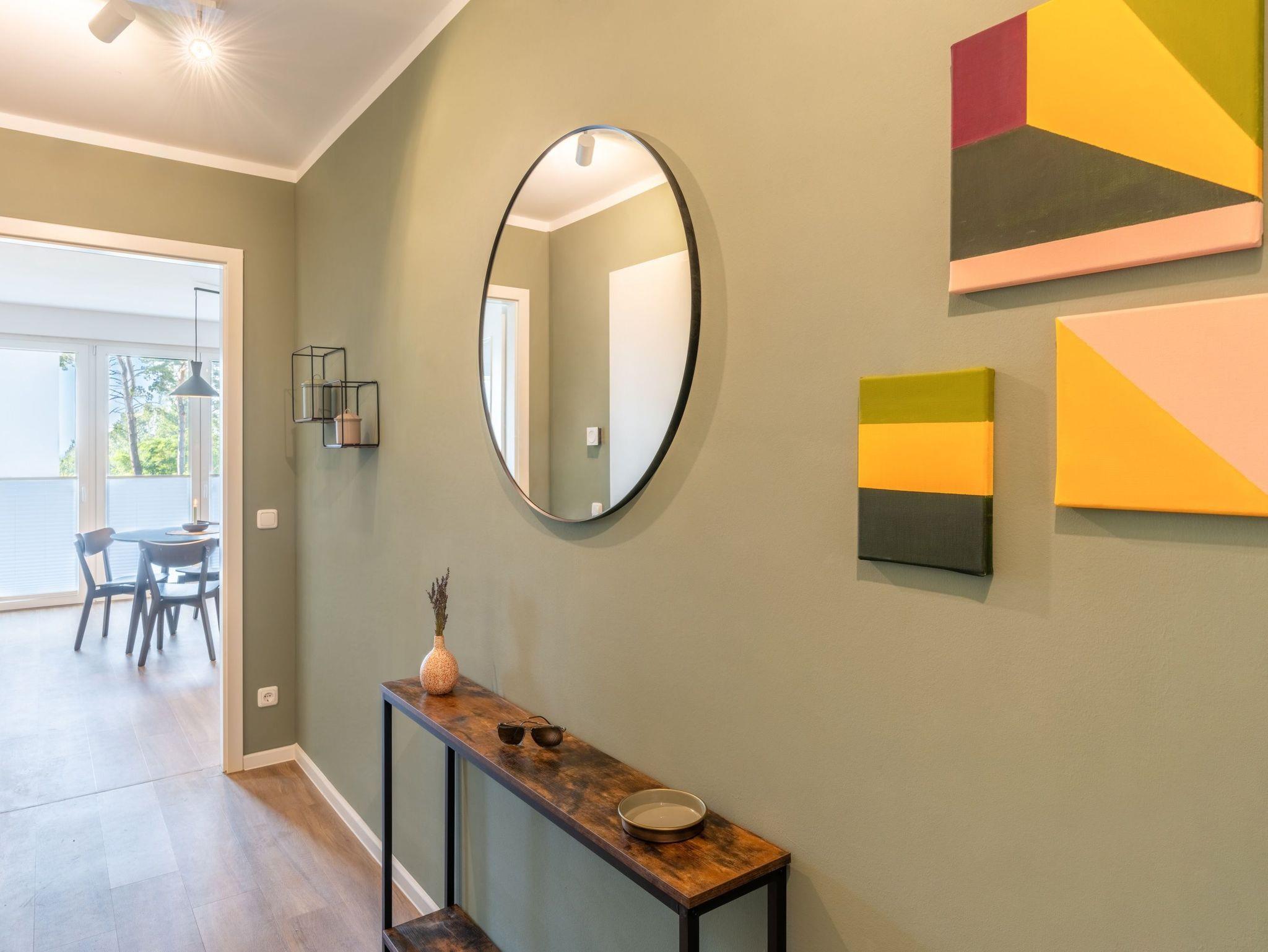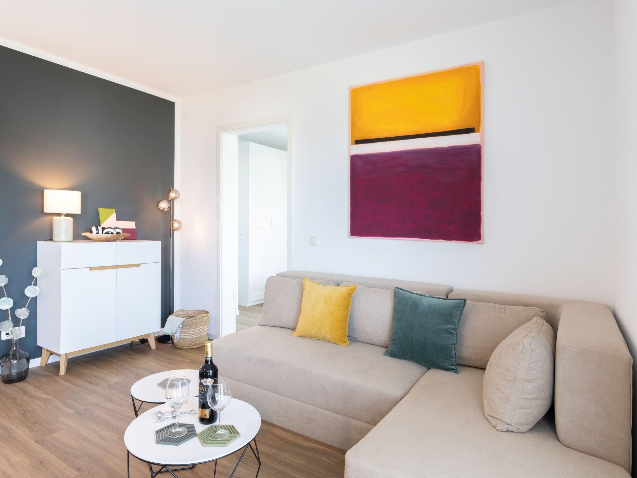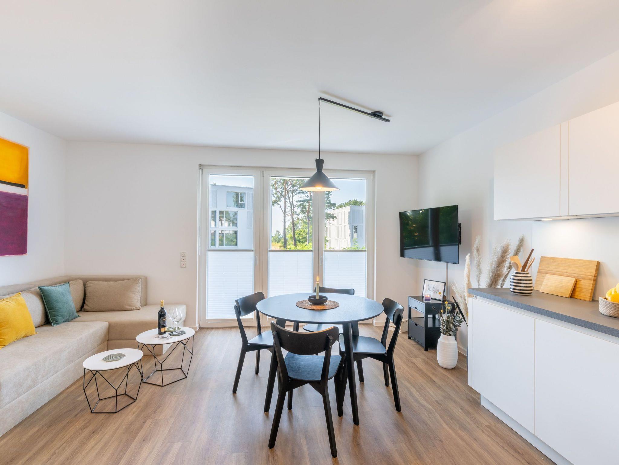 Auf einer Wohnfläche von 63 m² finden drei Erwachsene und ein Kleinkind bis zwei Jahre (im Babybett) in dieser modern eingerichteten Ferienwohnung ausreichend Platz für einen entspannten Urlaub am Stettiner Haff auf Usedom.