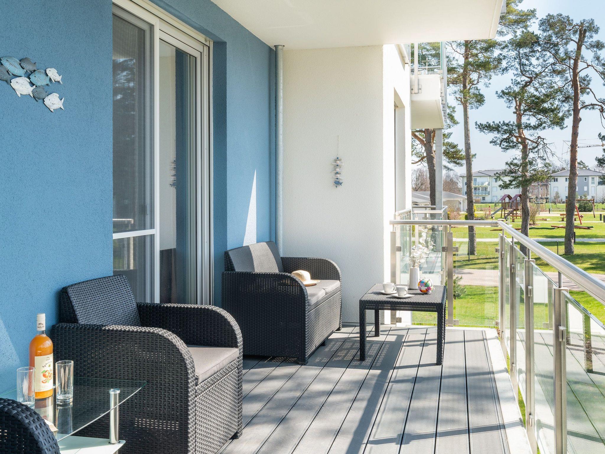 Der offene Wohnbereich ist ausgestattet mit einem gemütlichen Sofa und Smart-TV. Sie haben vom Wohn- und Schlafzimmer aus Zugang zum großen Süd-Balkon. Der möblierte Balkon mit traumhaften Ausblicken auf das Stettiner Haff bietet auch aus der zweiten Reihe einen wunderschönen Ort, um Ihre Mahlzeiten zu genießen und die Aussicht zu bewundern.