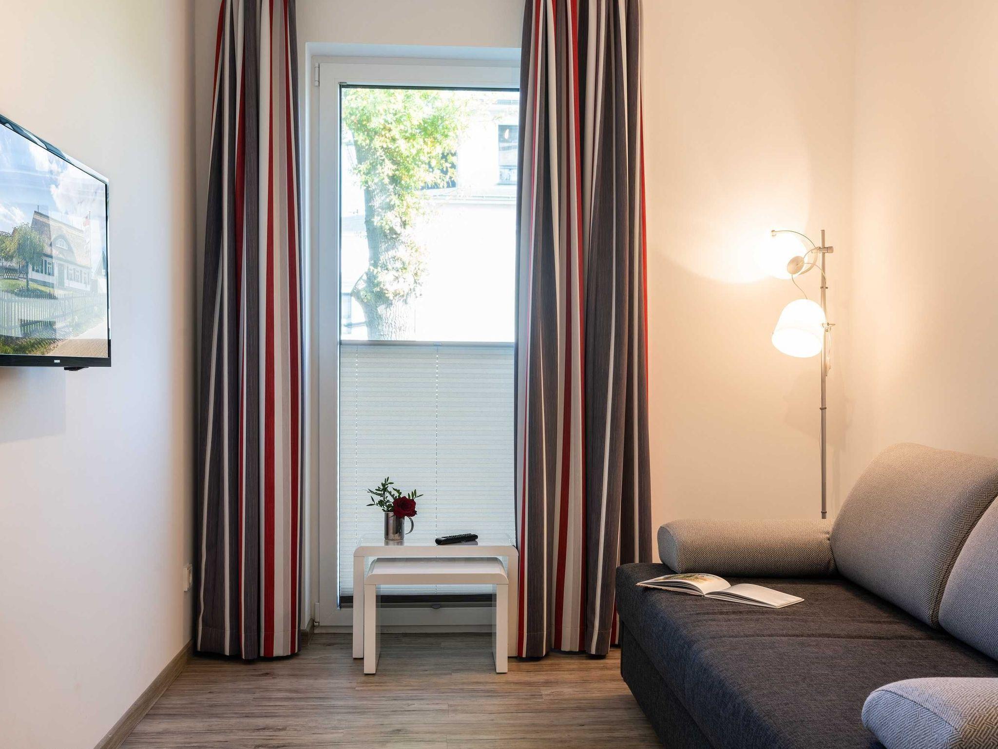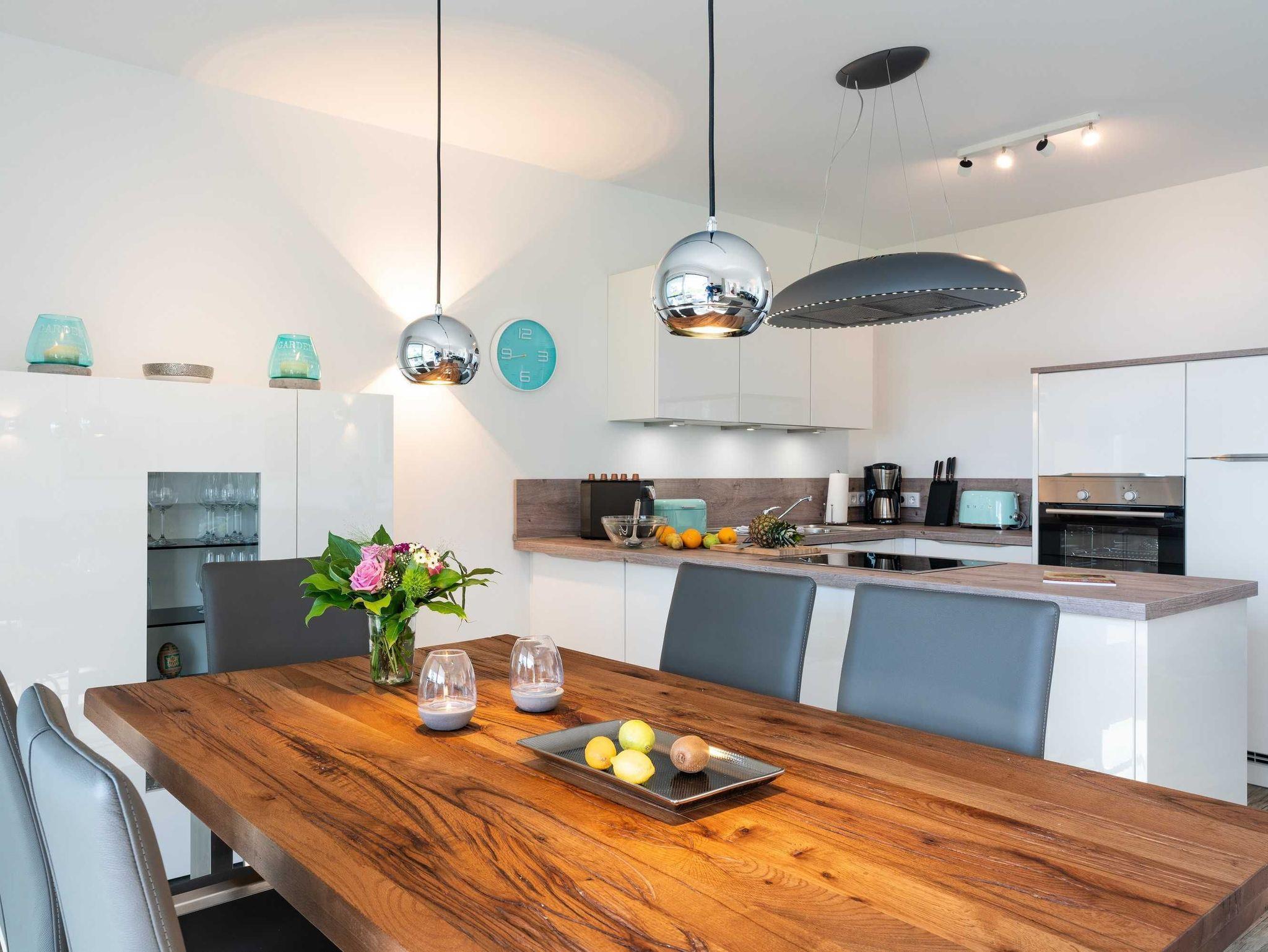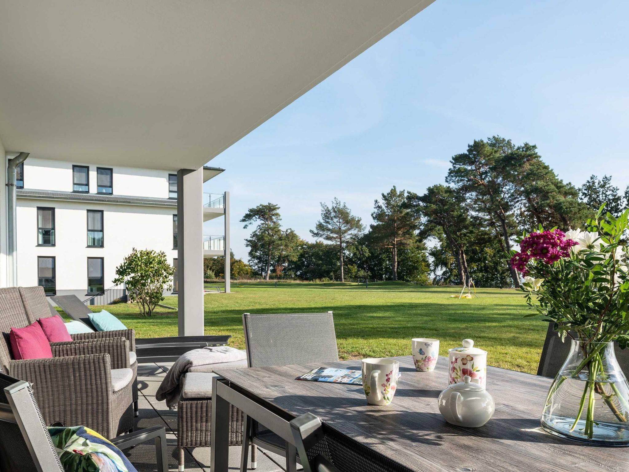 Diese luxuriöse 4-Zimmer-Wohnung im Erdgeschoss von Haus 4 mit Platz für maximal 6 Personen sowie einem Kleinkind bis 2 Jahre im Babybett verfügt über eine Wohnfläche von 119 m² und hat 3 Schlafzimmer sowie 2 voll ausgestattete Duschbäder. Die große Sonnenterrasse mit 21 m² liegt in idealer Süd-Ausrichtung. Die Wohnung ist modern eingerichtet mit offenem Wohn-Essbereich, großem Esstisch, Ledersofa sowie Smart-TV (inkl. Sky-Abo). Die hochwertig ausgestattete Küche, offen zum Wohnbereich, lässt keine Wünsche offen. Erholsamer Schlaf in den beiden Schlafzimmern mit Boxspringbetten und Smart-TV ist garantiert. Im dritten Schlafzimmer befindet sich ein bequemes Schlafsofa (Liegefläche: 1,80 x 2,00 m) und ein Smart-TV. Das Badezimmer en Suite ist mit einer begehbaren Dusche ausgestattet. Auf der großen, überdachten Sonnenterrasse mit Essgruppe und jeweils zwei Relax-Sesseln, Fußhockern, Sonnenschirm und Sonnenliegen können Sie die Seele baumeln lassen.