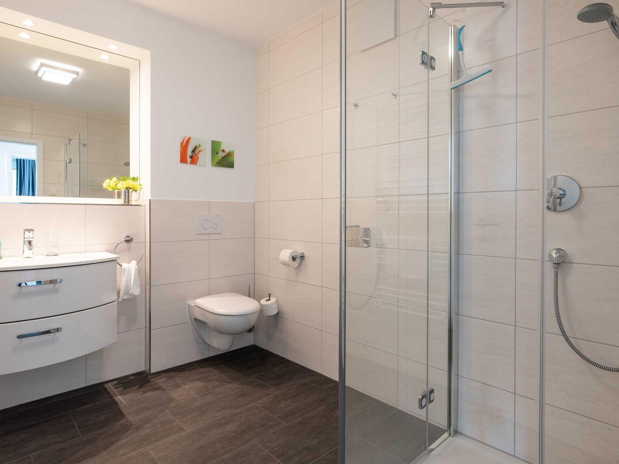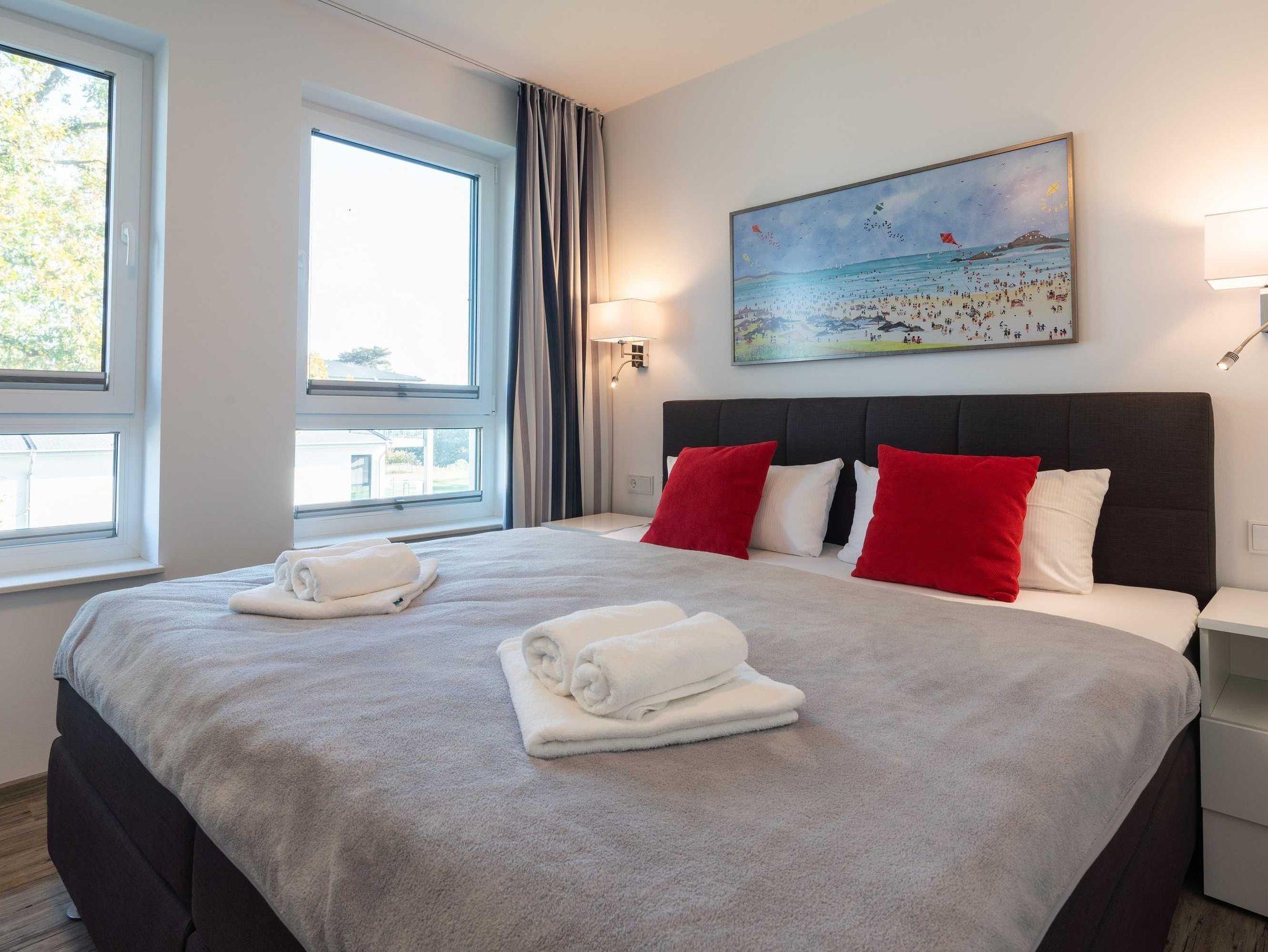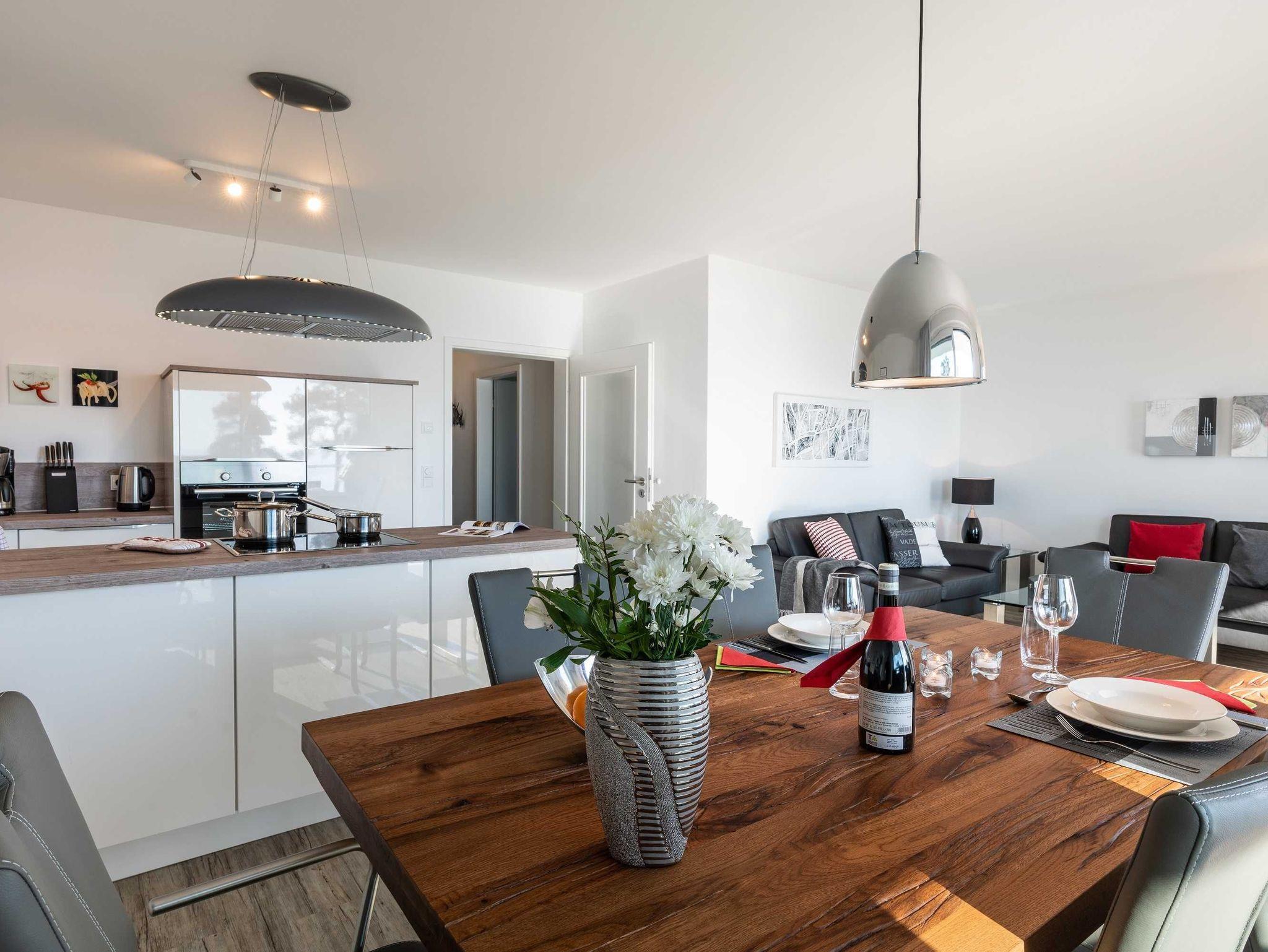 Diese lichtdurchflutete, helle 3-Zimmer-Wohnung im obersten Geschoss von Haus 4 (Aufzug vorhanden) mit Platz für maximal 4 Personen sowie einem Kleinkind bis 2 Jahre im Babybett verfügt über eine Wohnfläche von 94 m² und hat 2 Schlafzimmer sowie 2 voll ausgestattete Duschbäder. Die große Sonnenterrasse mit 17 m² liegt in idealer Süd-Ausrichtung. Die Wohnung ist modern eingerichtet mit offenem Wohn-Essbereich, großem Esstisch, Ledersofa sowie Smart-TV (inkl. Sky-Abo). Die hochwertig ausgestattete Küche, offen zum Wohnbereich, lässt keine Wünsche offen. Erholsamer Schlaf in den beiden Schlafzimmern mit Boxspringbetten und Smart-TV ist garantiert. Das Badezimmer en Suite ist mit einer Duschkabine ausgestattet. Auf dem großen, überdachten Sonnenbalkon mit Essgruppe und zwei Relax-Sesseln, Fußhockern sowie einem Sonnenschirm können Sie die Seele baumeln lassen.