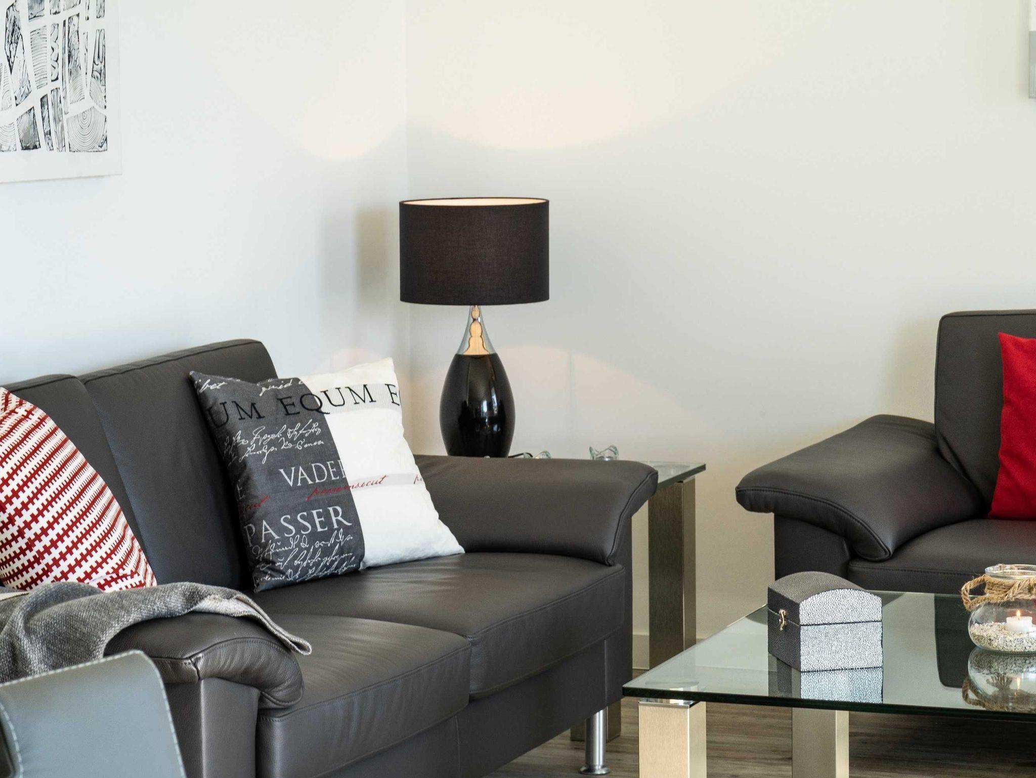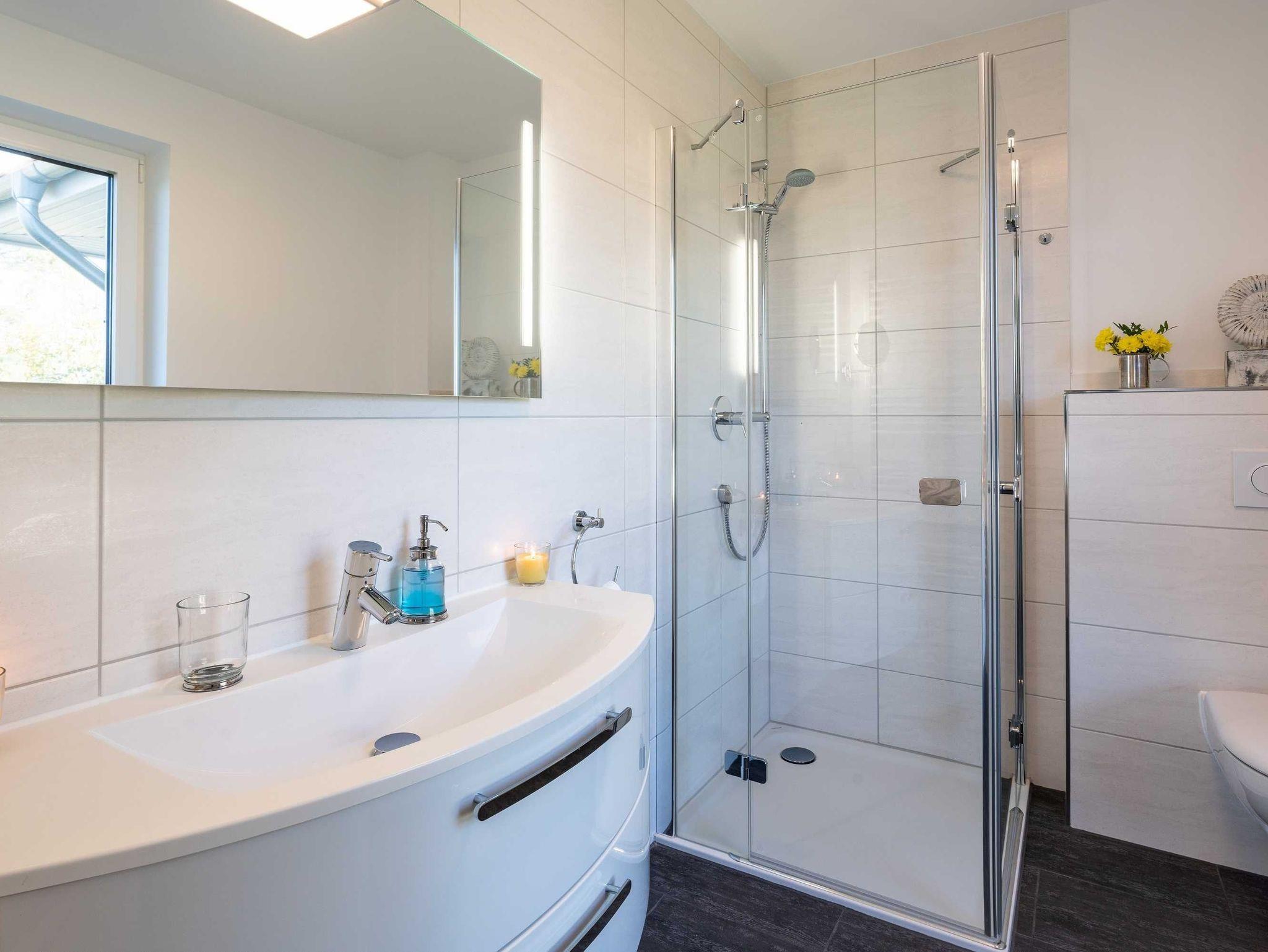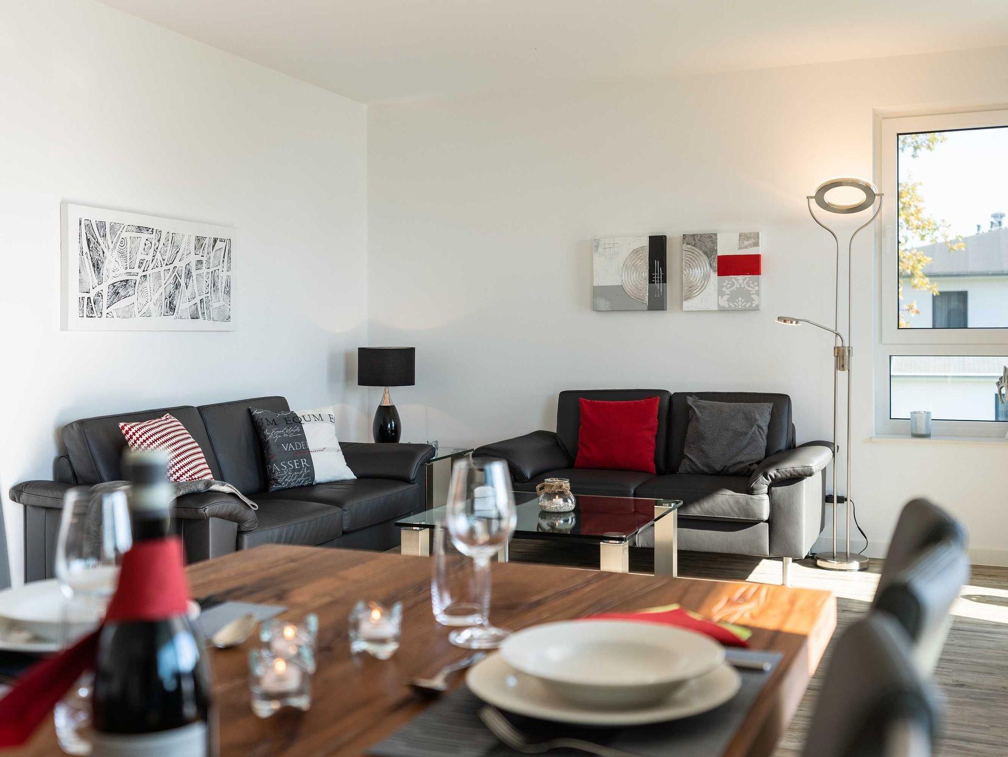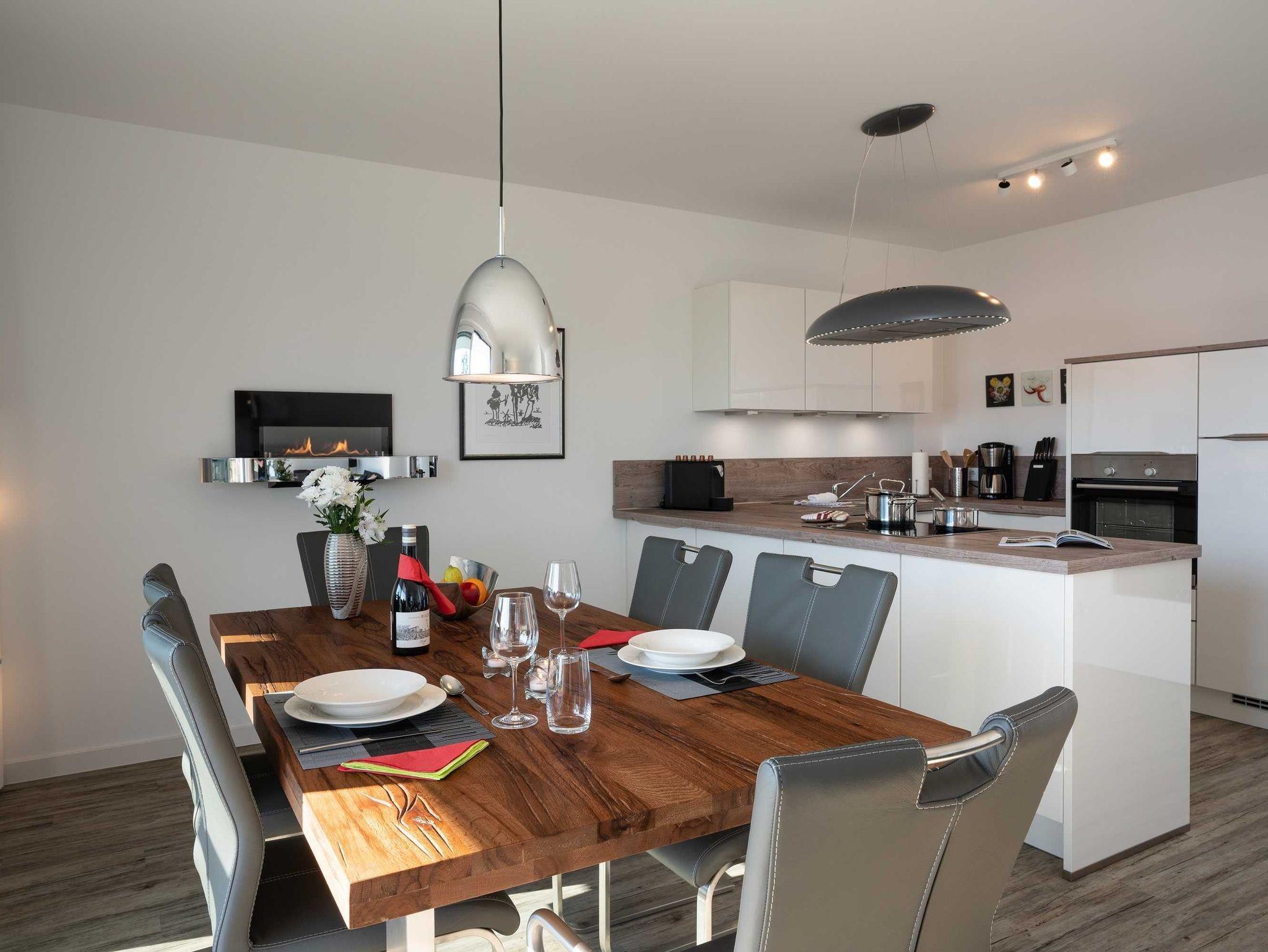Diese lichtdurchflutete, helle 3-Zimmer-Wohnung im obersten Geschoss von Haus 4 (Aufzug vorhanden) mit Platz für maximal 4 Personen sowie einem Kleinkind bis 2 Jahre im Babybett verfügt über eine Wohnfläche von 94 m² und hat 2 Schlafzimmer sowie 2 voll ausgestattete Duschbäder. Die große Sonnenterrasse mit 17 m² liegt in idealer Süd-Ausrichtung. Die Wohnung ist modern eingerichtet mit offenem Wohn-Essbereich, großem Esstisch, Ledersofa sowie Smart-TV (inkl. Sky-Abo). Die hochwertig ausgestattete Küche, offen zum Wohnbereich, lässt keine Wünsche offen. Erholsamer Schlaf in den beiden Schlafzimmern mit Boxspringbetten und Smart-TV ist garantiert. Das Badezimmer en Suite ist mit einer Duschkabine ausgestattet. Auf dem großen, überdachten Sonnenbalkon mit Essgruppe und zwei Relax-Sesseln, Fußhockern sowie einem Sonnenschirm können Sie die Seele baumeln lassen.