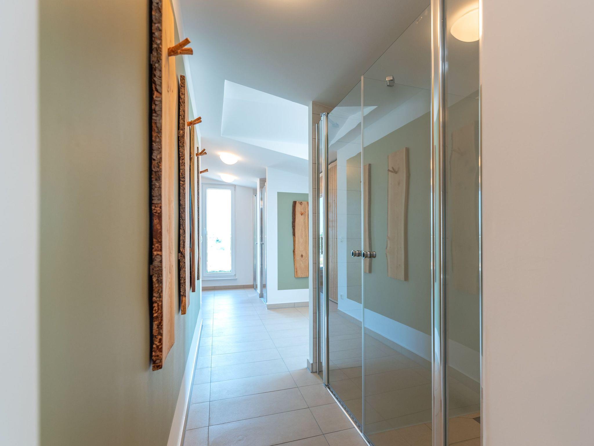Im Schlafzimmer sorgt ein Boxspringbett (180 cm x 200 cm Liegefläche) für erholsamen Schlaf, und der offene Kleiderschrank bietet ausreichend Stauraum. Das Badezimmer ist mit einer großen ebenerdigen Dusche, WC, Föhn und Handtuchheizung ausgestattet. Fußbodenheizung in allen Räumen sorgt für Wärme und Komfort.