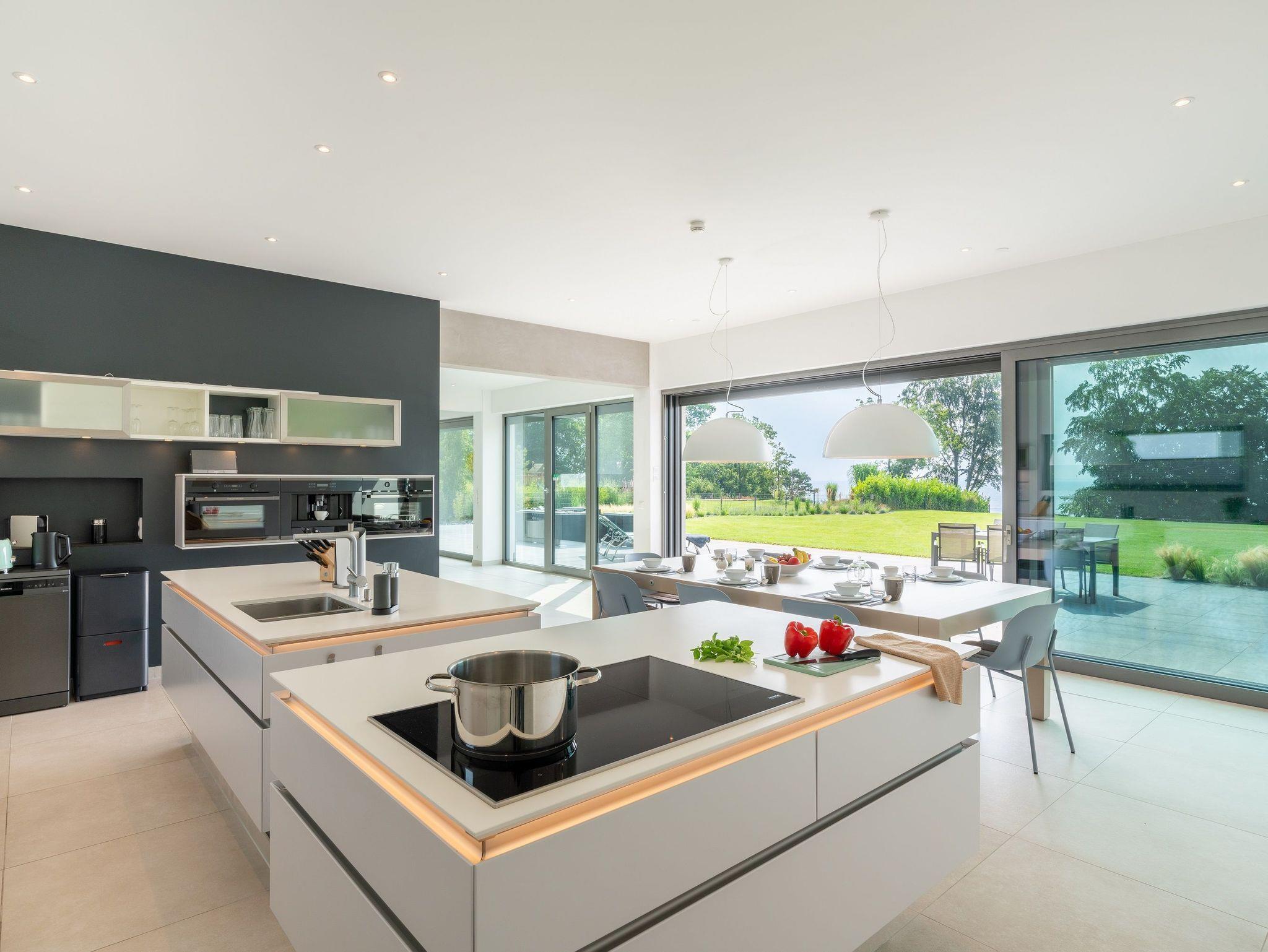 Auf der rechten Seite befindet sich eine offene, großflächige und moderne Wohnküche, hochwertig ausgestattet mit Geschirrspüler, Induktionsherd, Dampfgarer, Raclette, Kaffeeautomat, Mikrowelle und Nespresso-Maschine.