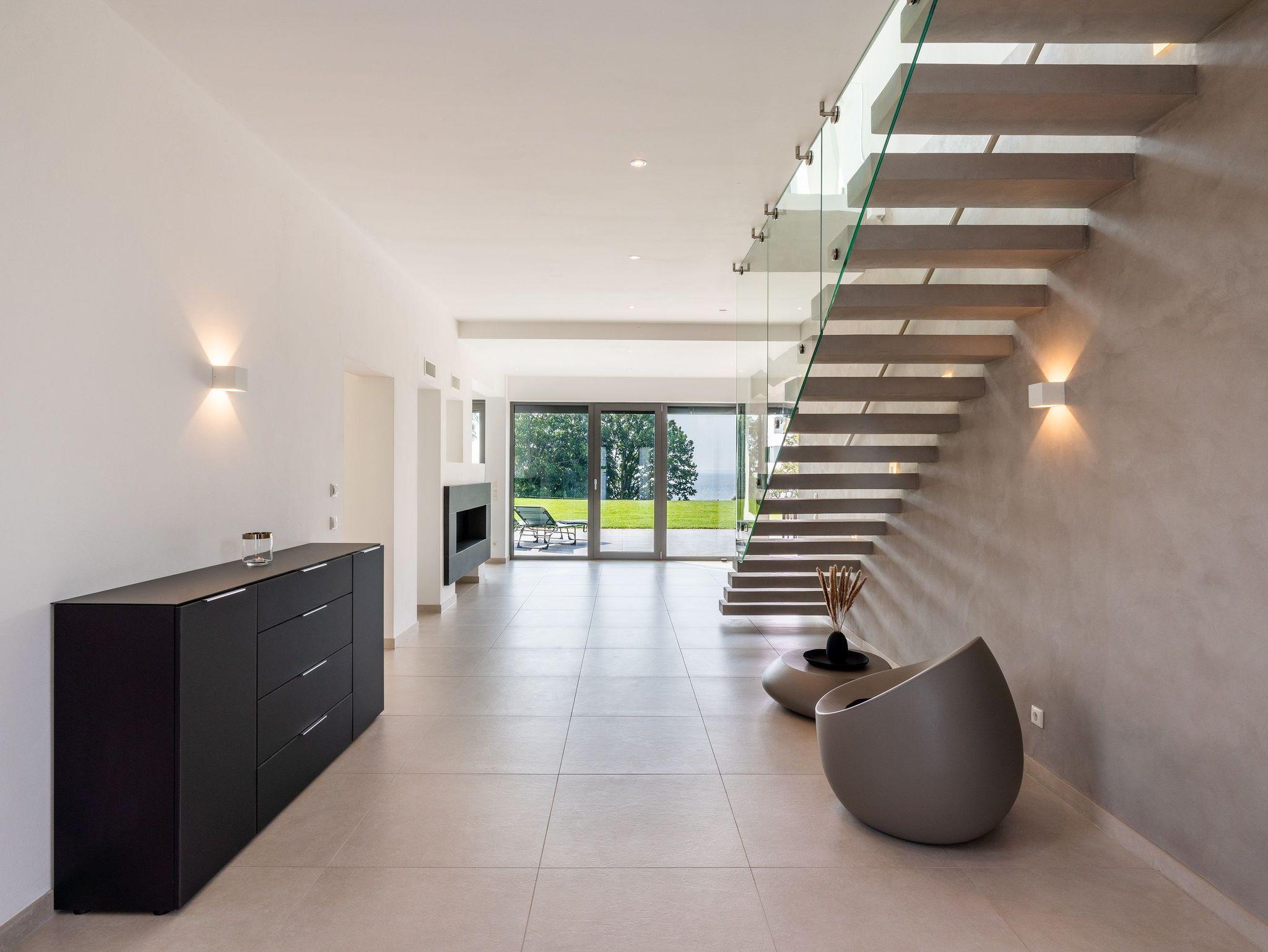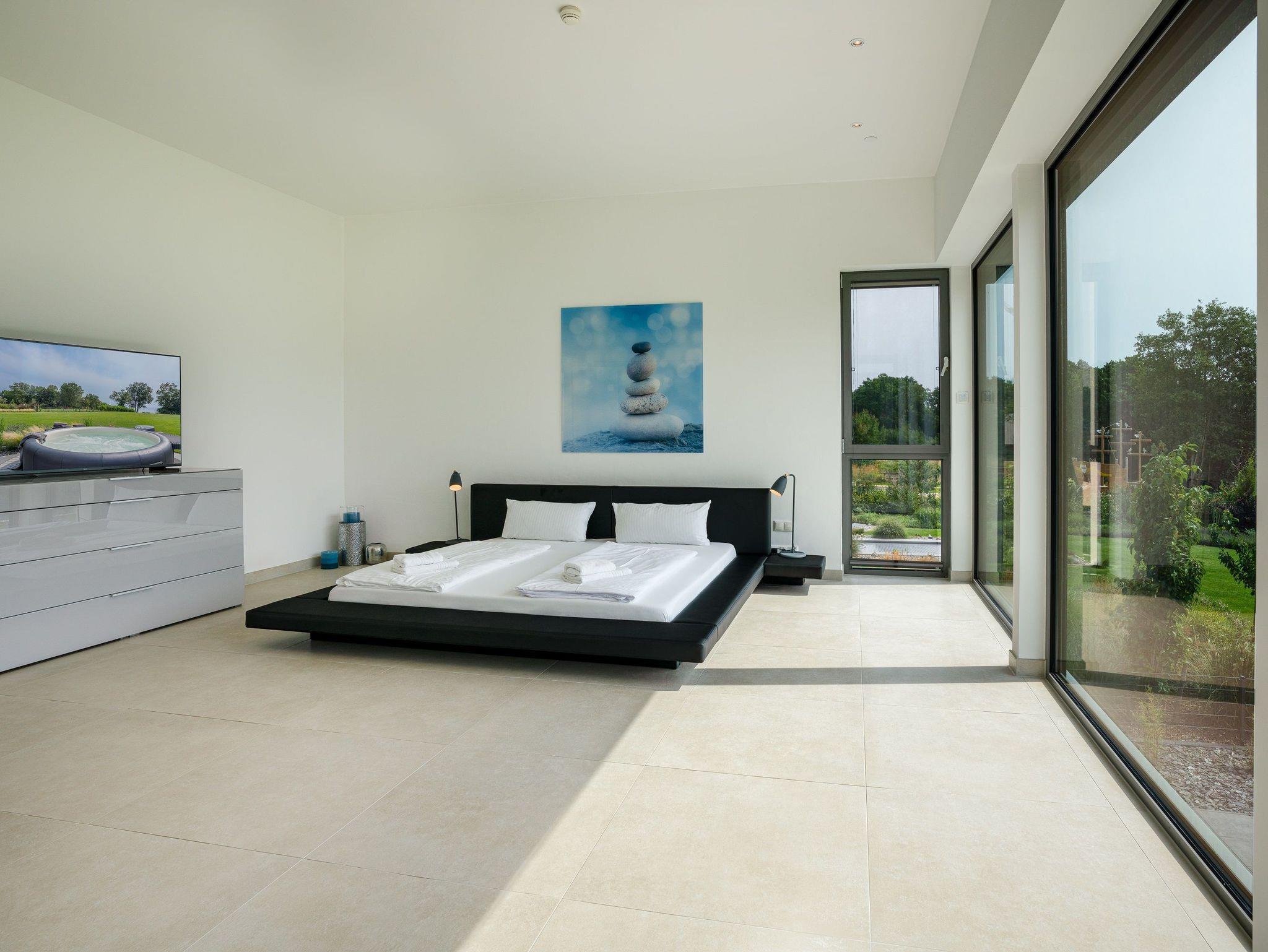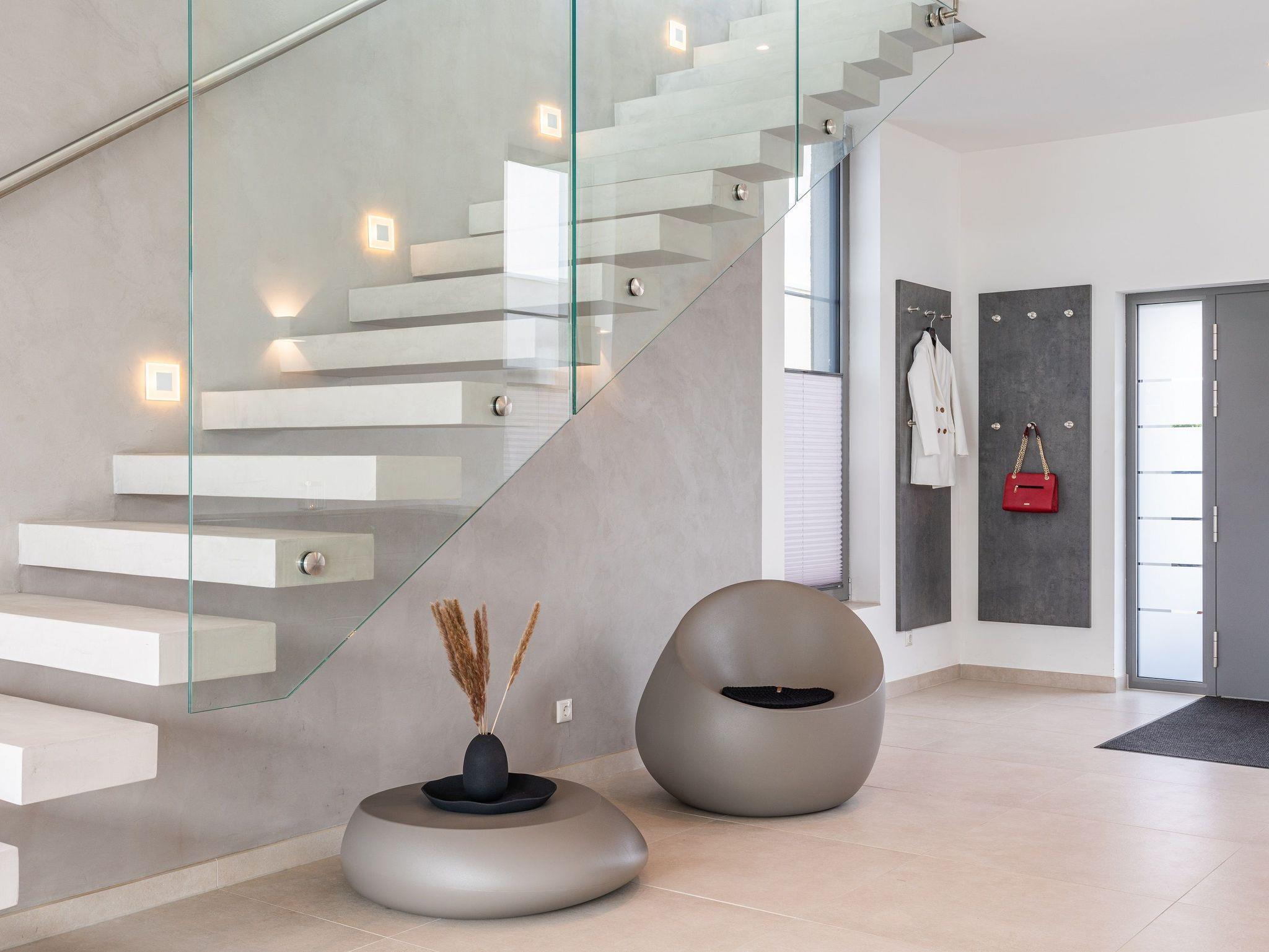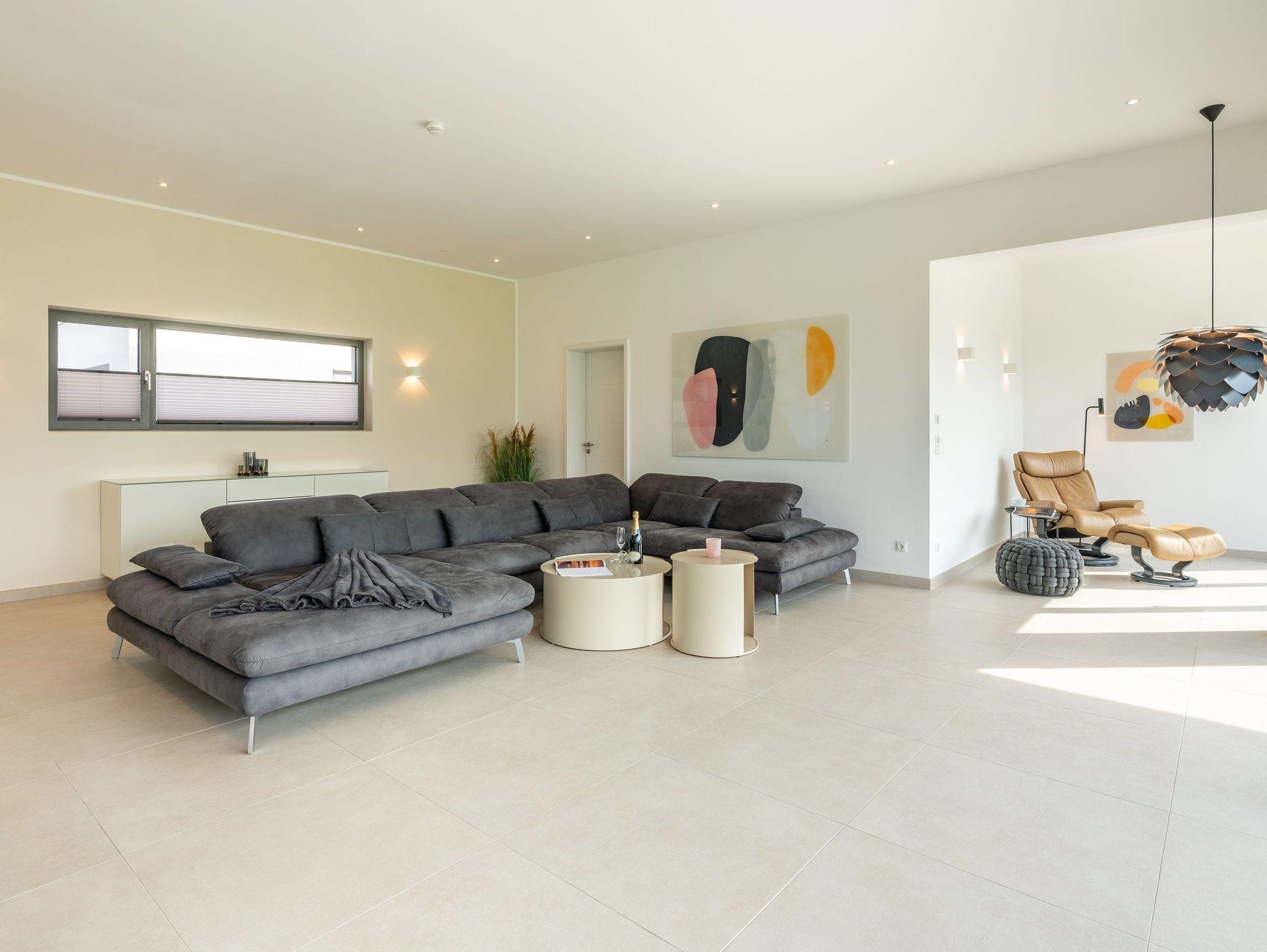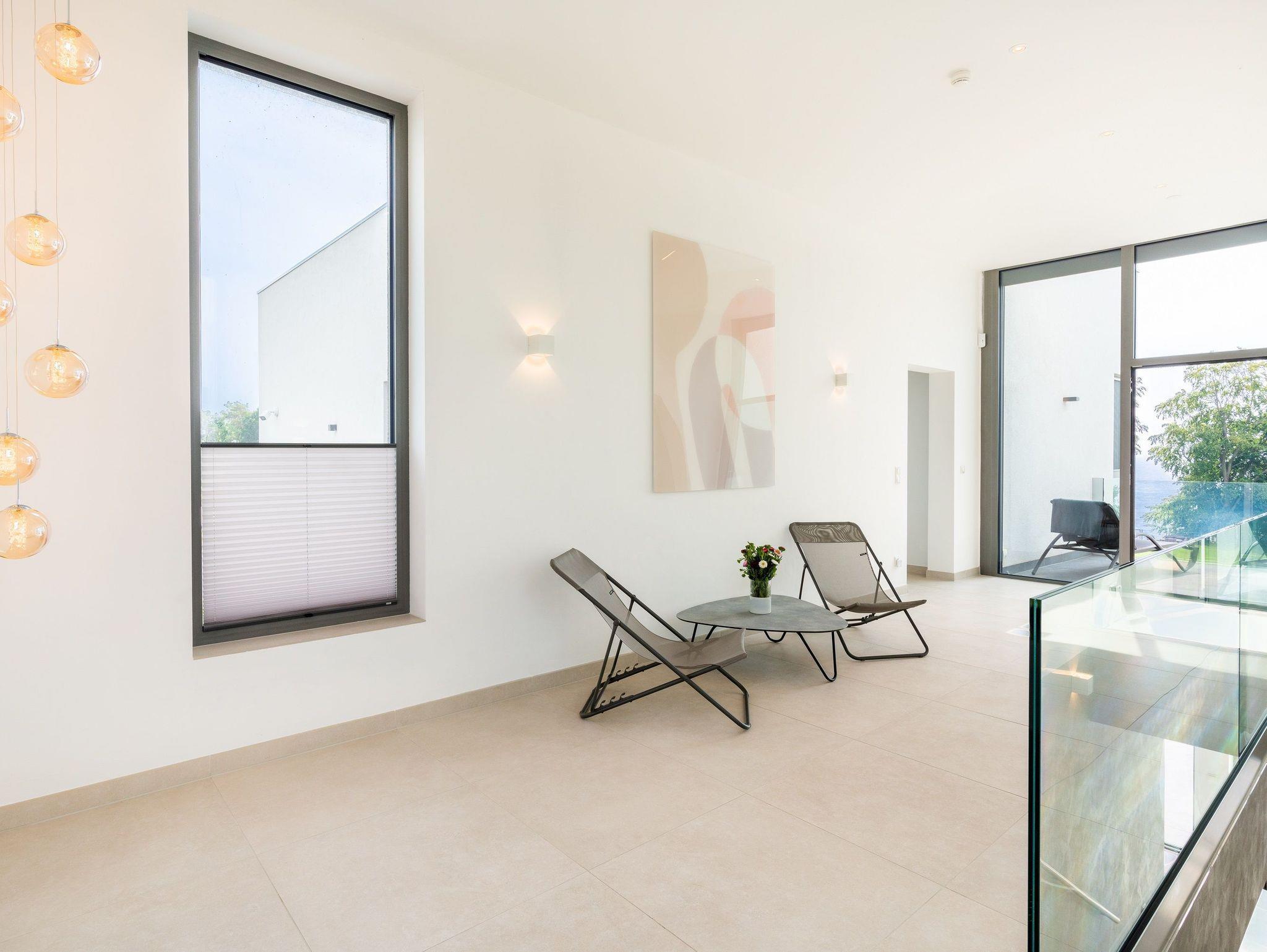 Betritt man das Haus, setzt sich das Gefühl von Weitläufigkeit im Innenbereich fort - ein großer Eingangsbereich mit freischwebender Treppe öffnet sich zu den Seiten in zwei symmetrische Bereiche. Linke Hand befindet sich der große, offene Wohnbereich mit bequemer Wohnlandschaft und Sat-TV (65 ) sowie gemütlicher Leseecke. Die bodentiefen Fenster lassen sich bei Bedarf fast in voller Breite öffnen.