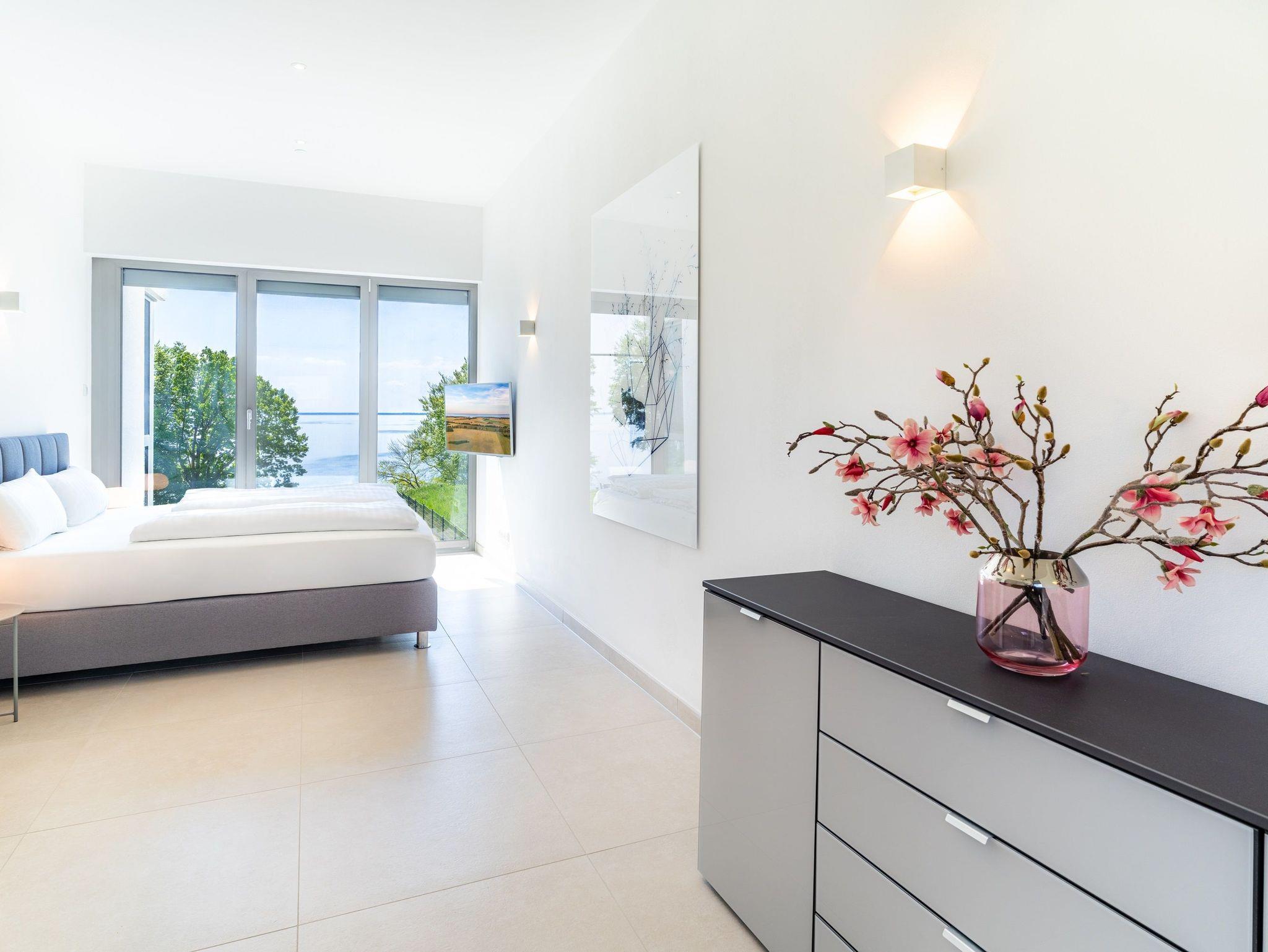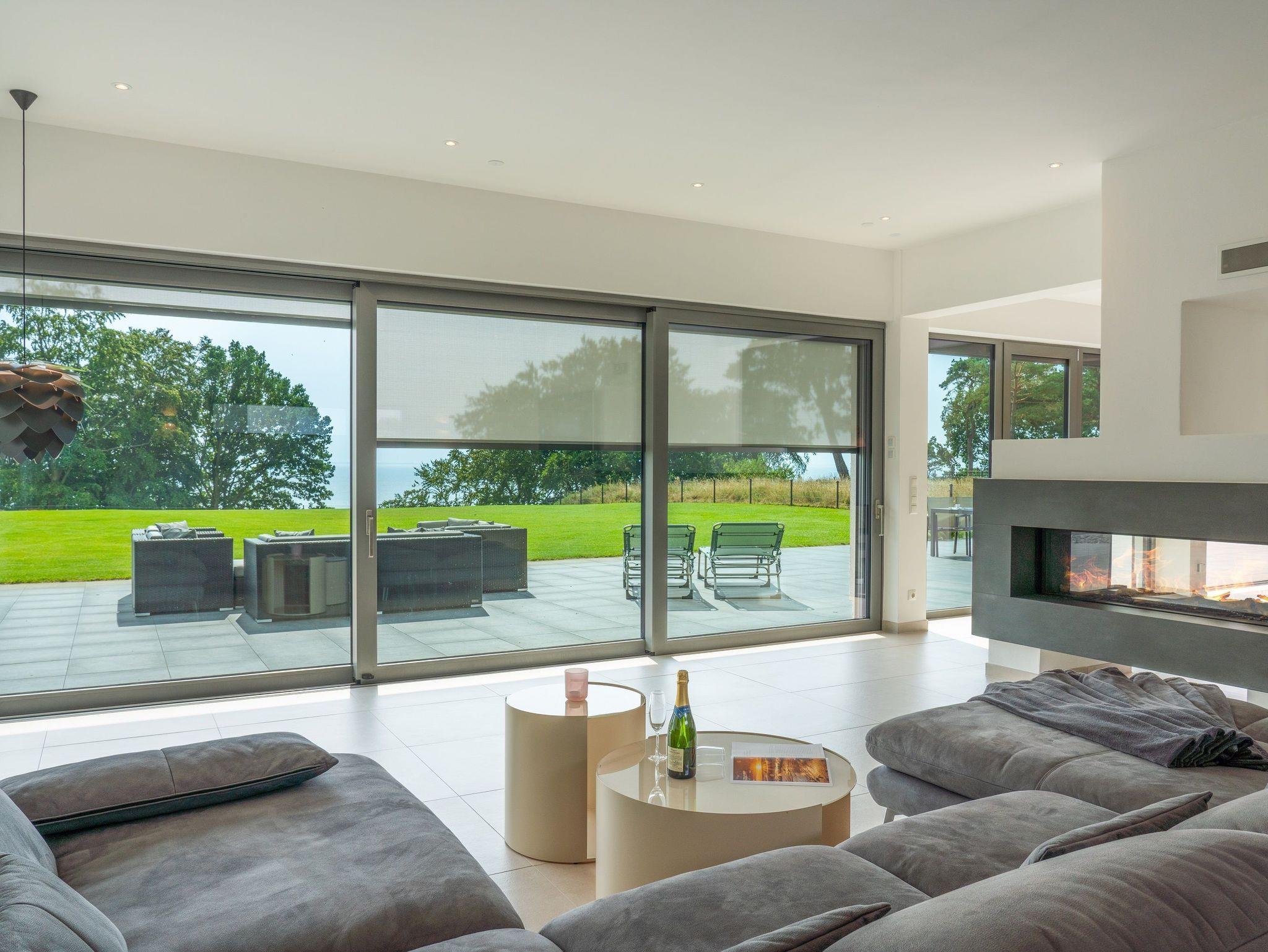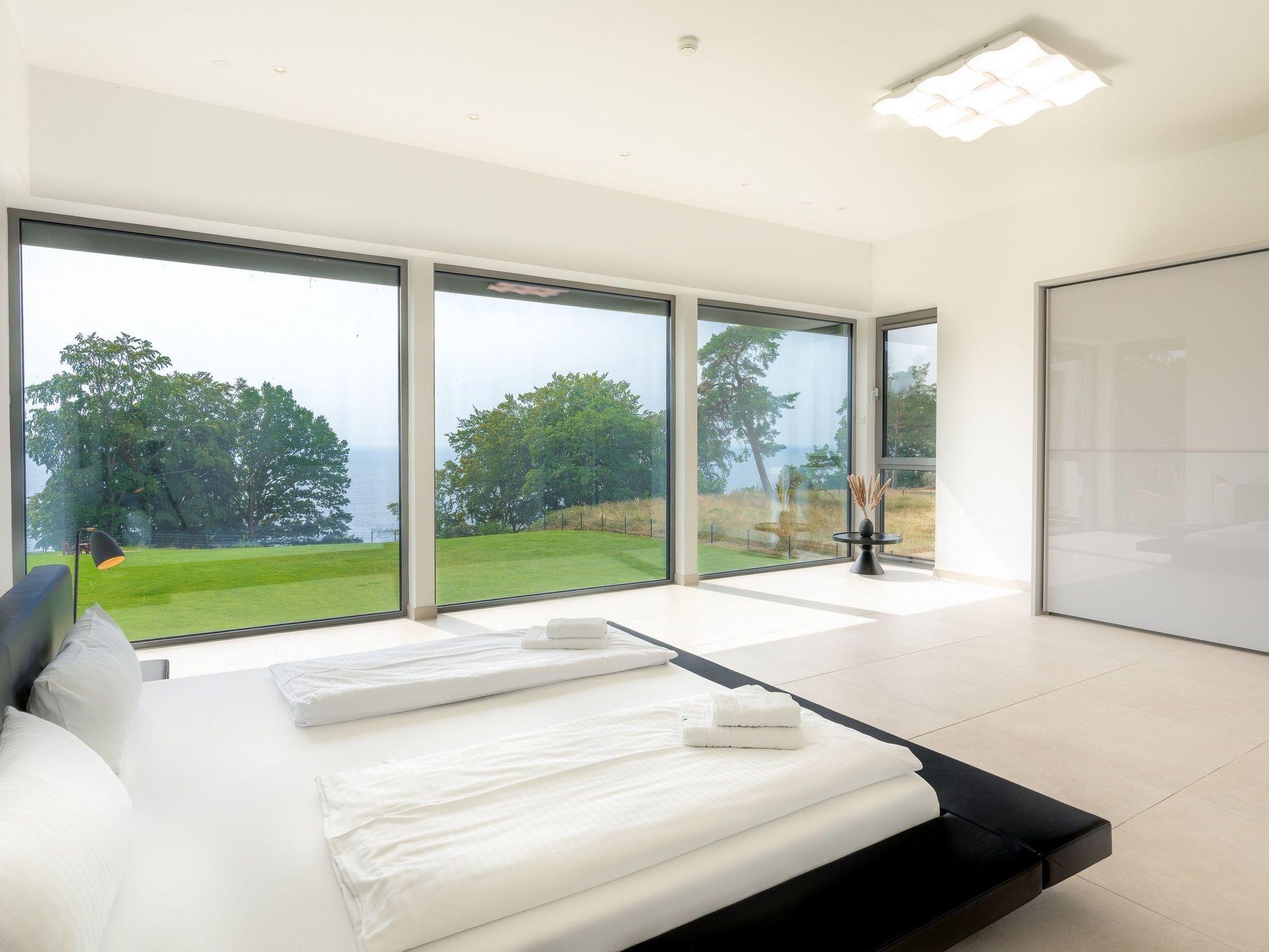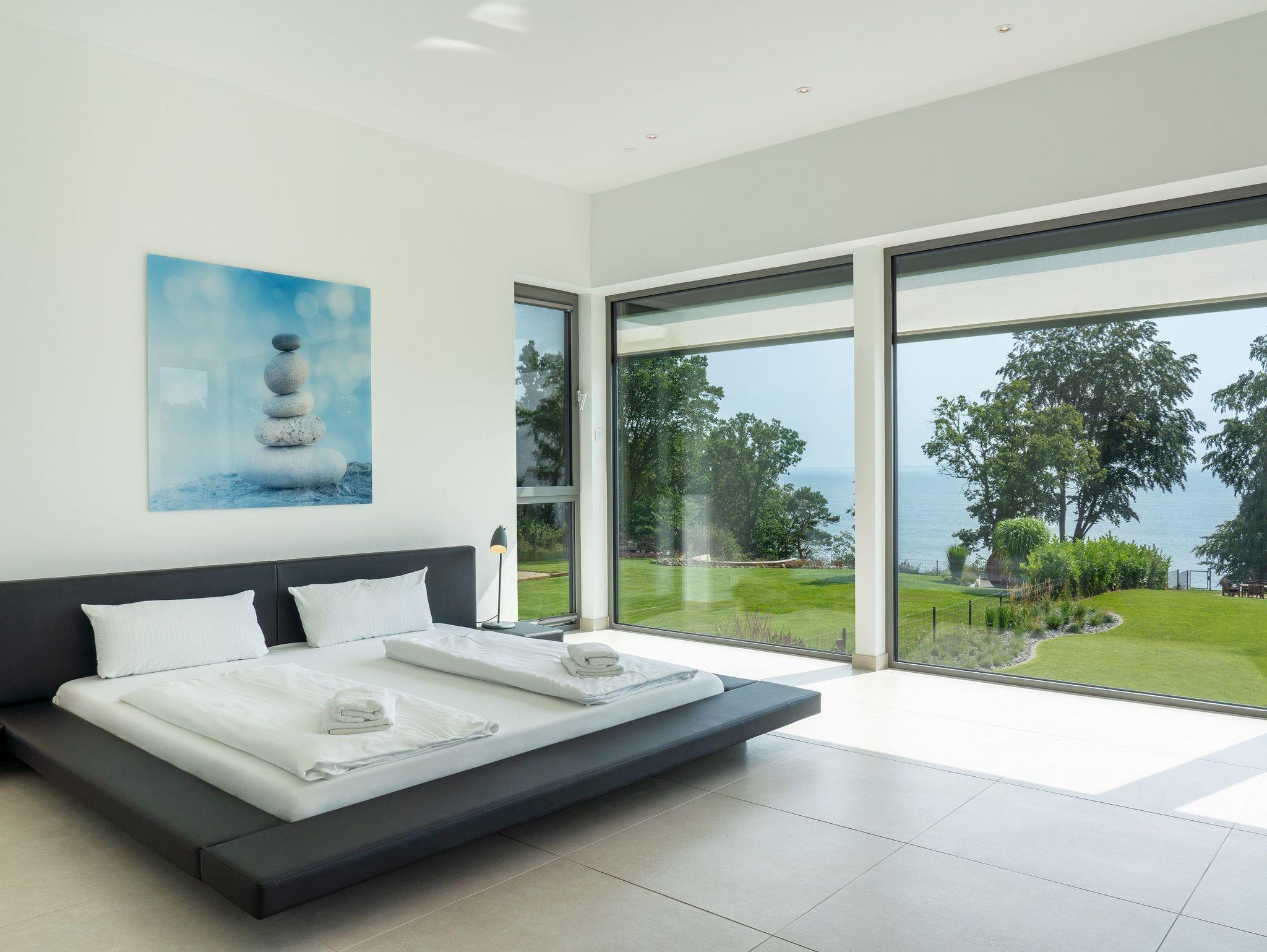 Auch in der oberen Etage genießt man den Blick auf das Haff in allen Räumen durch bodentiefe Fenster.