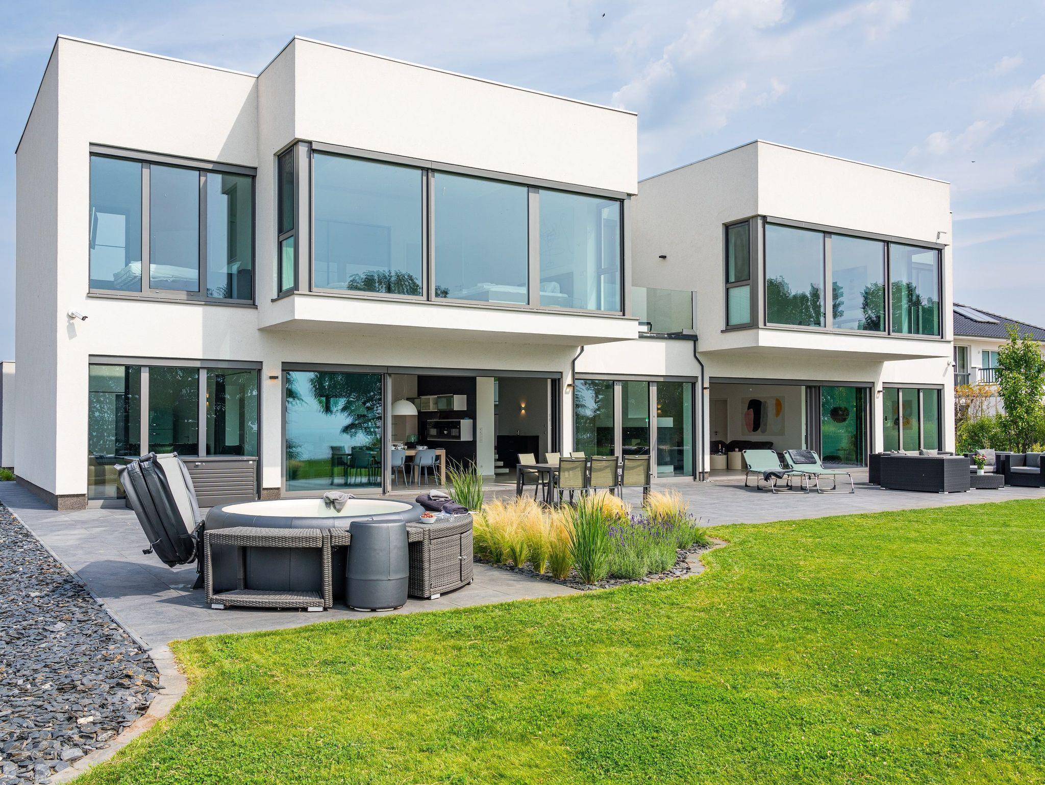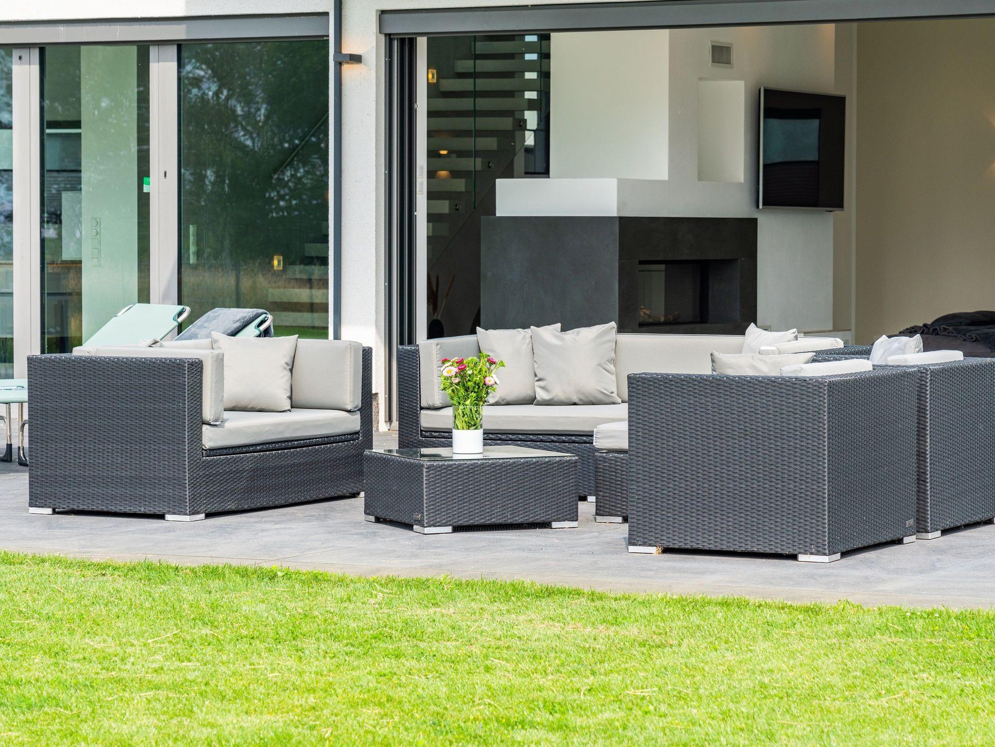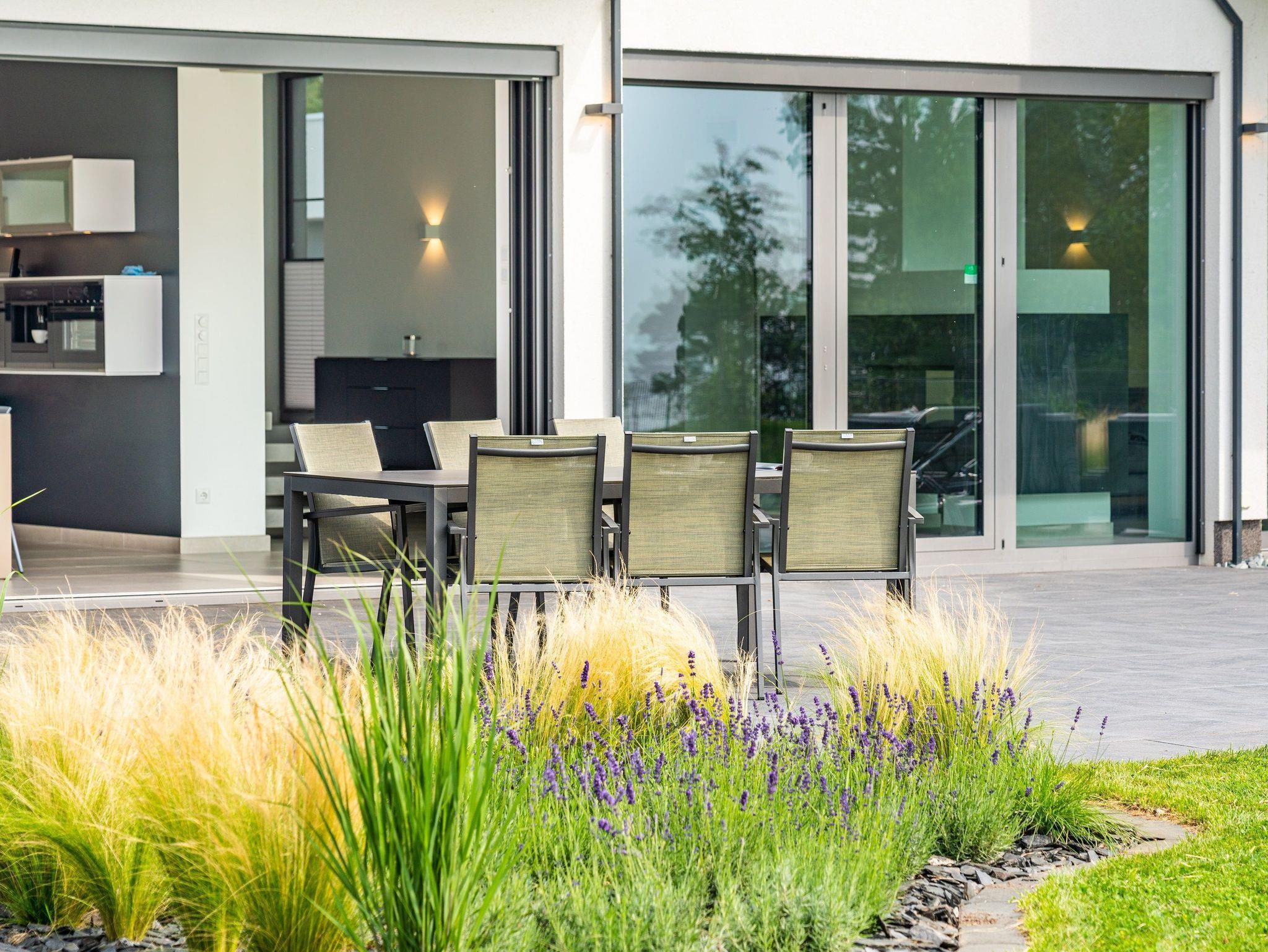 An die Rasenfläche schließt sich das Haus mit seiner 150 m² großen Terrasse an - ausgestattet mit großer Esstischgruppe, Loungebereich, Liegestühlen, Sonnenschirmen sowie einem Elektrogrill.