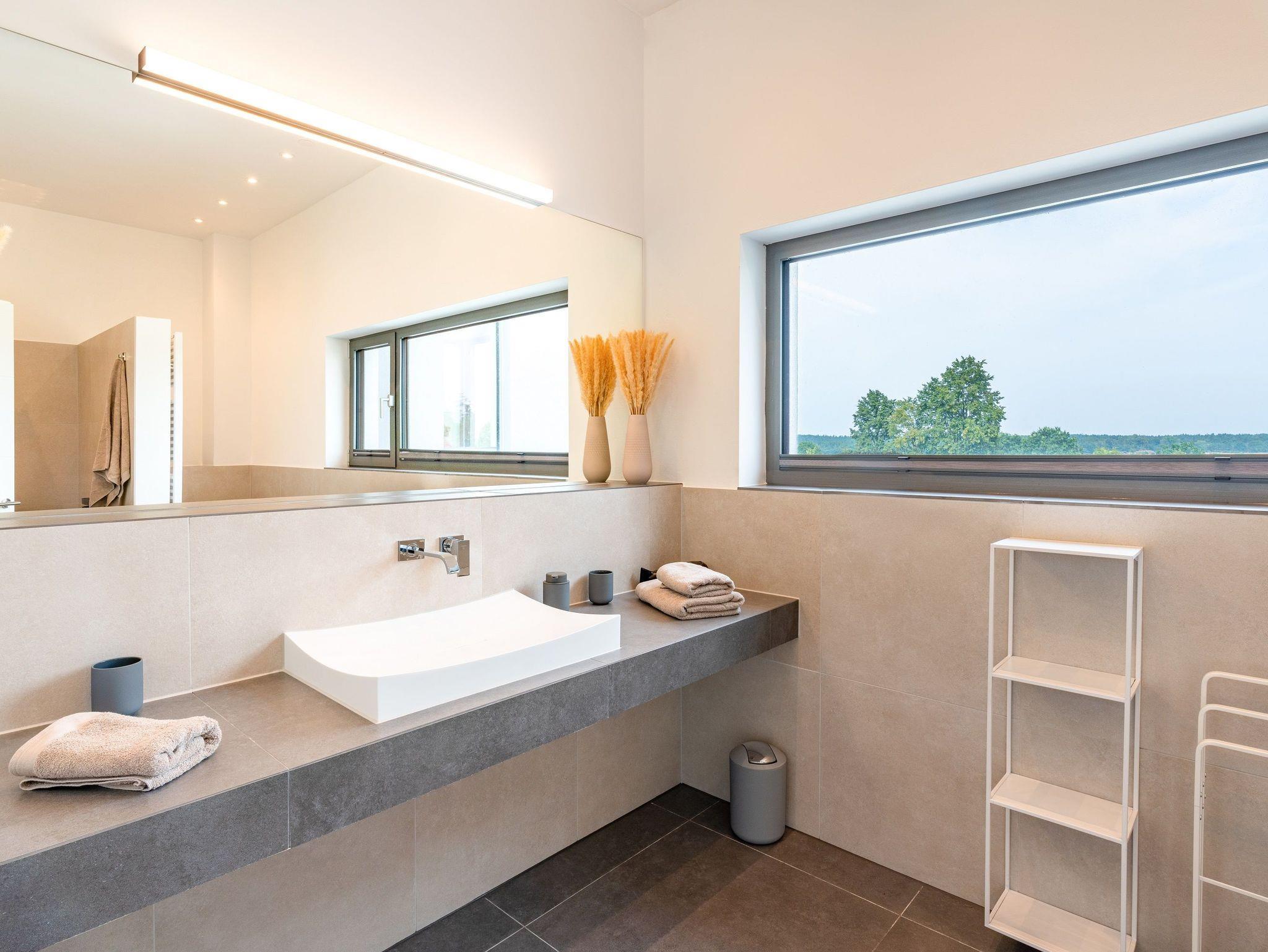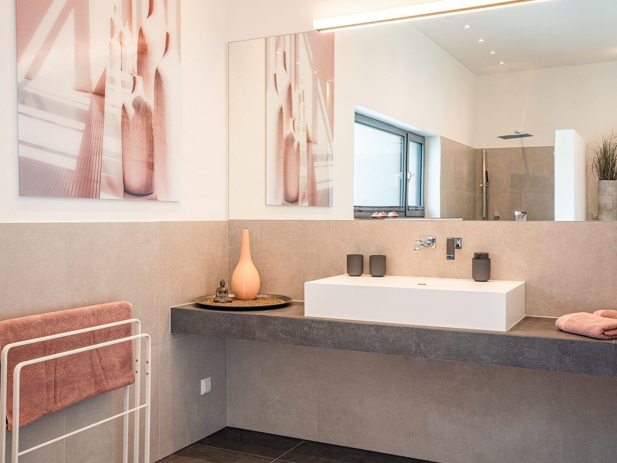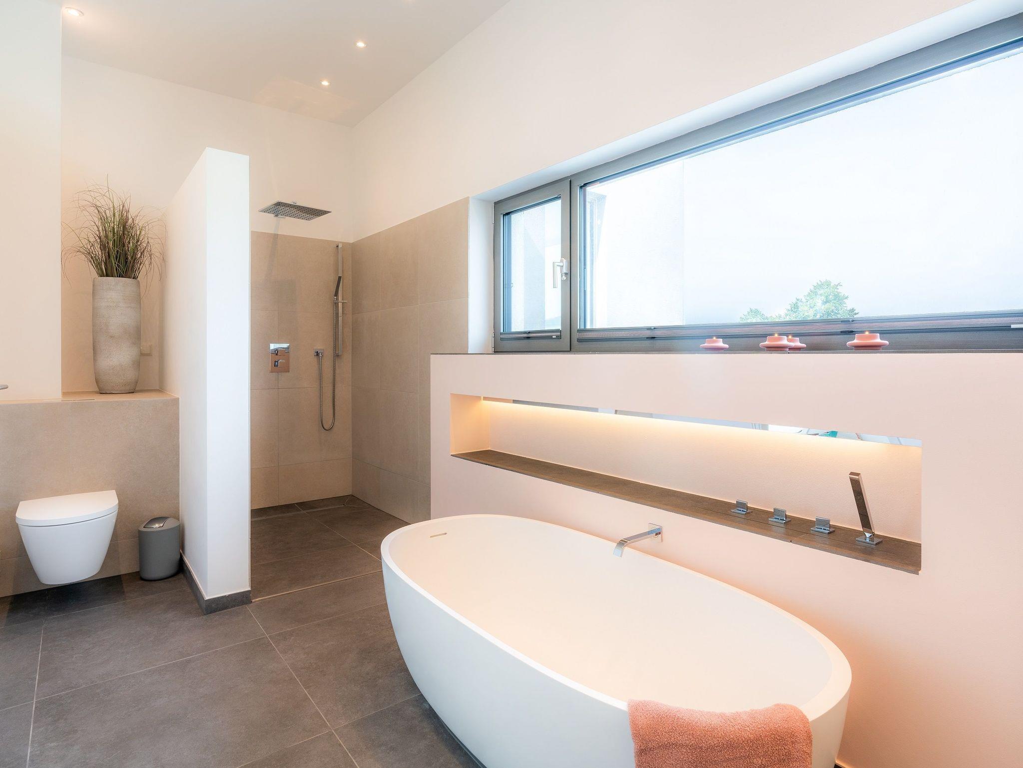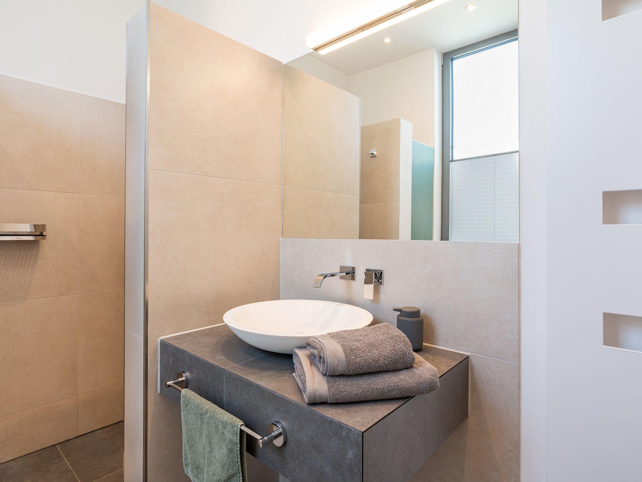 Gegenüber den beiden Schlafzimmern ist jeweils ein großes Bad gelegen, von dem eines zusätzlich zur geräumigen, bodengleichen Dusche eine freistehende Badewanne zu gemütlichen Entspannungsbädern bei Kerzenschein einlädt.