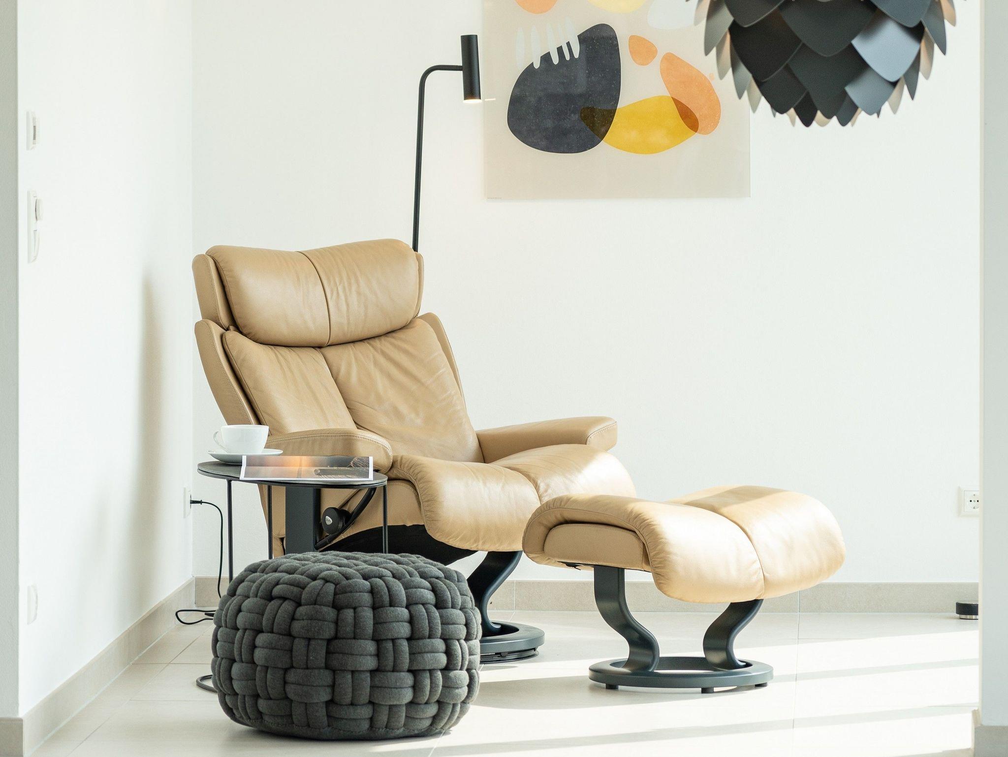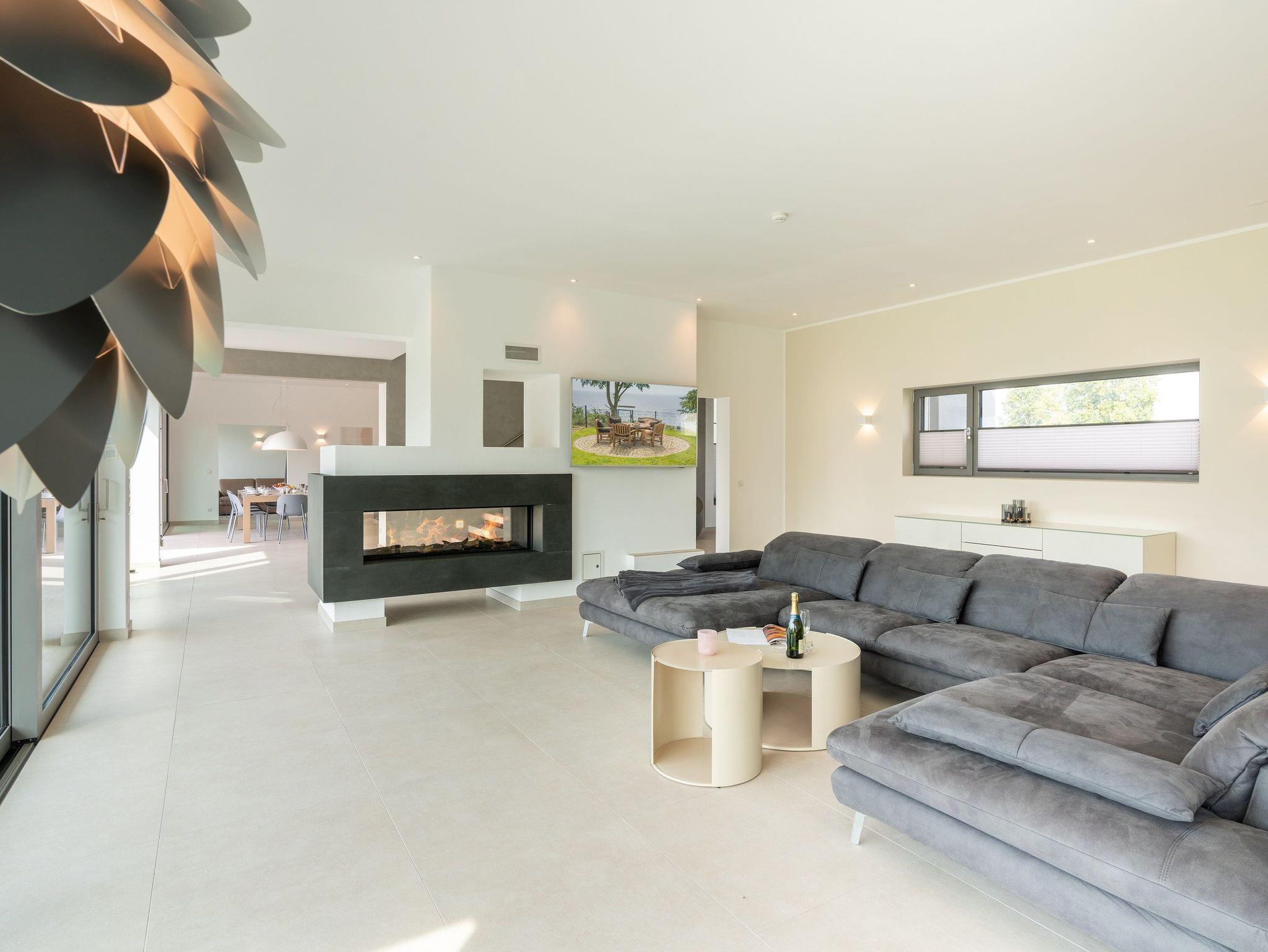 Als Raumteiler zum Eingangsbereich fungiert ein moderner Gas-Kamin, der in wenigen Minuten für wohltuende Wärme sorgt.