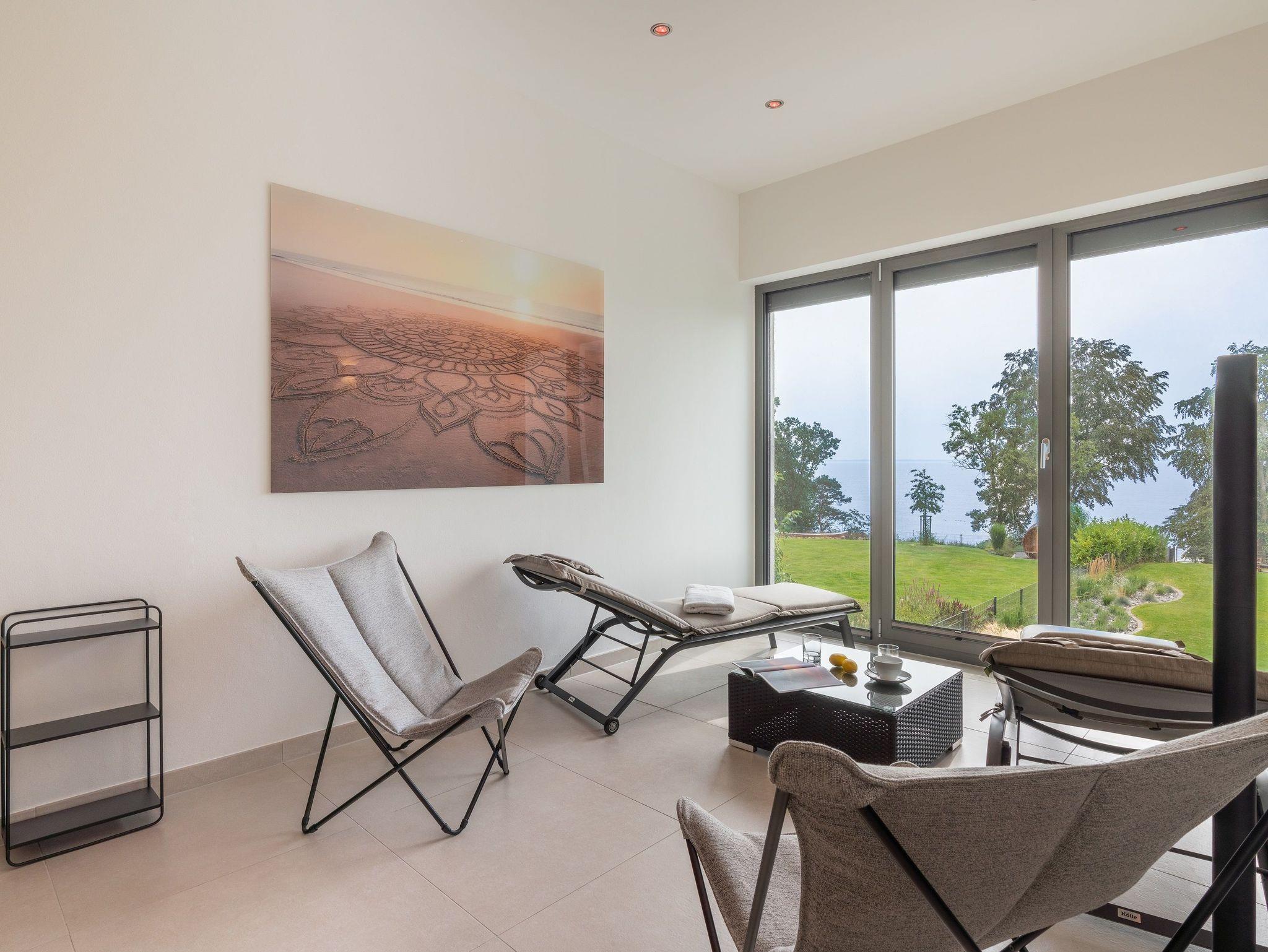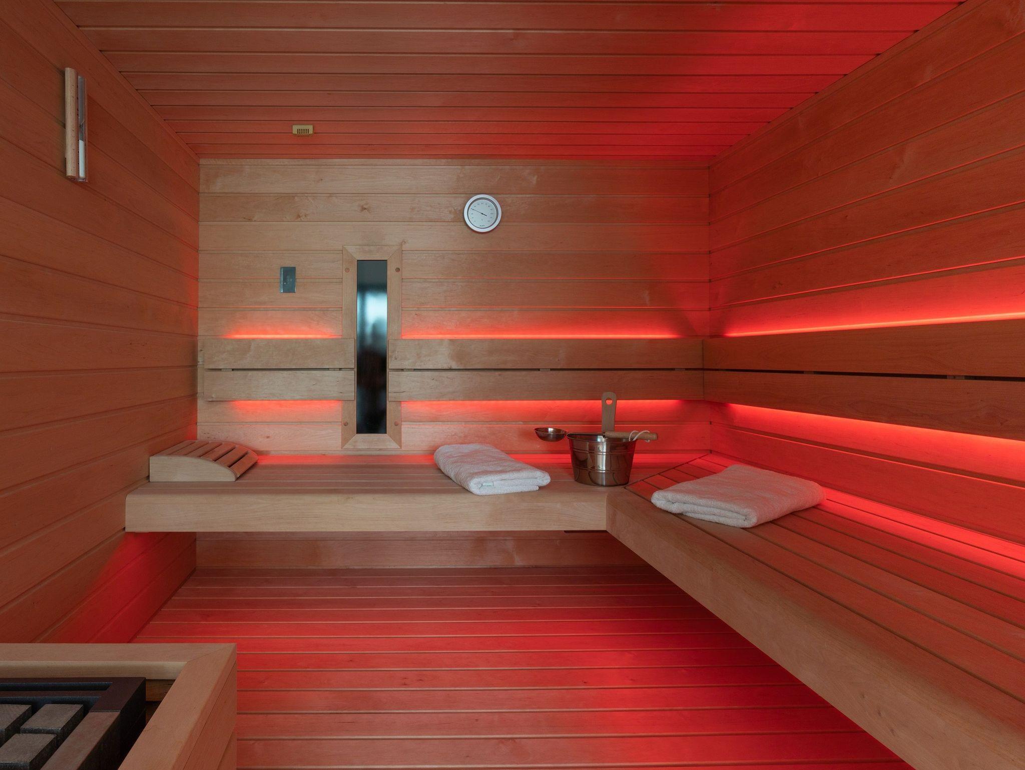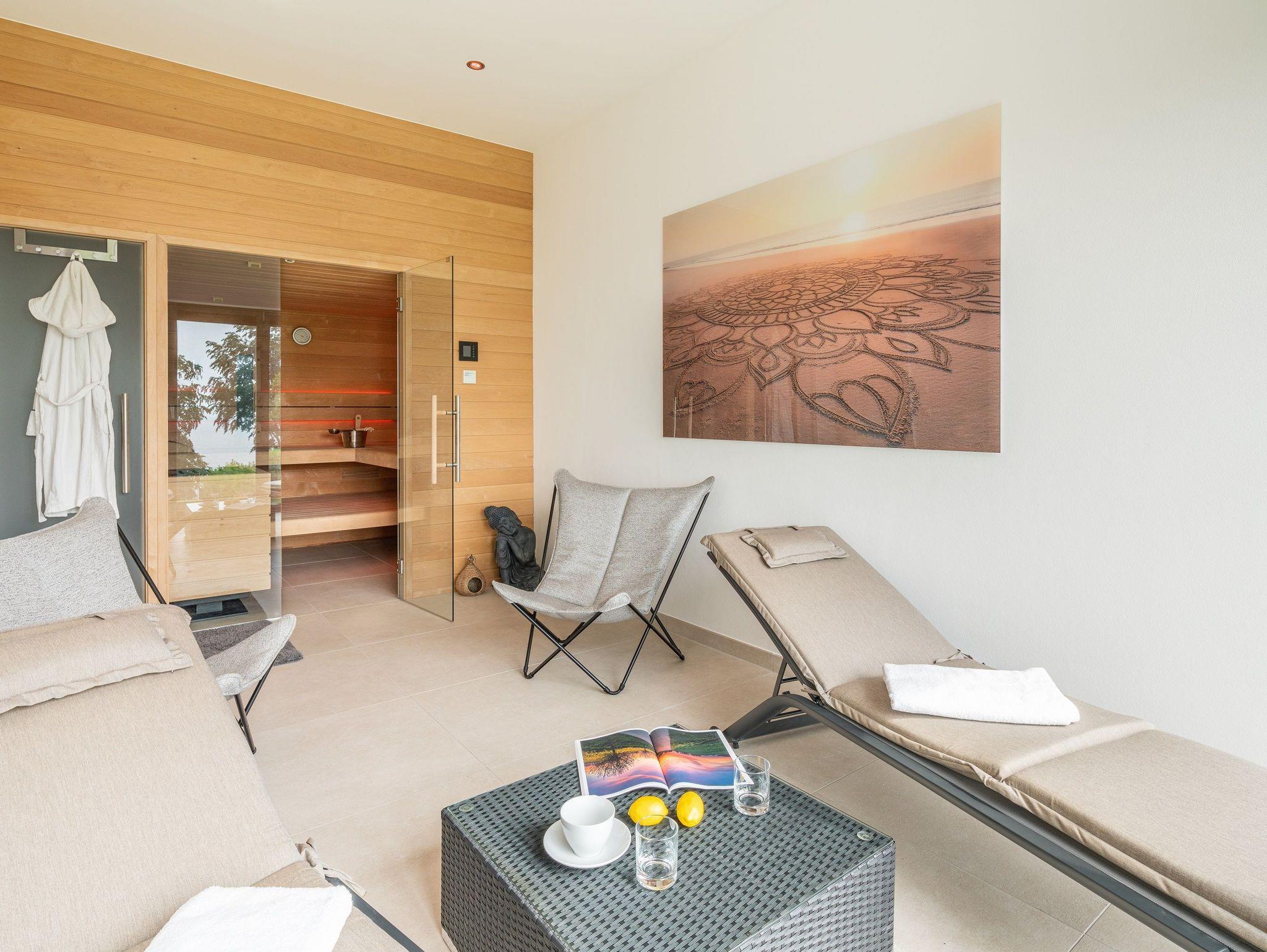 Zur Linken liegt neben dem Schlafzimmer ein Ruheraum mit einer nach vorne verglasten Sauna - stimmungsvoll gestaltet durch Beleuchtung mit Farbwechselmodus und versteckter Musikanlage, die auf Wunsch über Bluetooth mit dem Smartphone verbunden werden kann. Die Sauna ist mit einer Infrarot-Funktion ausgestattet.