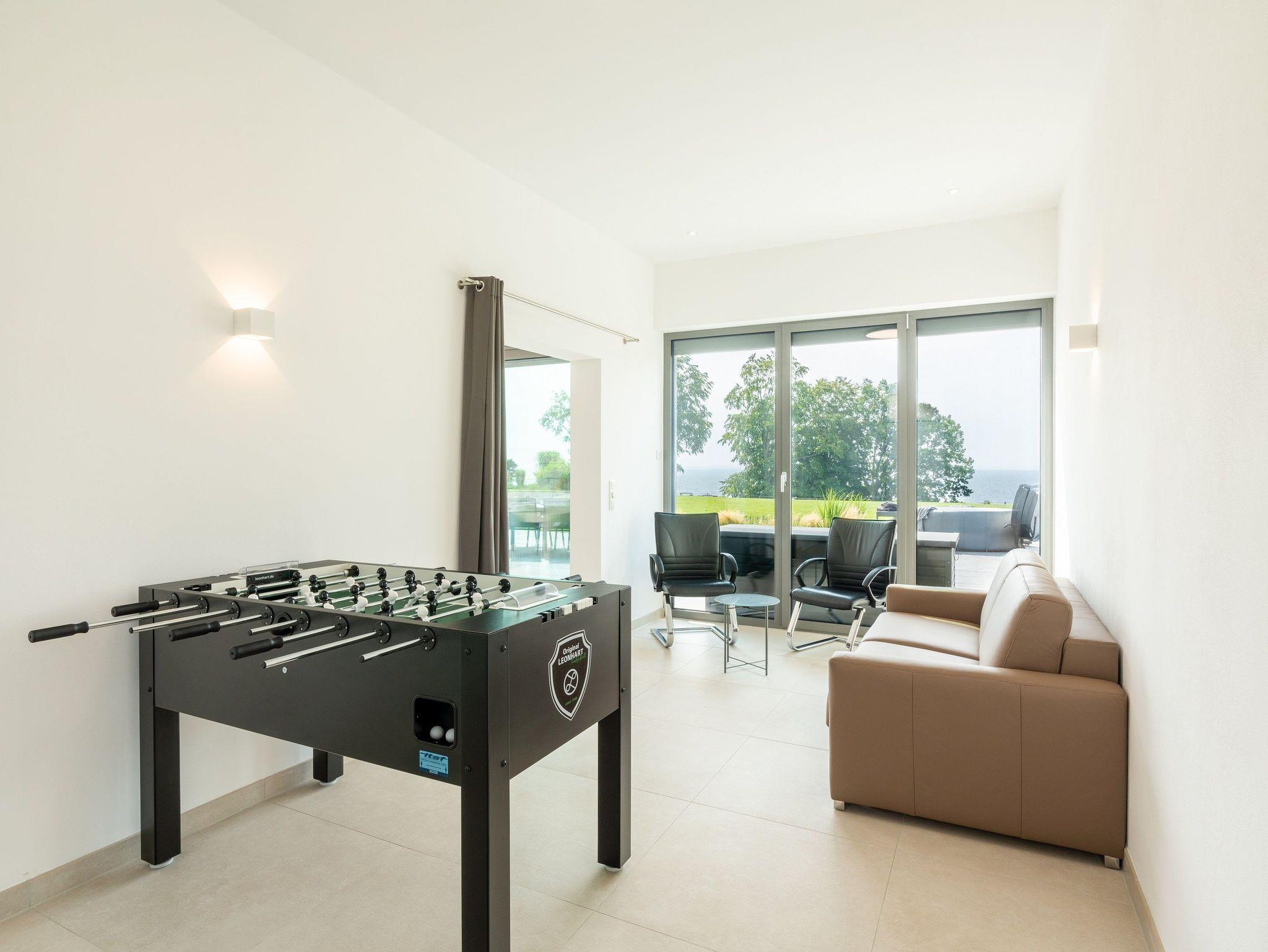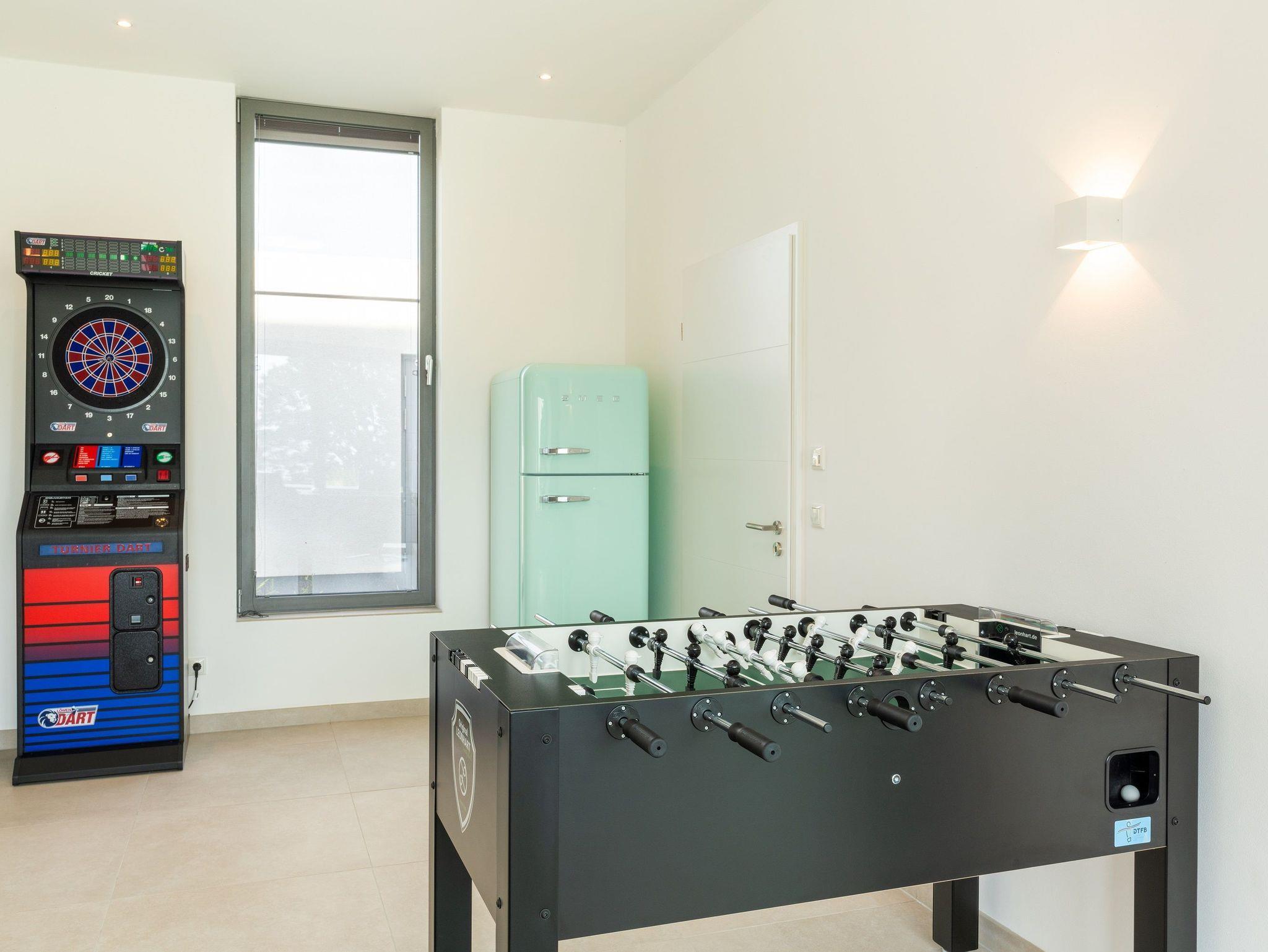 An den Essbereich schließt ein offener Freizeitraum mit Turnierdart und Kicker sowie einem weiteren Kühlschrank mit geräumigem Eisfach an.