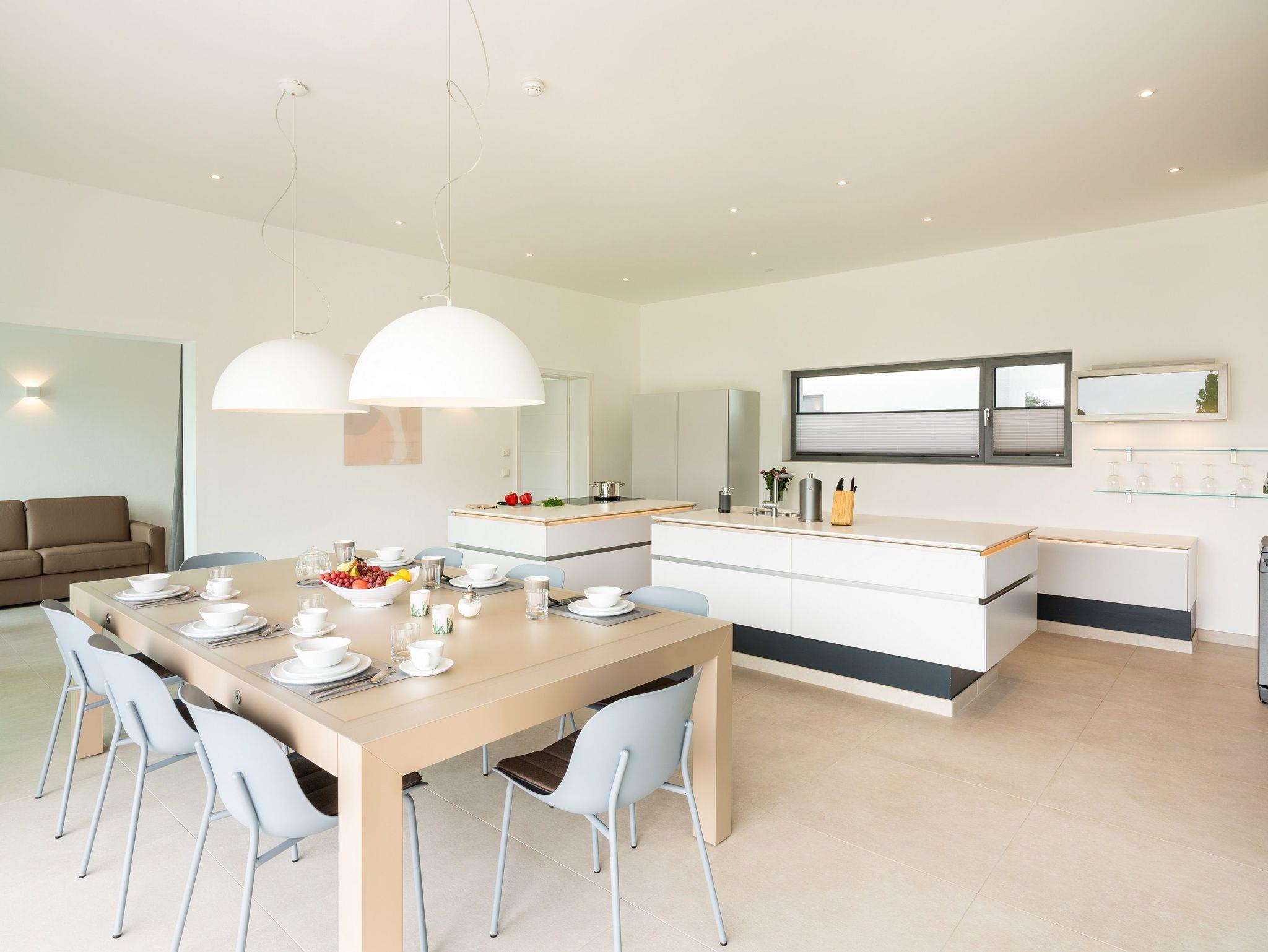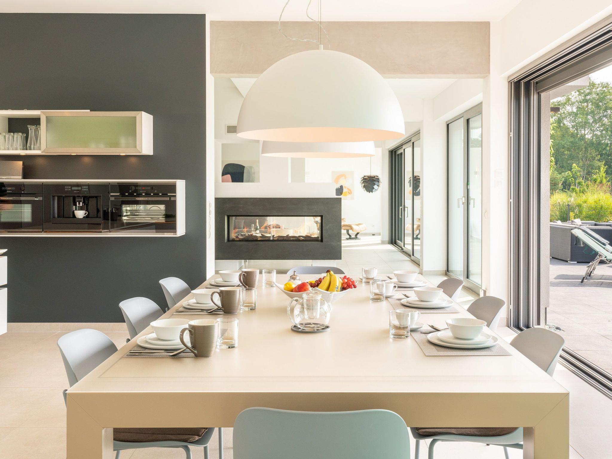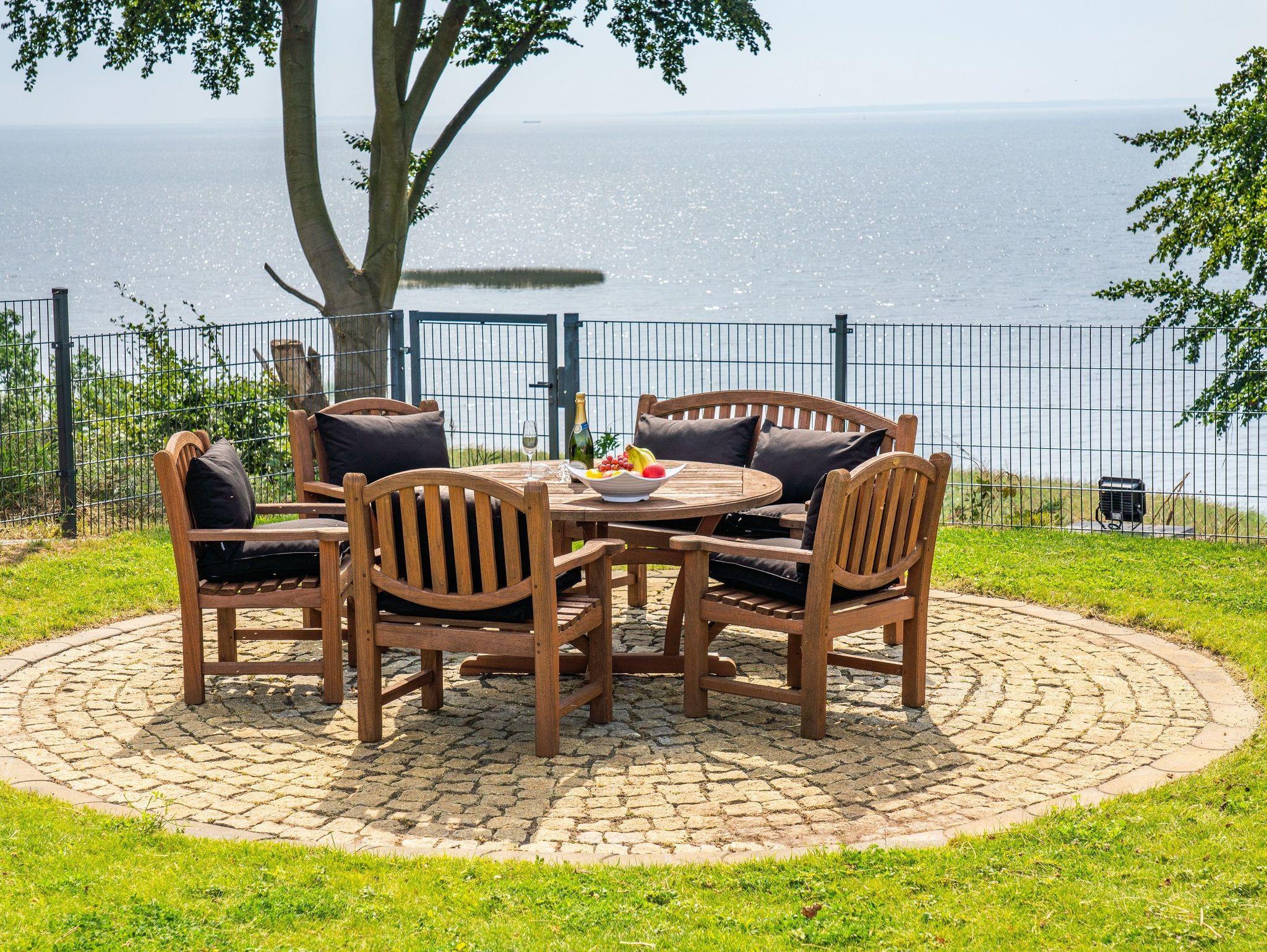 Vom großen Esstisch, an dem bis zu 8 Personen bequem Platz finden, genießen Sie den Blick auf den Garten und das Haff beim gemeinsamen Frühstück. Auch hier lassen sich die bodentiefen Fenster fast vollständig öffnen.