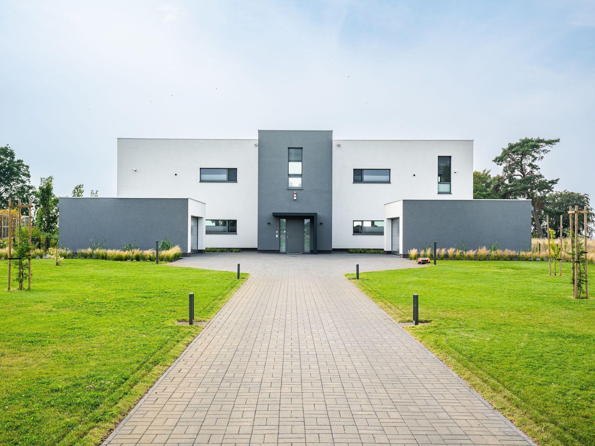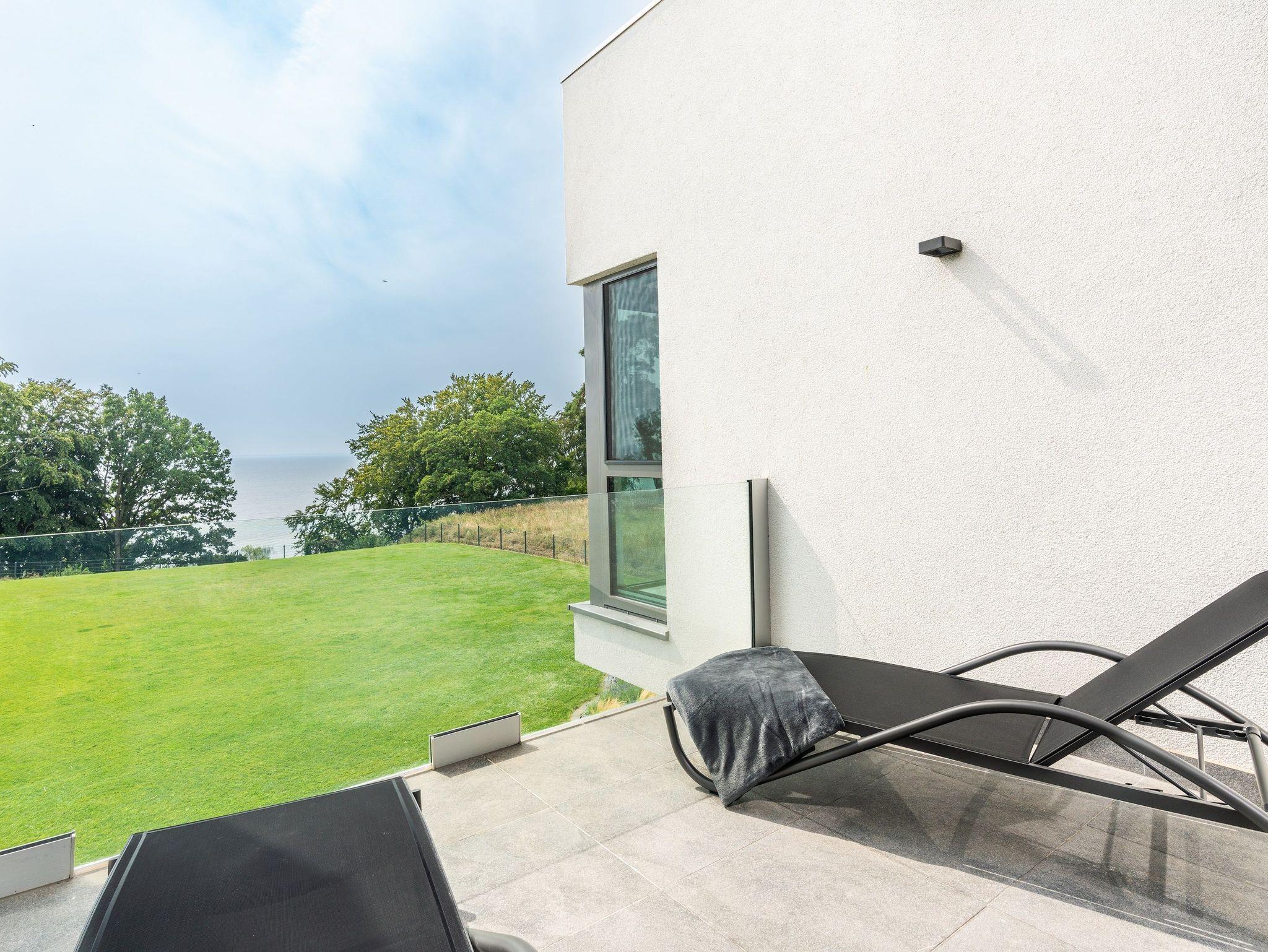 Die moderne, im Bauhausstil errichtete, 400 m² große Villa befindet sich auf einem insgesamt 6.000 m² großen Grundstück, dessen unterhalb der Kliffkante gelegene Hälfte komplett naturbelassen ist. Neben altem Baumbestand, der abends stimmungsvoll beleuchtet wird, befindet sich dort ein breiter Schilfgürtel, der bis an das Haff reicht.