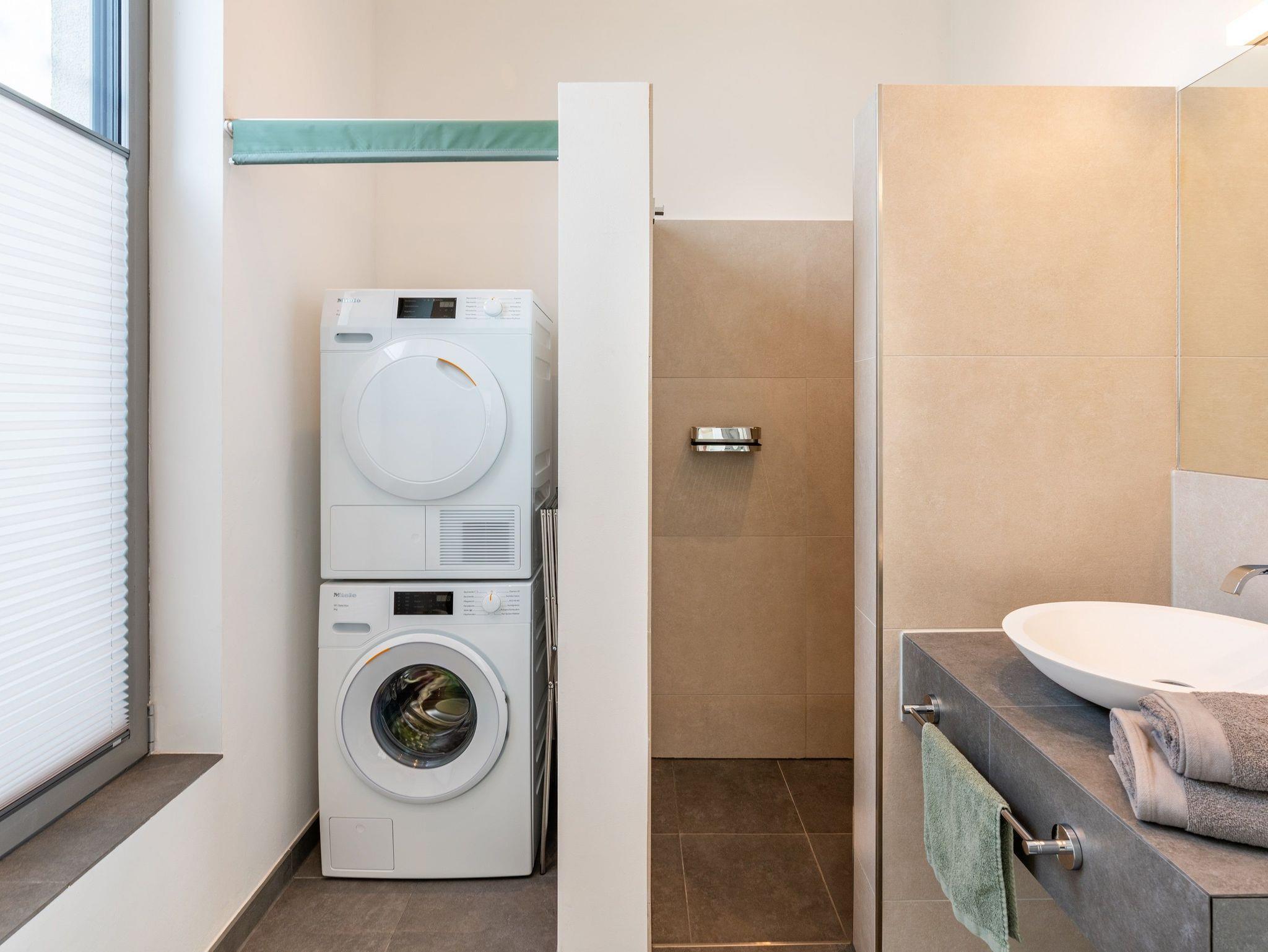 Im Erdgeschoss befindet sich ein Gästebad, das neben Waschbecken, WC und Dusche mit einer Waschmaschine und einem Wäschetrockner zur freien Verfügung ausgestattet ist.