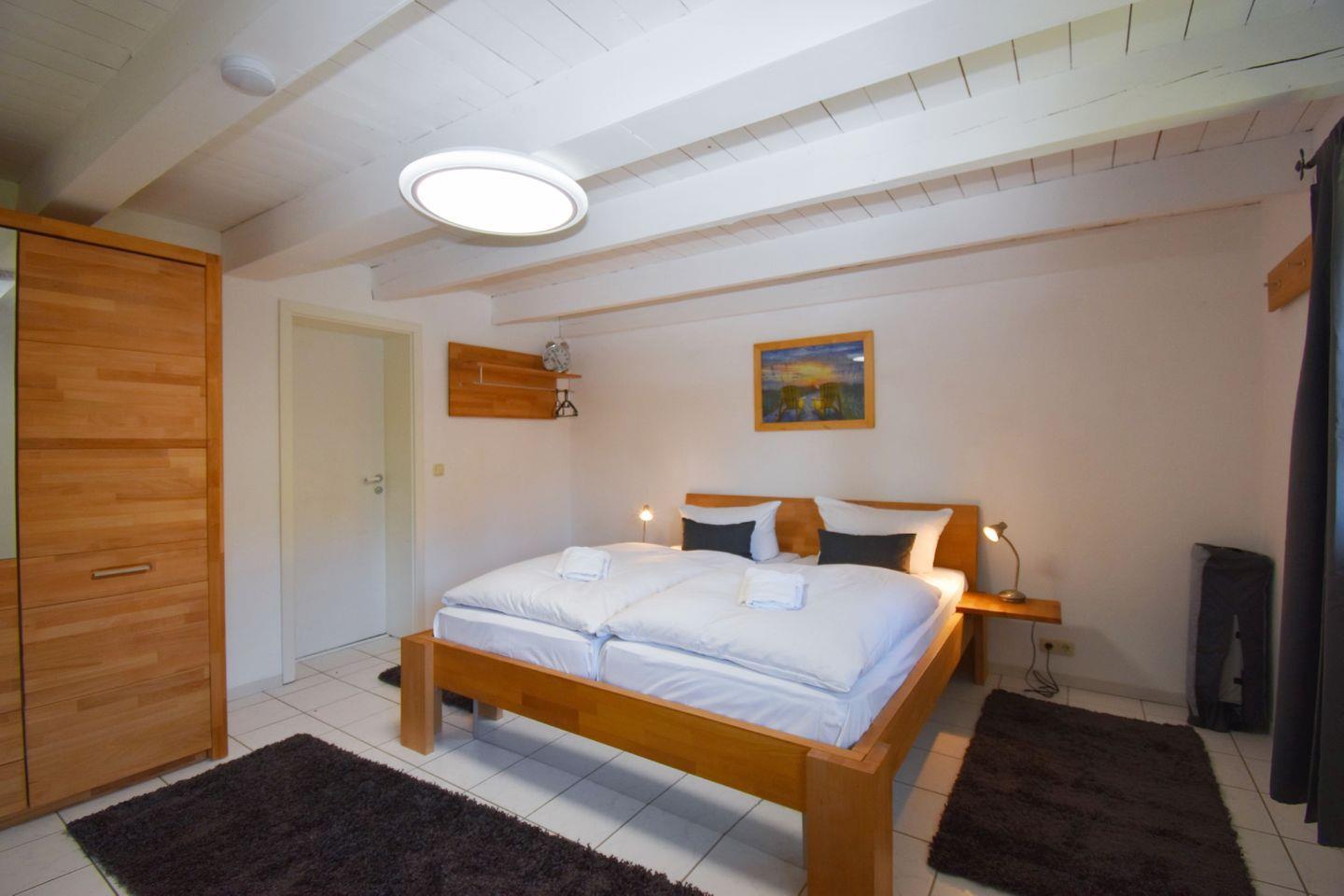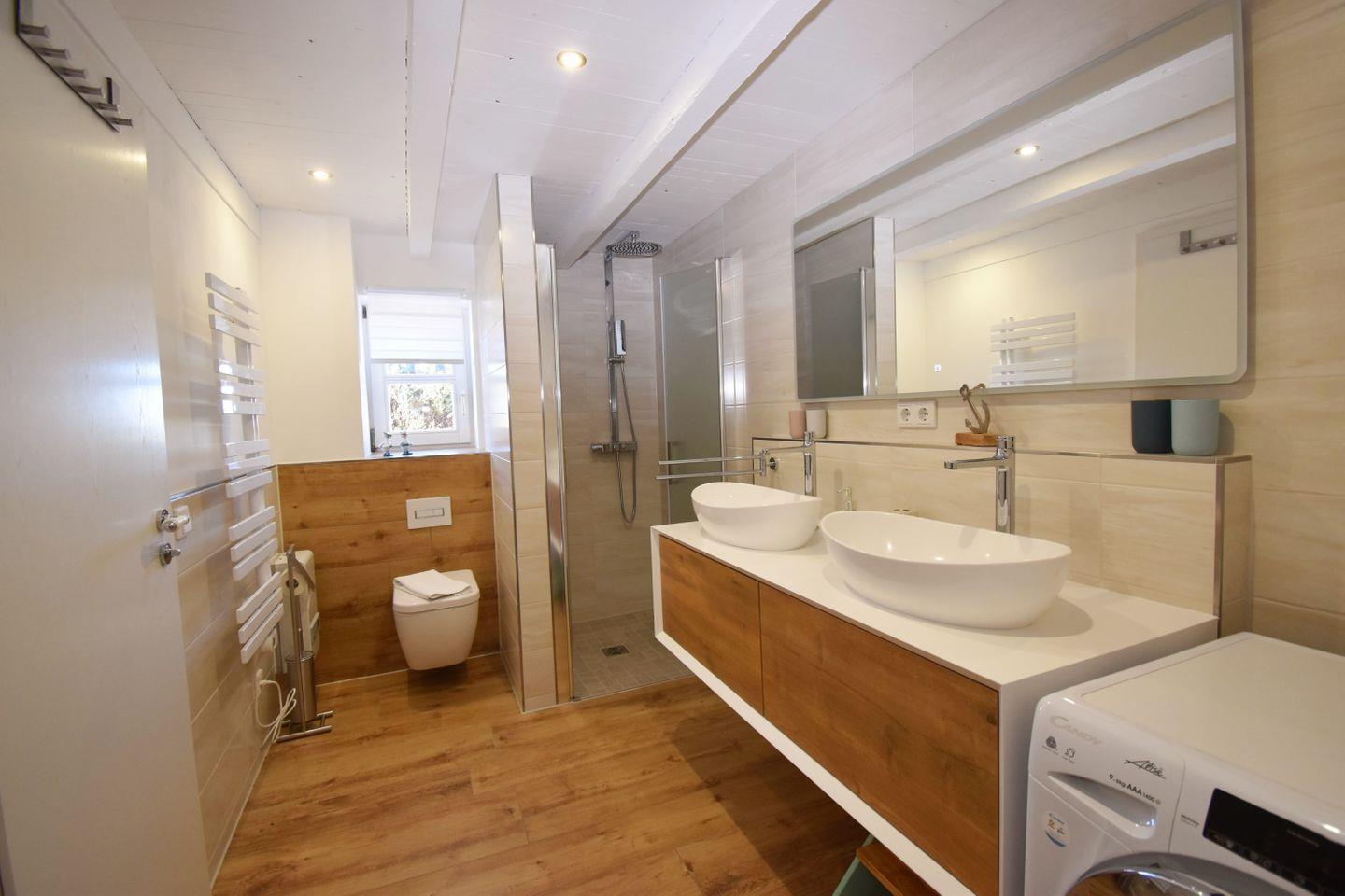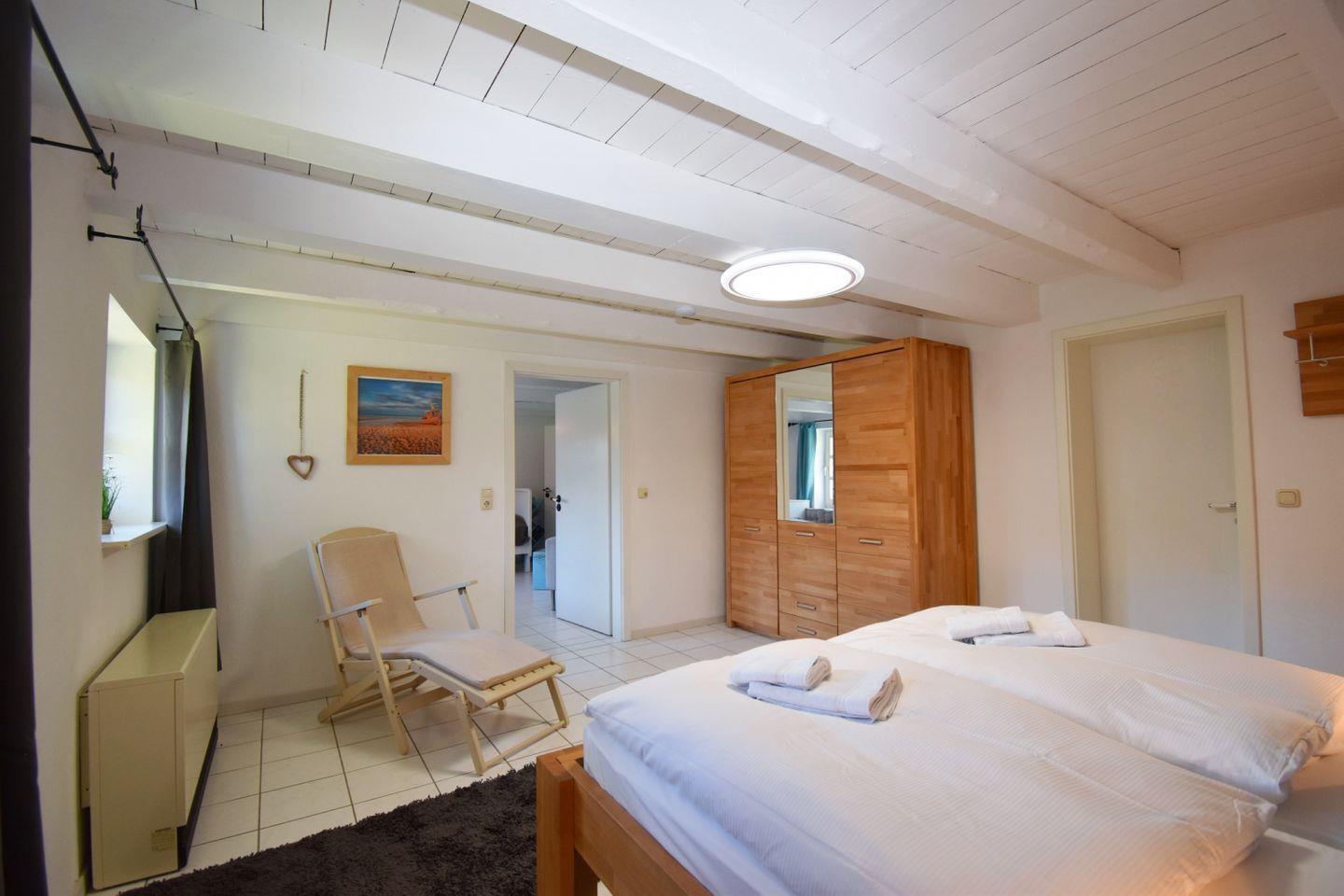 Die 110?m² große Wohnung erstreckt sich über zwei Etagen und verbindet gemütlichen Wohnkomfort mit nostalgischem Flair. Im Erdgeschoss liegen zwei Schlafzimmer: ein Zimmer mit Doppelbett und ein weiteres mit zwei Einzelbetten – ideal für Familien oder kleine Gruppen. Die großzügige Küche lädt zu gemeinsamen Kochabenden ein und bietet direkten Zugang zum hellen Duschbad, das auch vom Elternschlafzimmer erreichbar ist.