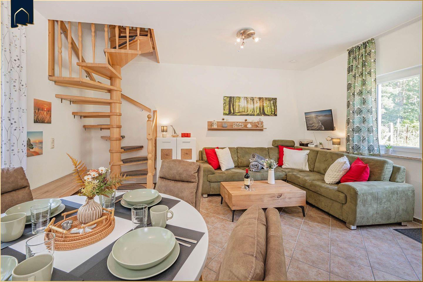 Diese charmante Ferienwohnung bietet Ihnen eine erholsame Auszeit in naturnaher Lage – ideal für alle, die Ruhe suchen und dennoch nicht auf Komfort verzichten möchten. Auf 71 m² Wohnfläche, verteilt auf einer Ebene, erwartet Sie eine liebevoll eingerichtete Unterkunft mit zwei separaten Schlafzimmern, einem modernen Duschbad und einem gemütlichen Wohnbereich. Die voll ausgestattete Küche mit Backofen, Herd, Geschirrspüler, Mikrowelle, Kaffeemaschine, Wasserkocher und Toaster lässt keine Wünsche offen. Ob Frühstück im Freien, entspannte Abende im Wohnzimmer oder ein Saunagang – hier ist für Erholung gesorgt.