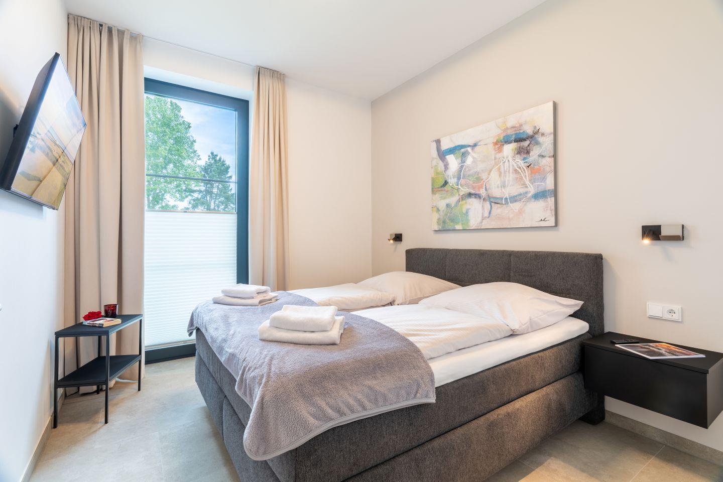 Alle drei Schlafzimmer bieten ein hochwertiges Boxspringbett (200 x 200 im Master-Schlafzimmer, 180 x 200 cm in weiteren Schlafzimmern), Einbauschränke, sowie einen Smart-TV. Das en suite Badezimmer im Hauptschlafzimmer mit begehbarer Dusche und freistehender Badewanne rundet den Komfort ab. Zusäzliches Schmankerl im Hauptschlafzimmer: Meerblick auf das Stettiner Haff und direkter Zugang zur Terrasse. Im zweiten, voll ausgestatteten Badezimmer steht Ihnen ebenfalls eine begehbare Dusche zur Verfügung.
