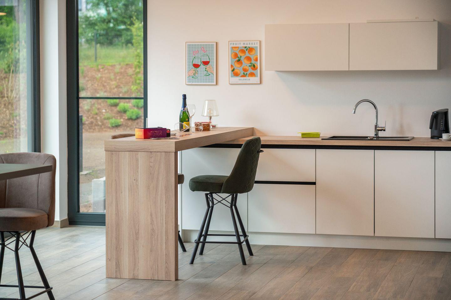 Die Küche (Hersteller: elementa) mit großer, freistehender Kochinsel und edlen Hochglanz-Fronten aus nachhaltigen Materialien ist ausgestattet mit hochwertigen Siemens-Elektrogeräten. Dazu zählen: Kühl-Gefrier-Kombination, Induktionsherd mit Bora Abluftsystem, Backofen und Mikrowelle. Porzellan, Kochgeschirr und alle notwendigen Küchenutensilien stehen für Sie bereit. Haushaltsgeräte wie Staubsauger, Besen und Wischer sind im Wandschrank in der Diele verstaut.