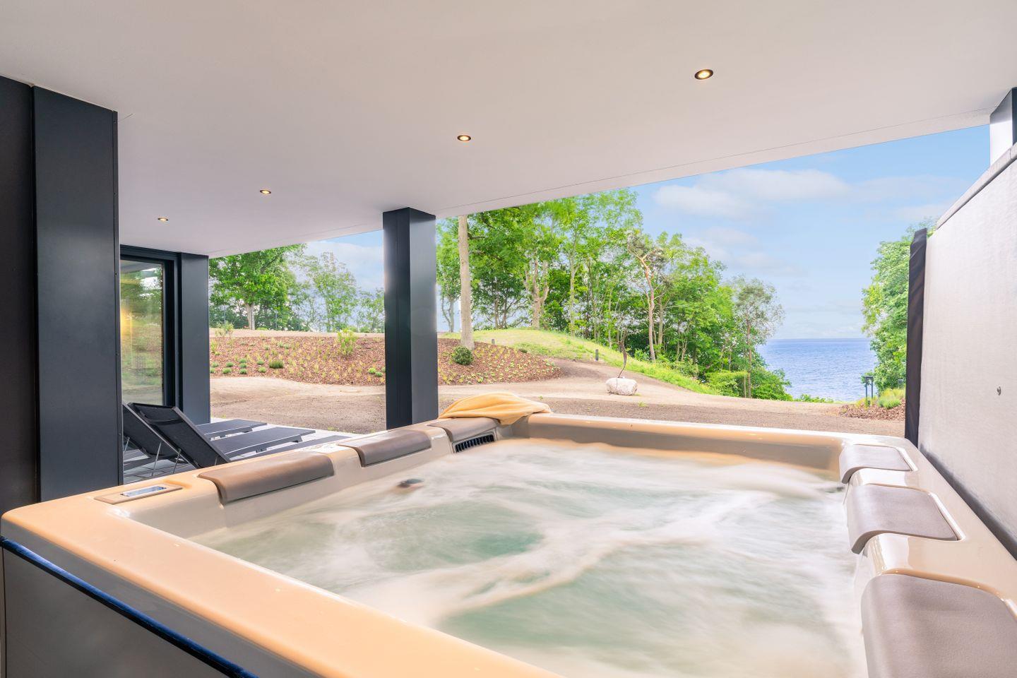Die 28 m² große, überdachte Terrasse mit traumhaftem Blick auf das Stettiner Haff wird schnell zum Highlight Ihres Aufenthalts. Ausgestattet mit Heizstrahler, Seitenmarkise, großem Esstisch, Relaxsesseln und Sonnenliegen, bietet er einen geschützten Ort zum Genießen, Sonnenbaden oder Verweilen – ganz privat, ganz für Sie.