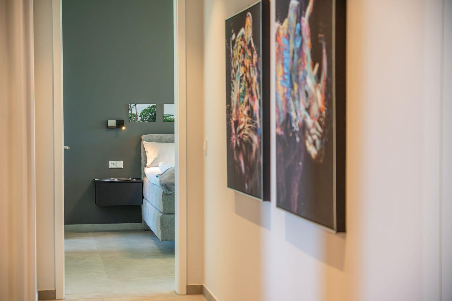 Die drei Schlafzimmer bieten höchsten Schlafkomfort mit Boxspringbetten (200 x 200 cm im Master-Schlafzimmer, 180 x 200 cm in den weiteren Zimmern), maßgefertigten Einbauschränken und Smart-TVs. Das Hauptschlafzimmer überzeugt zusätzlich mit eigenem Bad en suite, freistehender Badewanne, begehbarer Dusche, Meerblick und direktem Zugang zur Terrasse.