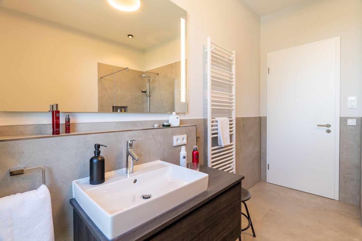 Das Hauptschlafzimmer verfügt über ein elegantes Bad en suite mit bodengleicher Dusche und freistehender Badewanne. Der direkte Zugang zum Balkon und der herrliche Ausblick über das Haff verleihen diesem Raum besondere Qualität – ein privater Ort für entspannte Morgen und stille Abende.