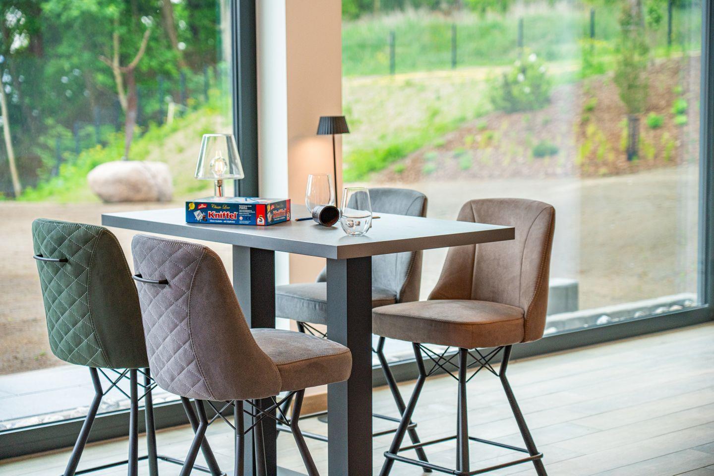 Am stilvollen Esstisch mit sechs bequemen Stühlen genießen Sie nicht nur gemeinsame Mahlzeiten, sondern auch einen unverstellten Blick über das Haff. Der angrenzende Wohnbereich mit Ledersofa, drehbarem Sessel und Smart-TV lädt zum Verweilen ein – ergänzt durch einen elegant inszenierten Gaskamin, der auf Knopfdruck für behagliche Atmosphäre sorgt.