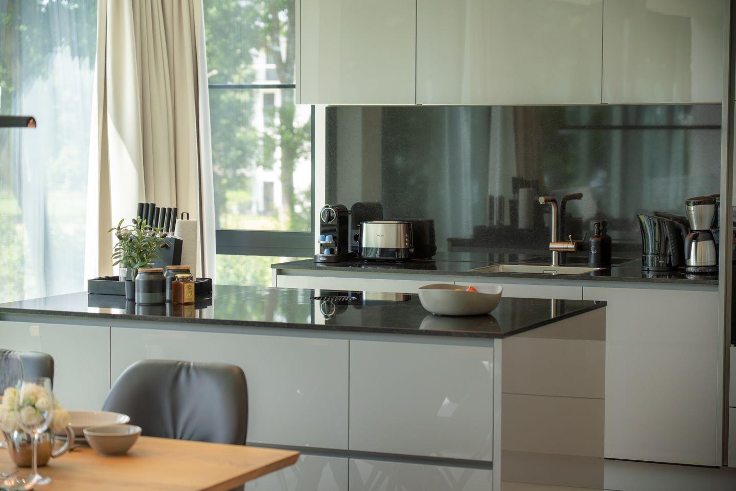 Die offene elementa-Küche überzeugt mit edlen Materialien, Hochglanzfronten in nachhaltiger Verarbeitung und einer großzügigen Kochinsel. Ausgestattet mit Siemens-Einbaugeräten – darunter Induktionsfeld mit Bora-Abluftsystem, Backofen, Mikrowelle, Kühl-Gefrier-Kombination – wird Kochen hier zum Erlebnis.