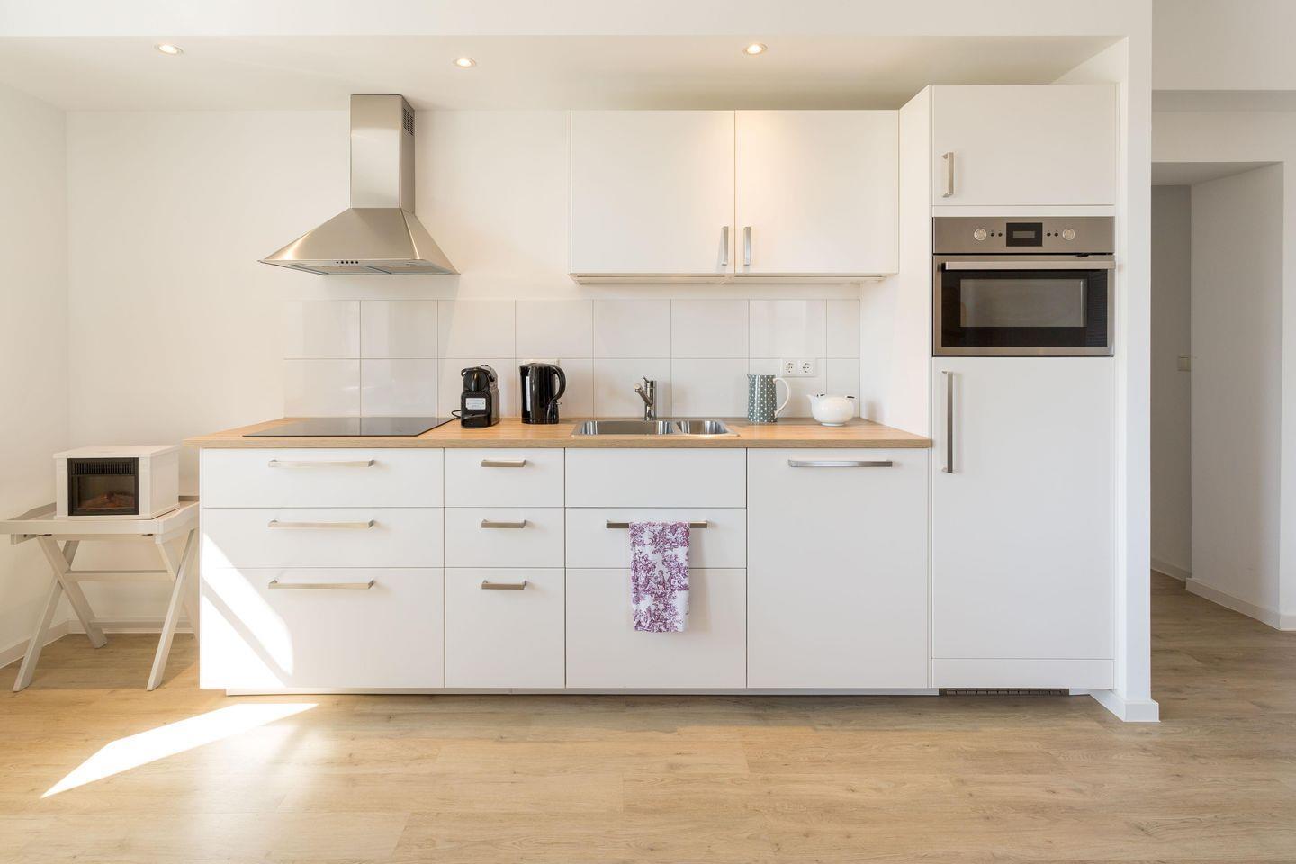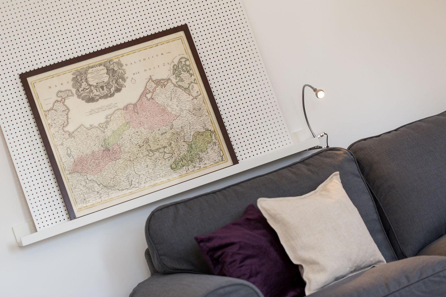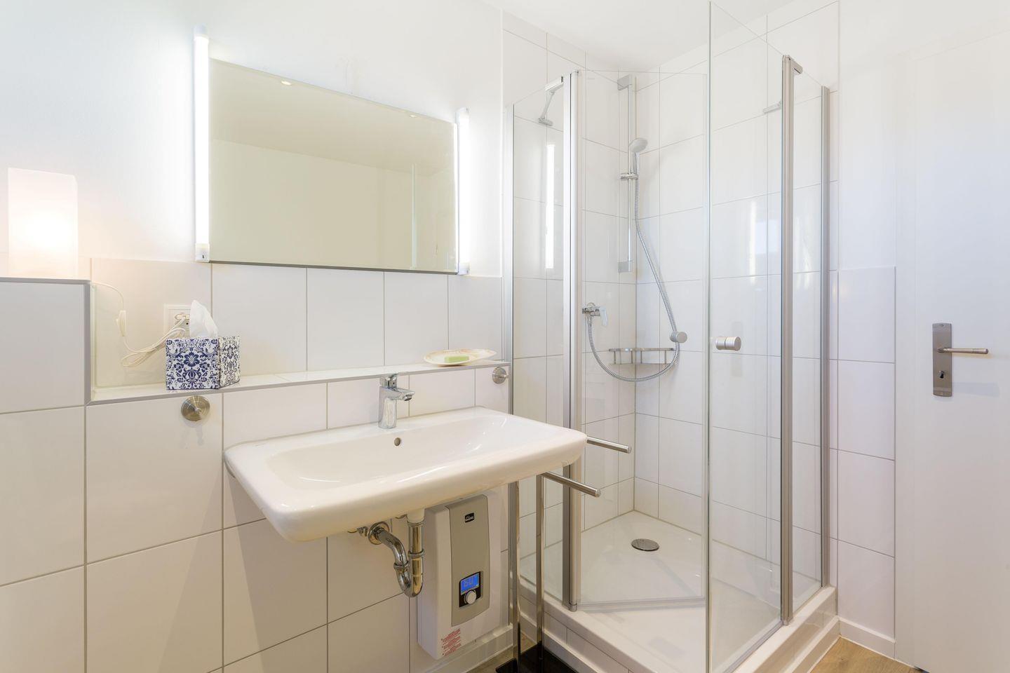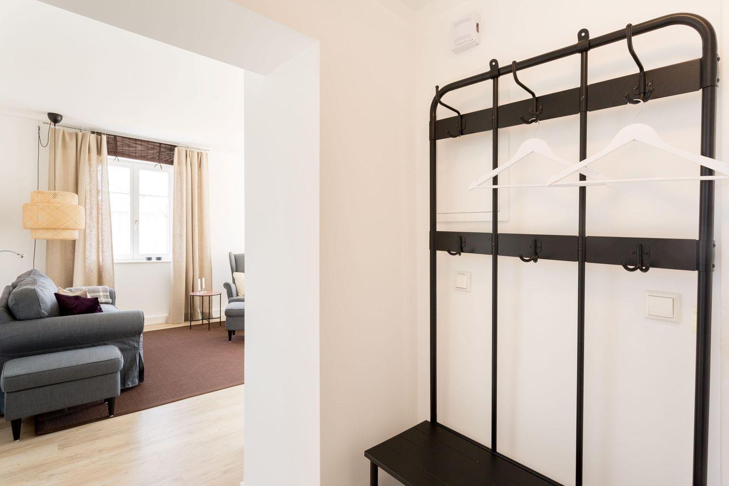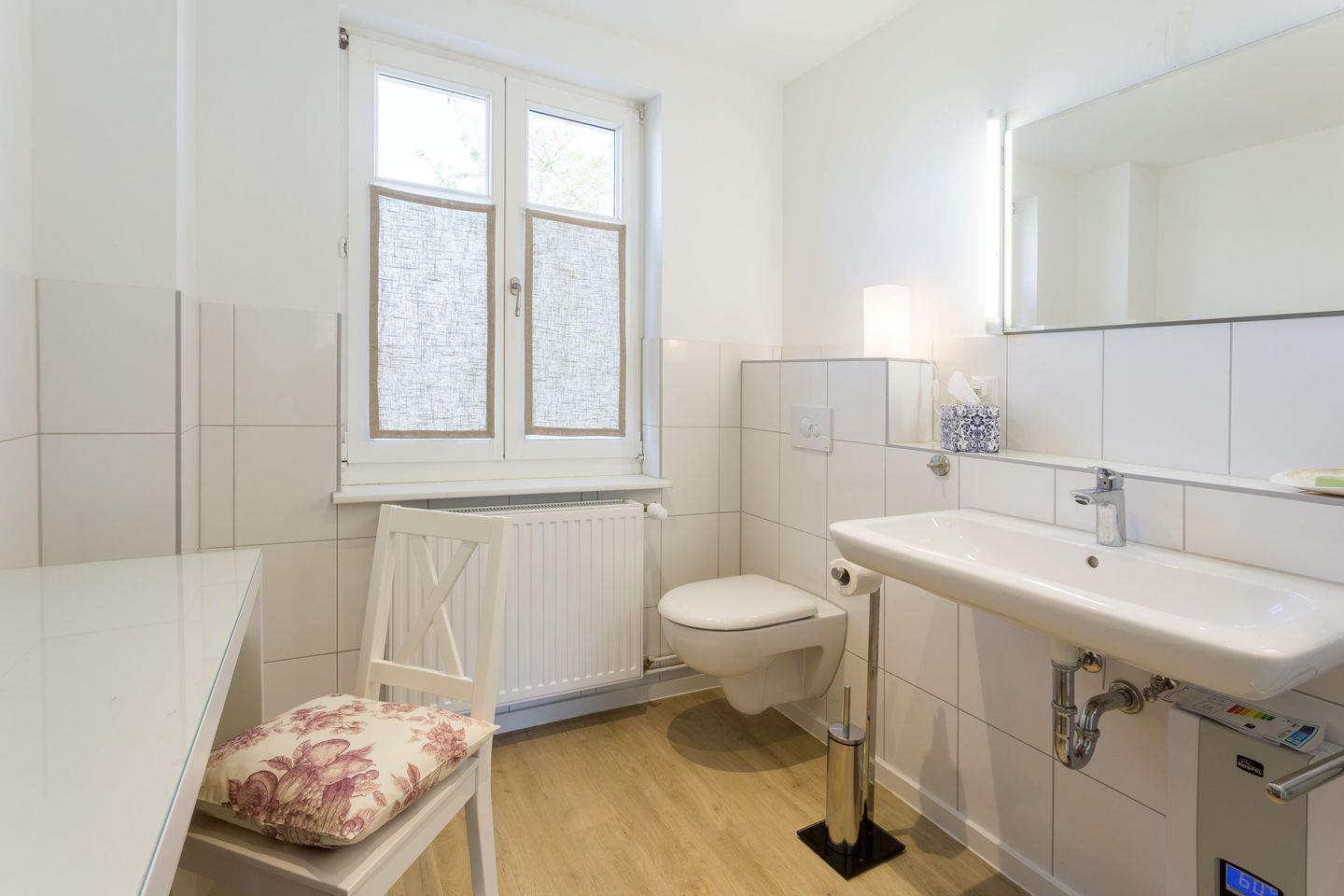"Frl. Hertha" liegt im Erdgeschoss und verfügt durch Fenster auf drei Seiten über besonders viel Licht. Sie erreichen die elegante Wohnung über einen kleinen Flur mit Garderobe; von hier geht auch das große Duschbad ab, das über ein Fenster Richtung Norden verfügt. Rechterhand gelangen Sie in das große