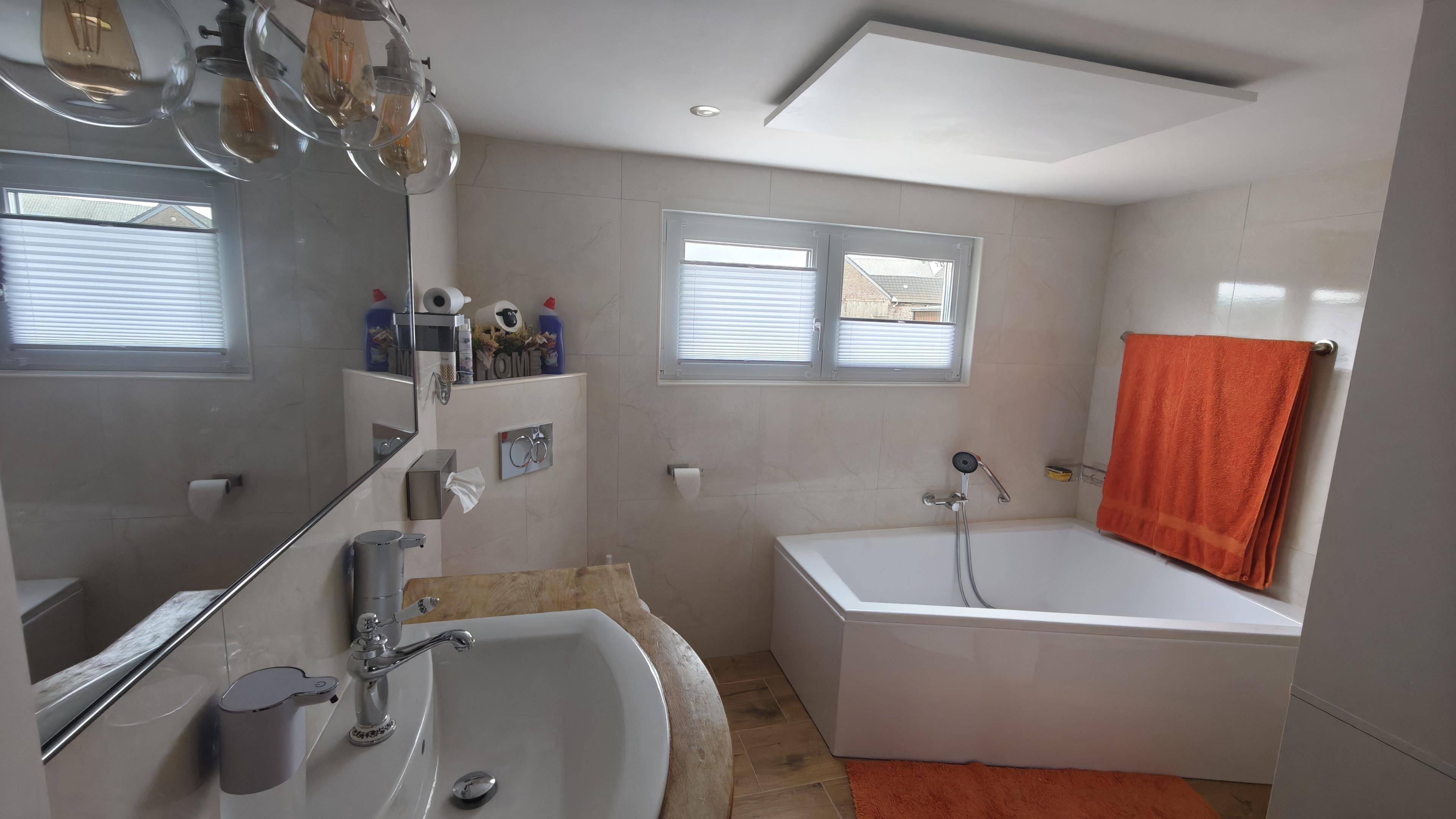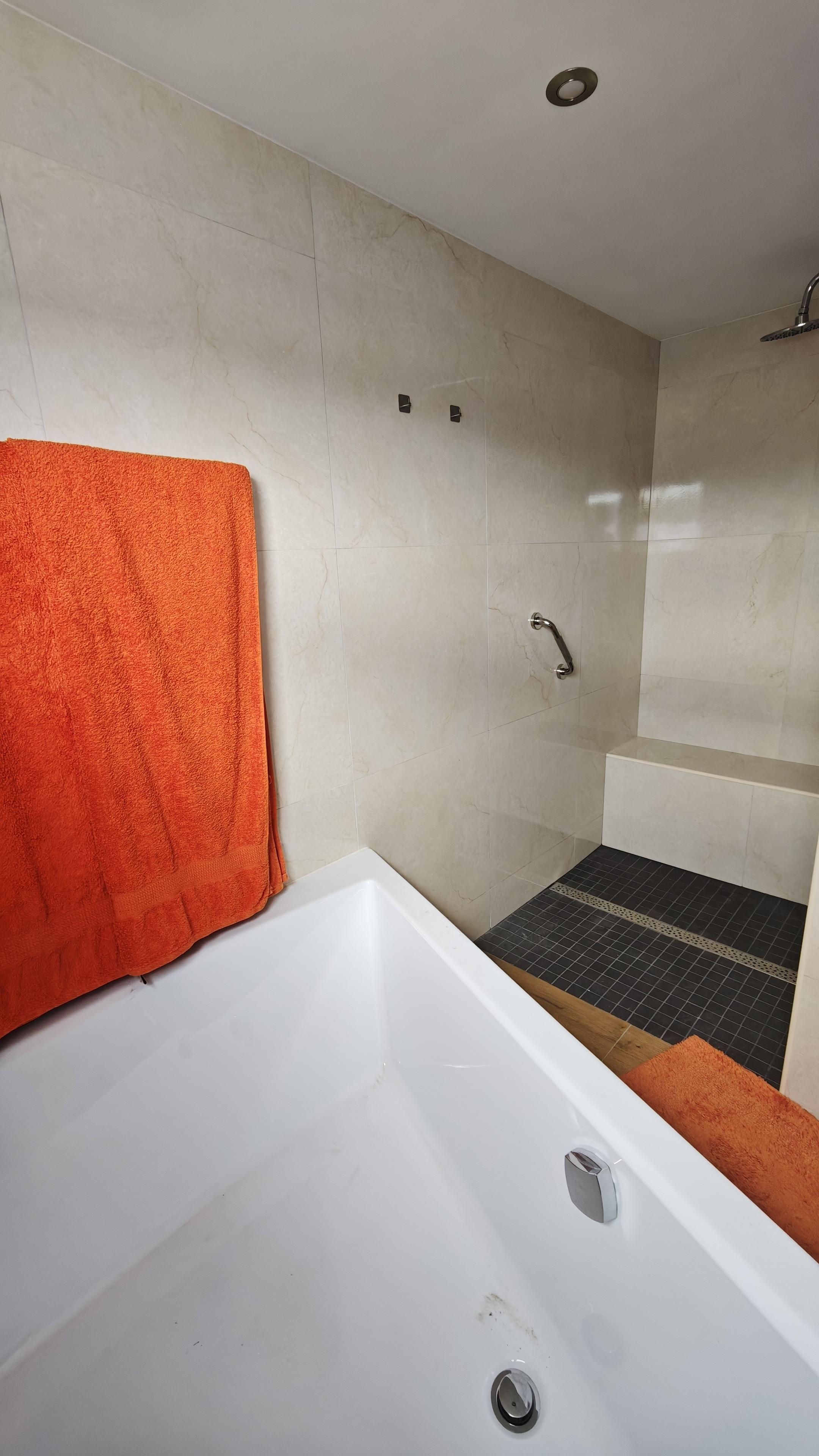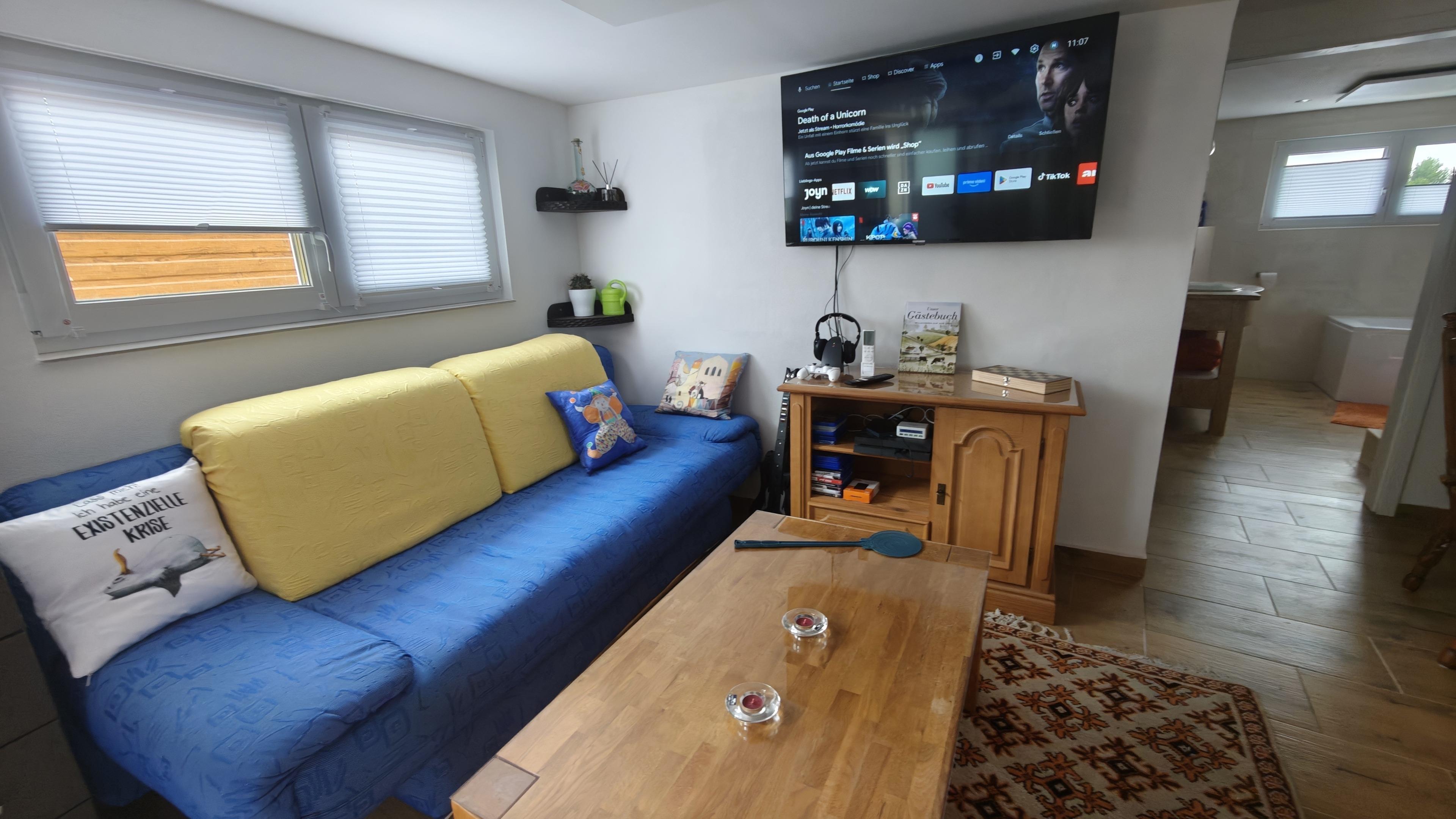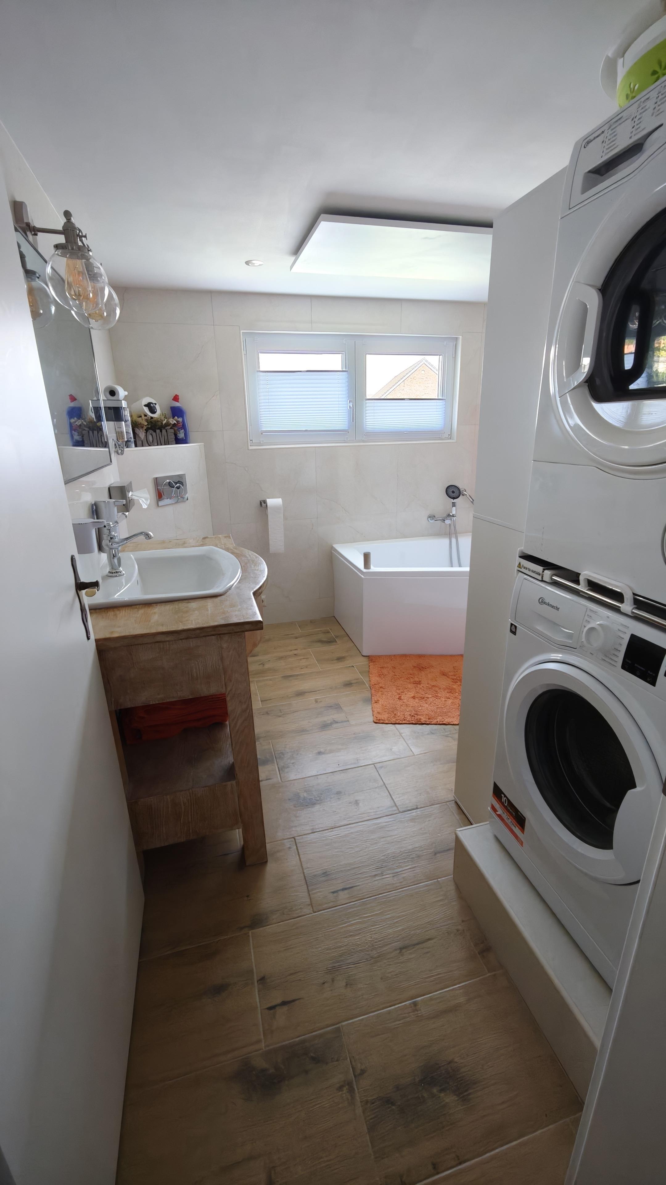 Unser 2025 neu erstelltes Appartement bietet einen Wohn-, Ess- und Schlafbereich, eine komplett ausgestattete Küchenzeile, ein Badezimmer mit WC, Badewanne und begehbarer Dusche sowie eine Waschmaschine und Trockner.