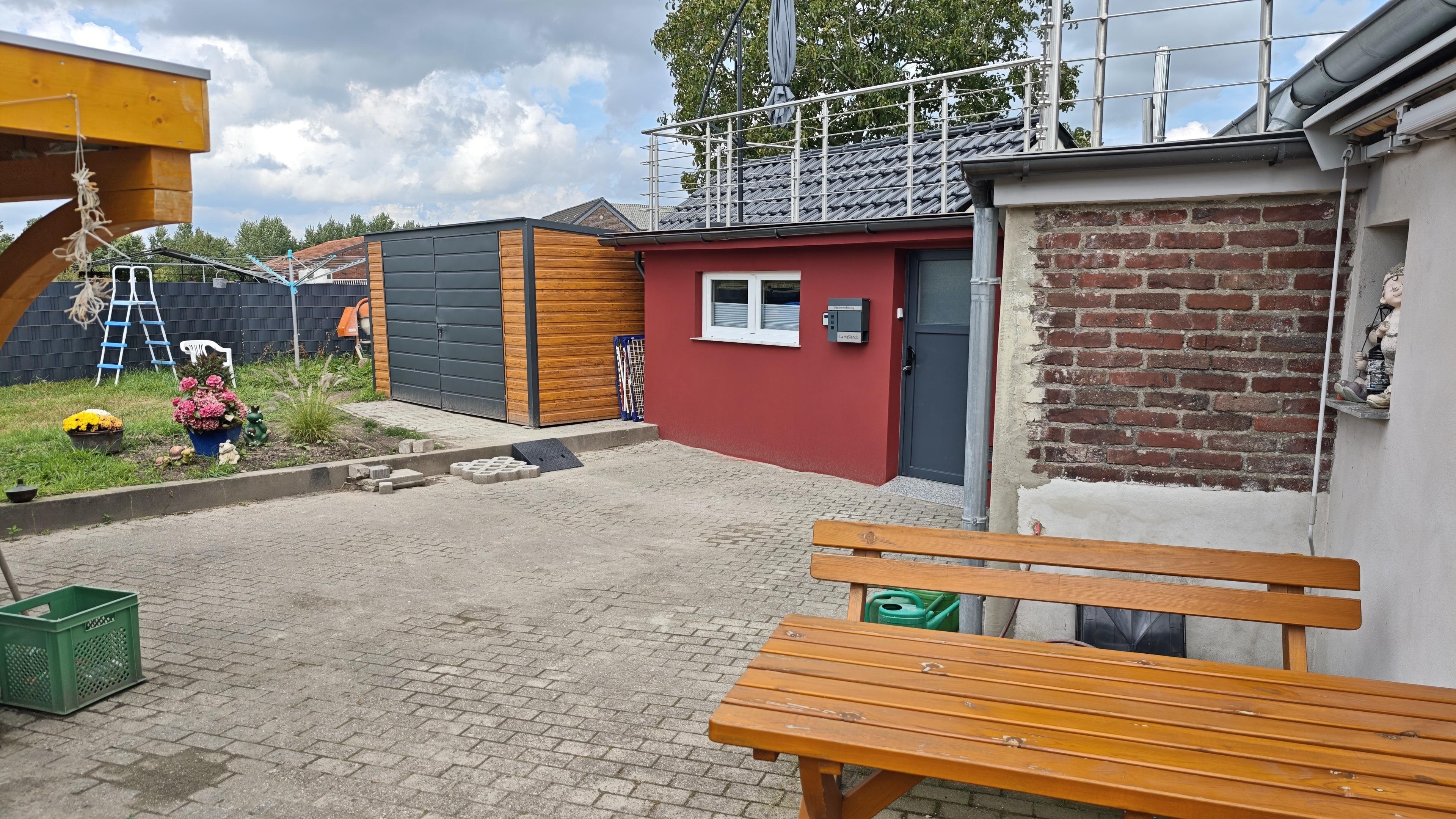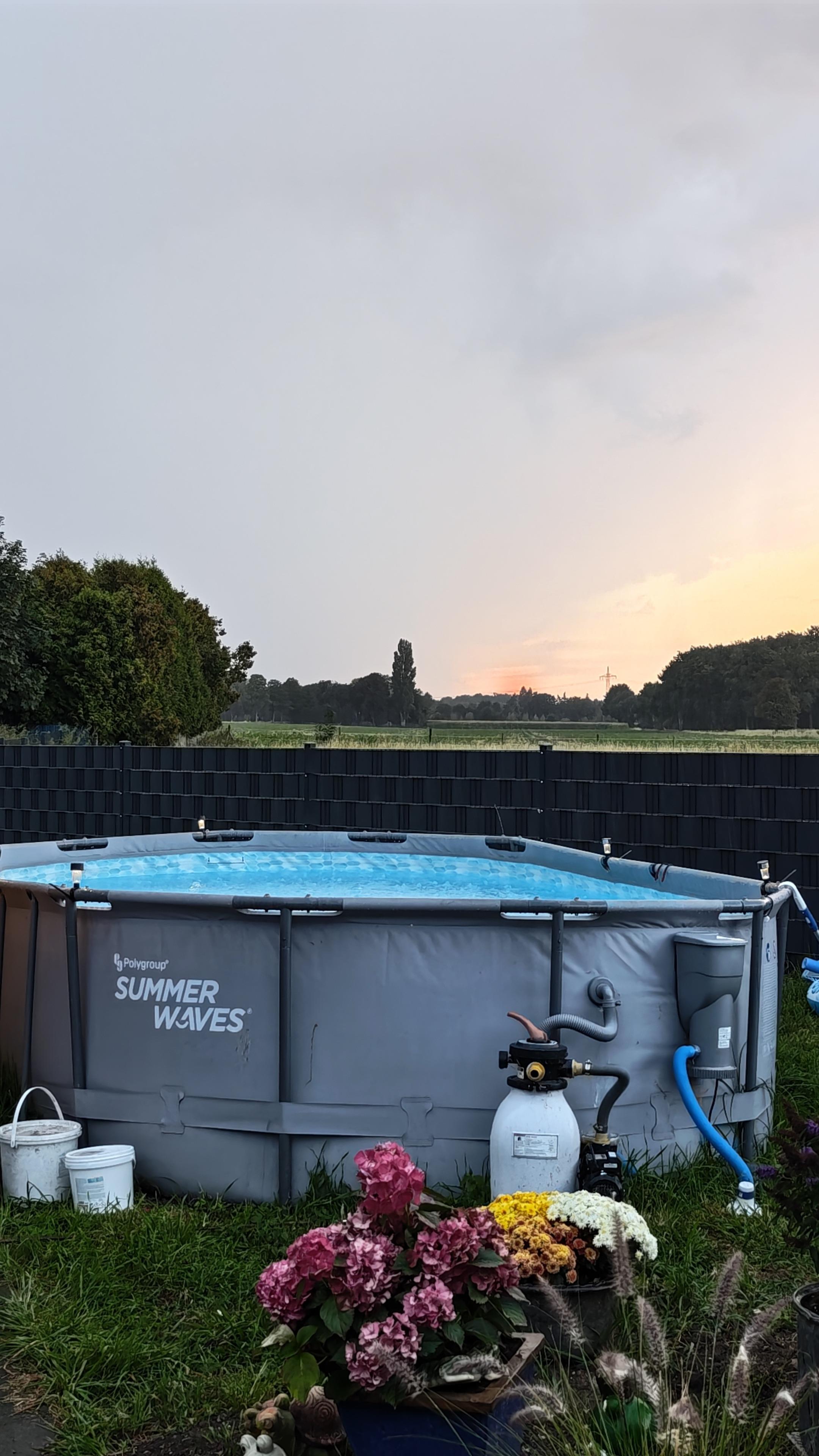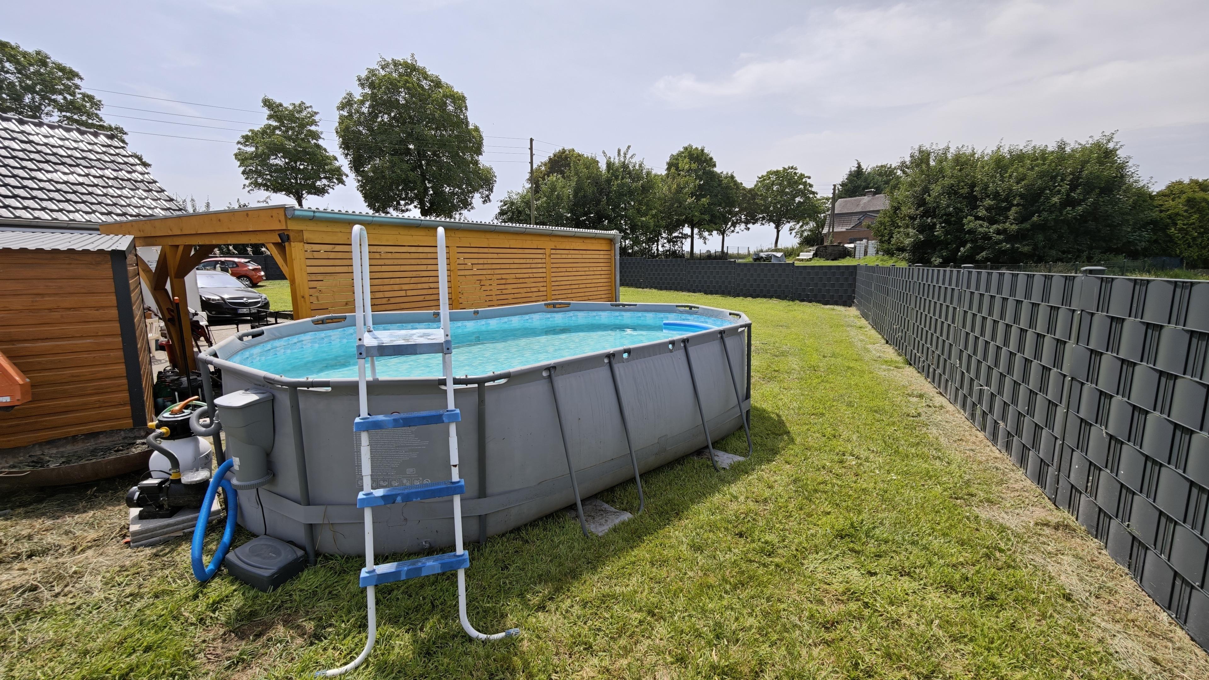 Genießen Sie bei einem Glas Wein den Sonnenuntergang auf der großen Dachterrasse oder springen Sie an heißen Tagen in den Aufstellpool. Für Ihr Frühstück im Freien steht Ihnen ein Tisch mit zwei Bänken zur Verfügung.