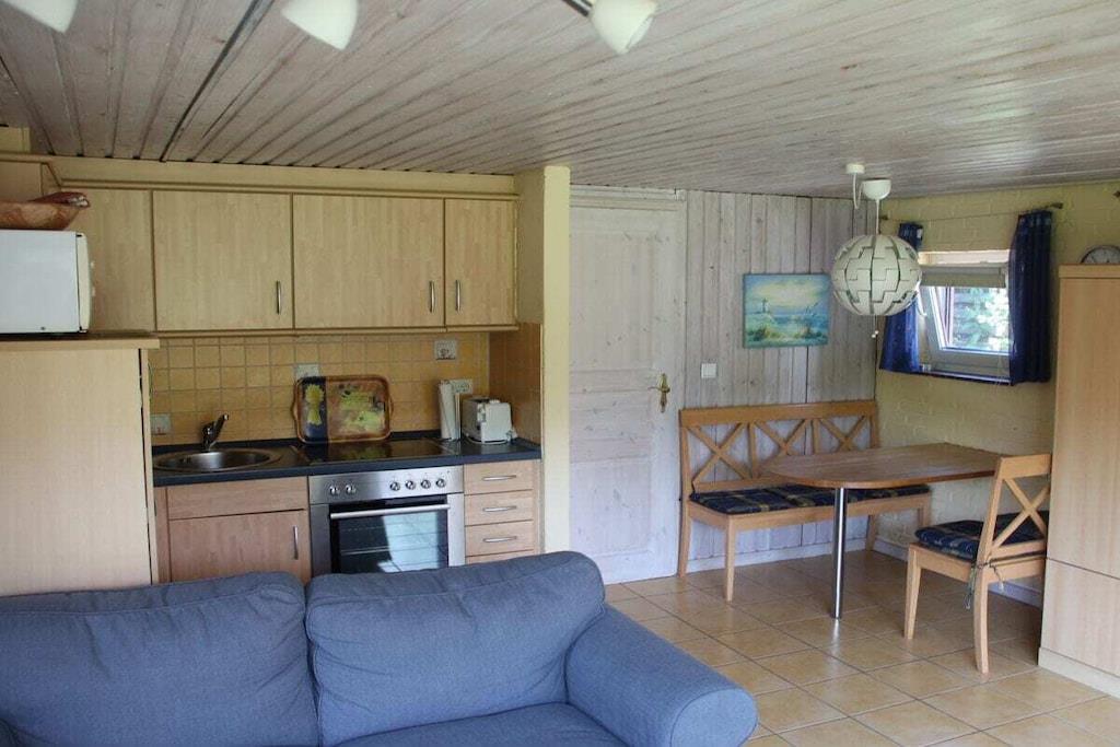 Die Ferienwohnung liegt auf einem ca. 4800 m² großen Grundstück, wovon gut 2.500m² als Spielwiese zur Verfügung stehen. Wohnung 2 (ca. 45 m²) großer Wohnschlafraum mit Essecke und Einbauküche. Kleiner Schlafraum, große Fensterfront zum Garten. Im Wohnschlafraum steht ein hochwertiges Schrankdoppelbett von Nele. Moderne Einbauküche (Heißluftherd mit Ceranfeld, Wasserkocher, Kaffeemaschine, Geschirrspüler, Mikrowelle, Toaster und Kühlschrank mit 3 Sterne Gefrierfach). Die Ferienwohnung hat eine teilüberdachte Terrasse, von der man Zugang zur Spielwiese, dem Spieleraum und auch dem überdachtem Grillplatz hat.